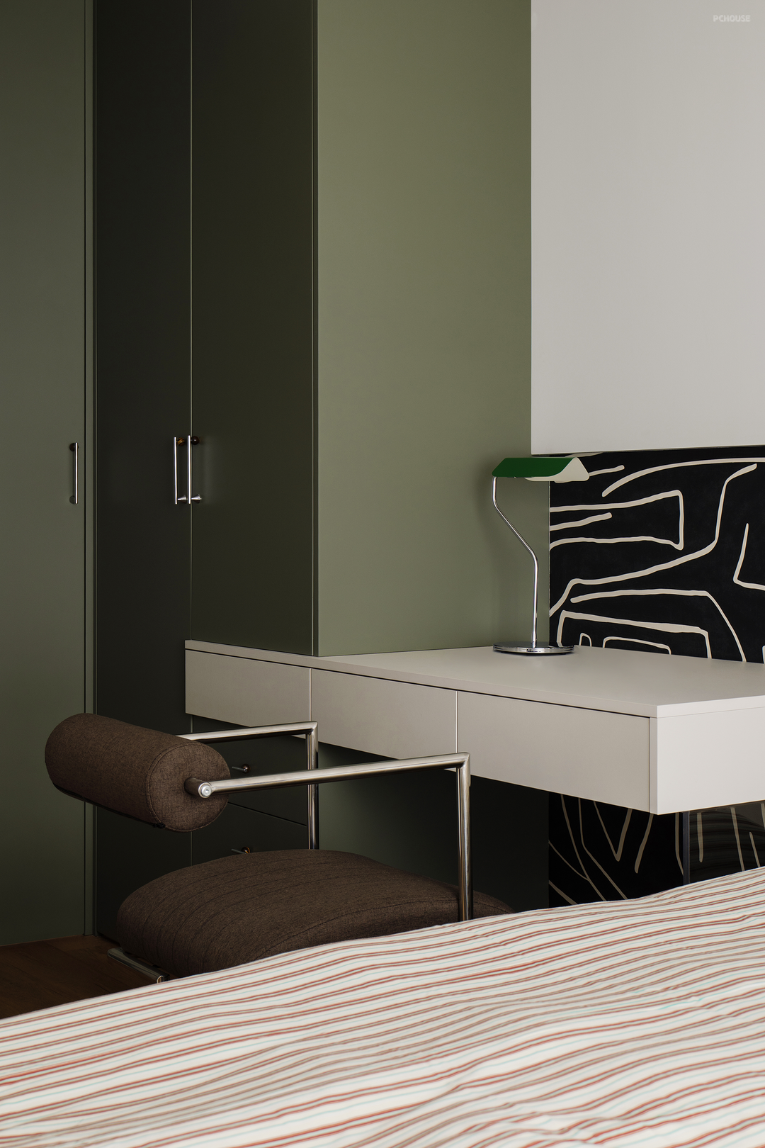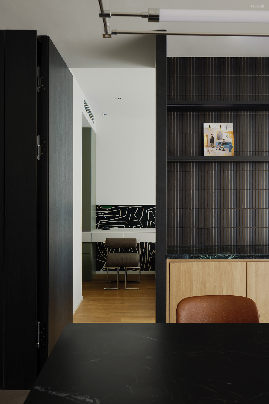 餐边柜用黑色长条砖搭配绿色石材与浅色木质,营造出高级简约感。儿童房入口使用隐形门,使用线性加长风口,转角处理成弧形。考虑到空间的每一个细节,才会有干净高级的表达。