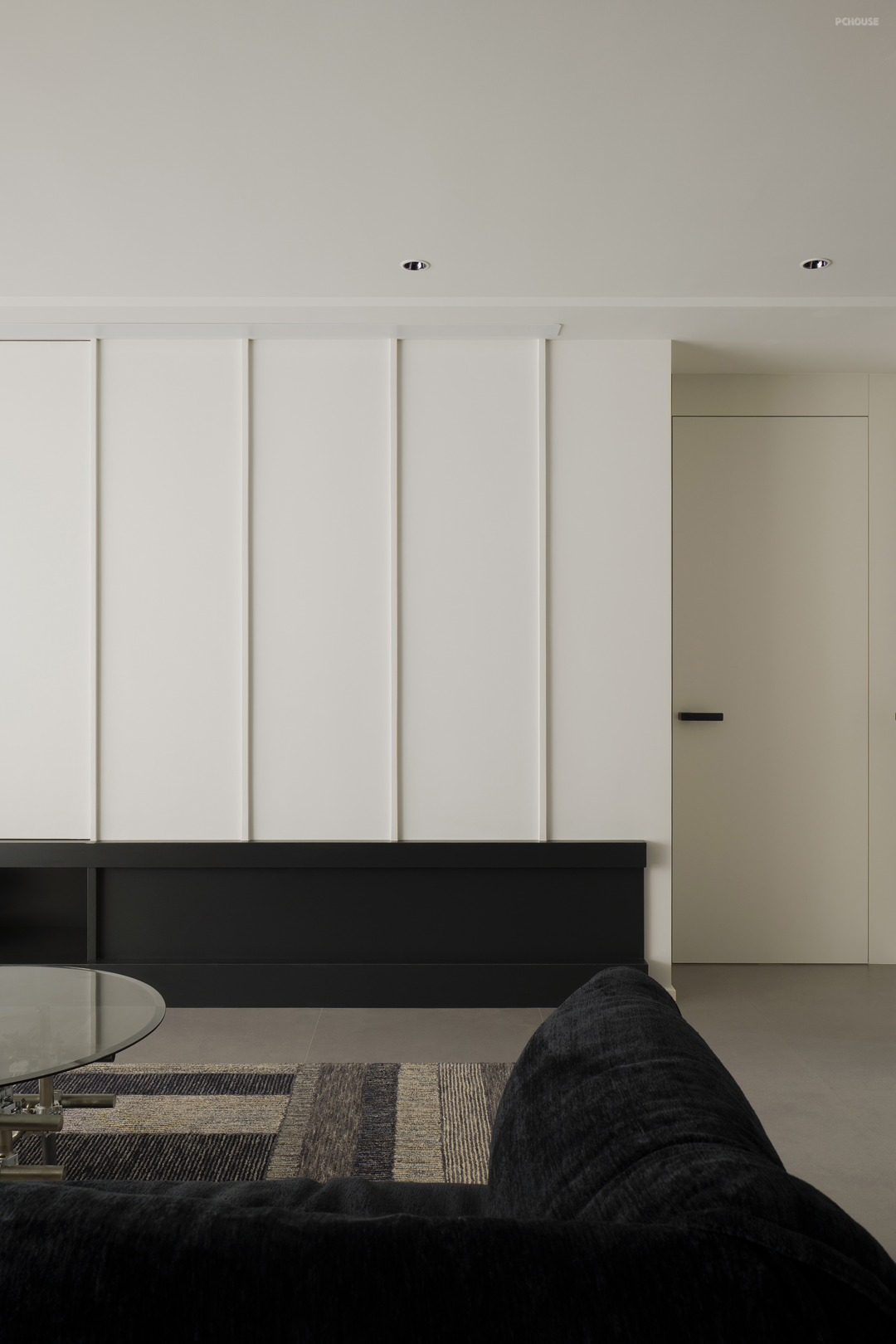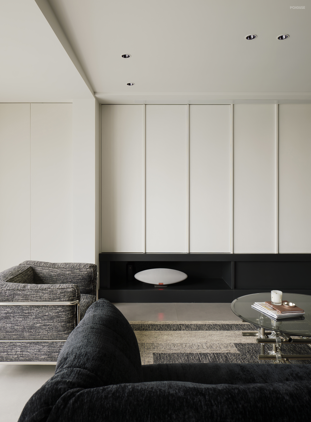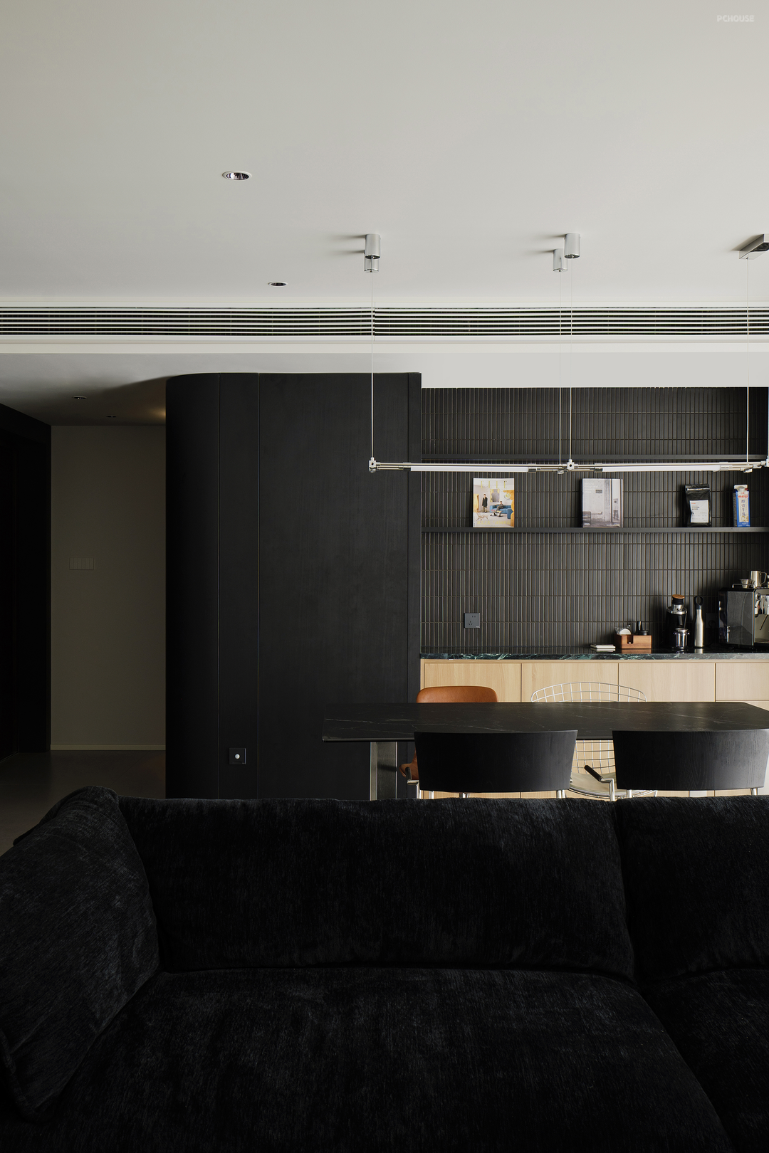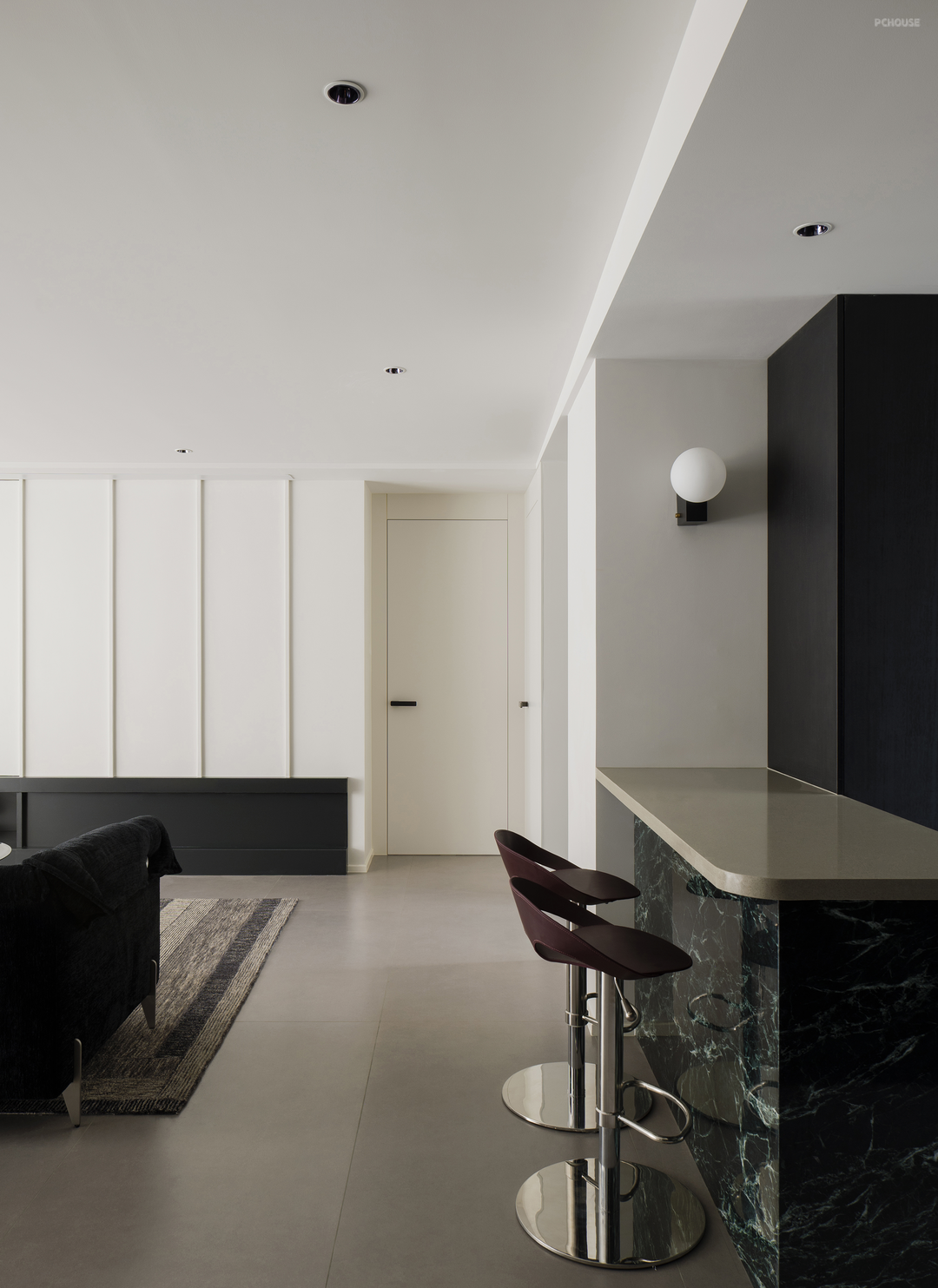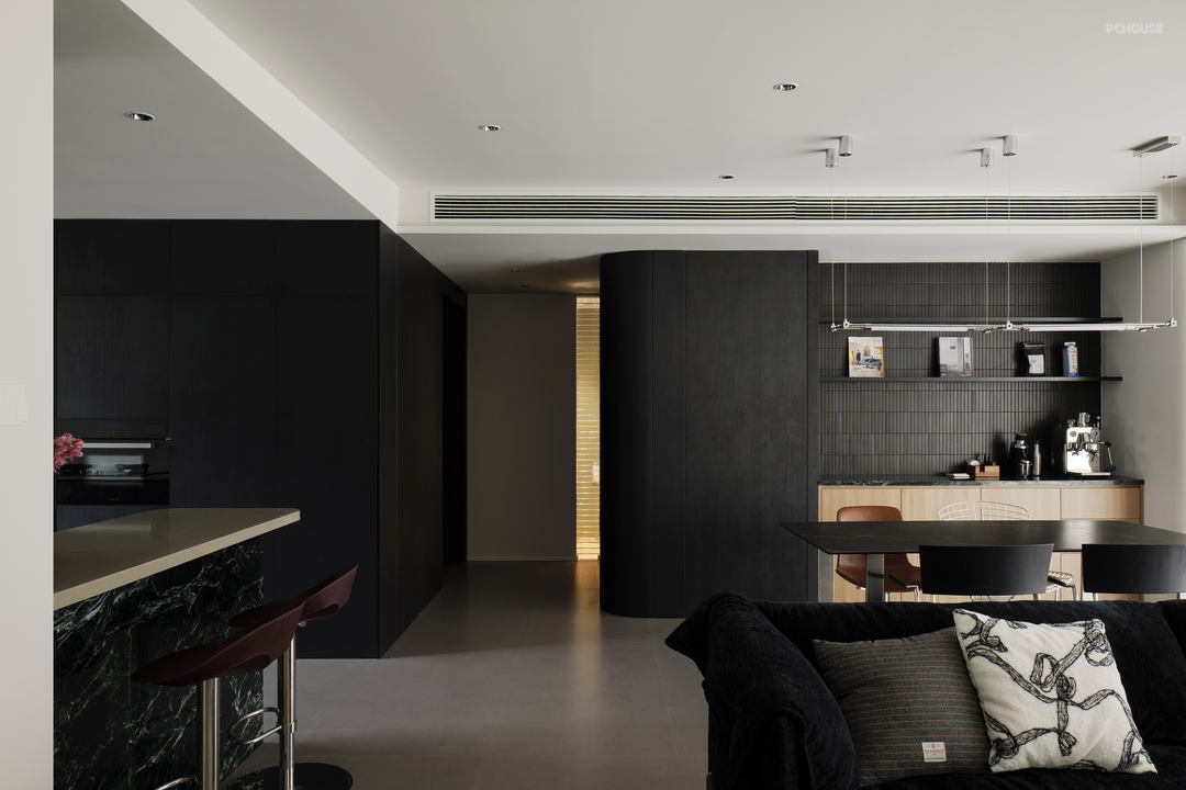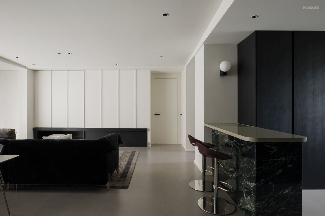 黑色在柔和地旋转,像一首圆舞曲。黑色,是这个家毫无疑问的重音,石材与木质随之点缀。白色留给空间框架——细微处的结构调整,会大大提升居住体验。不向标签化投降,最终有了这个简单纯粹,又不失温柔细腻的黑白灰之家。