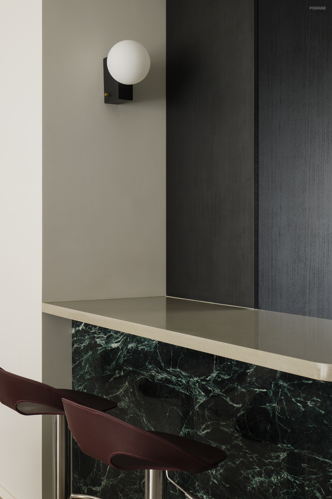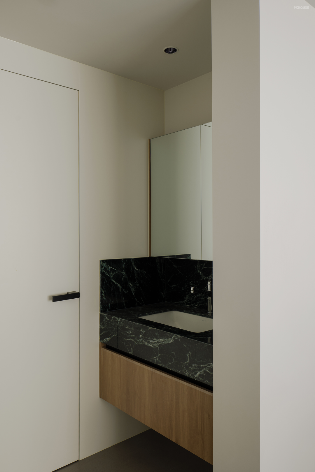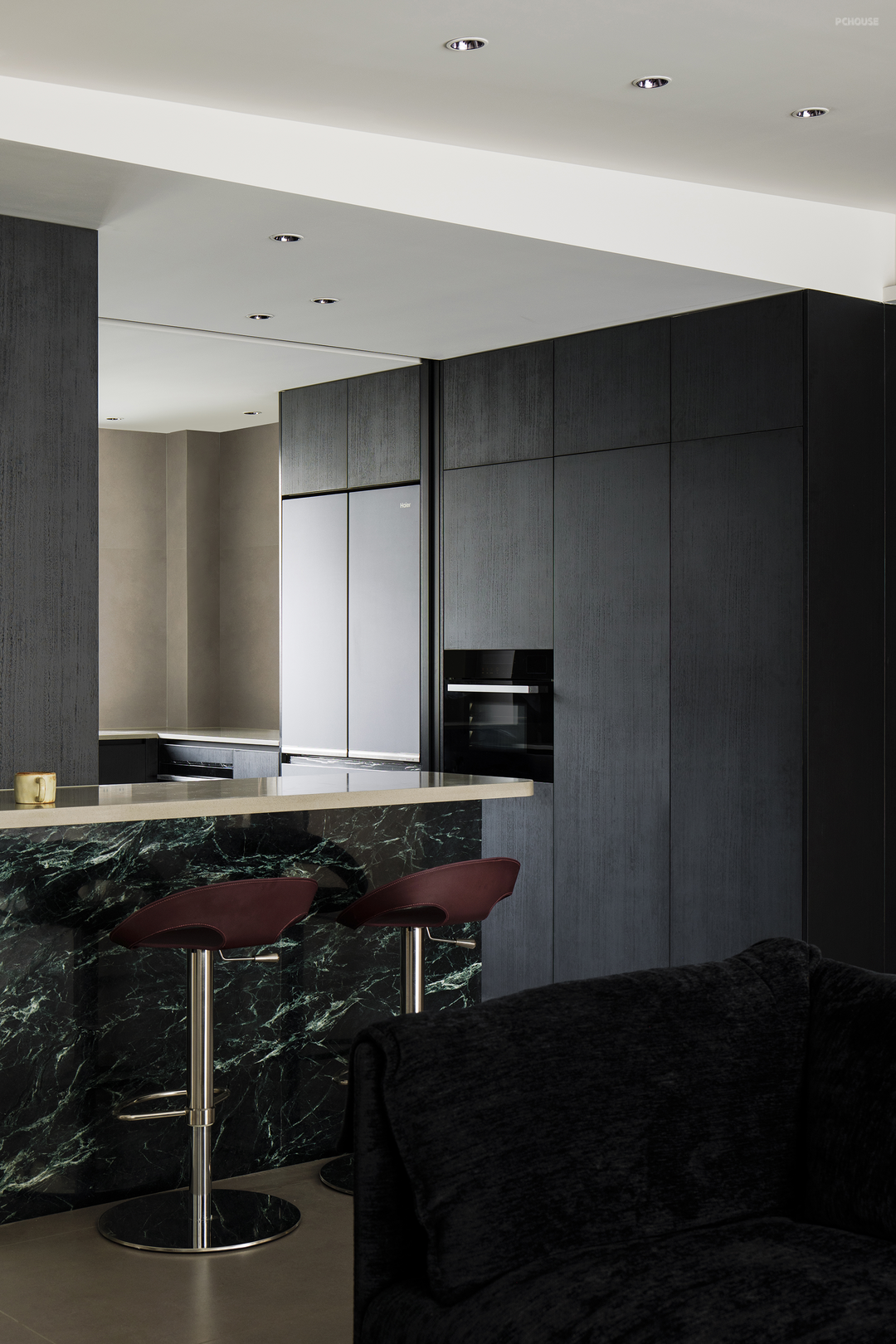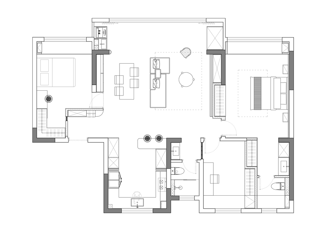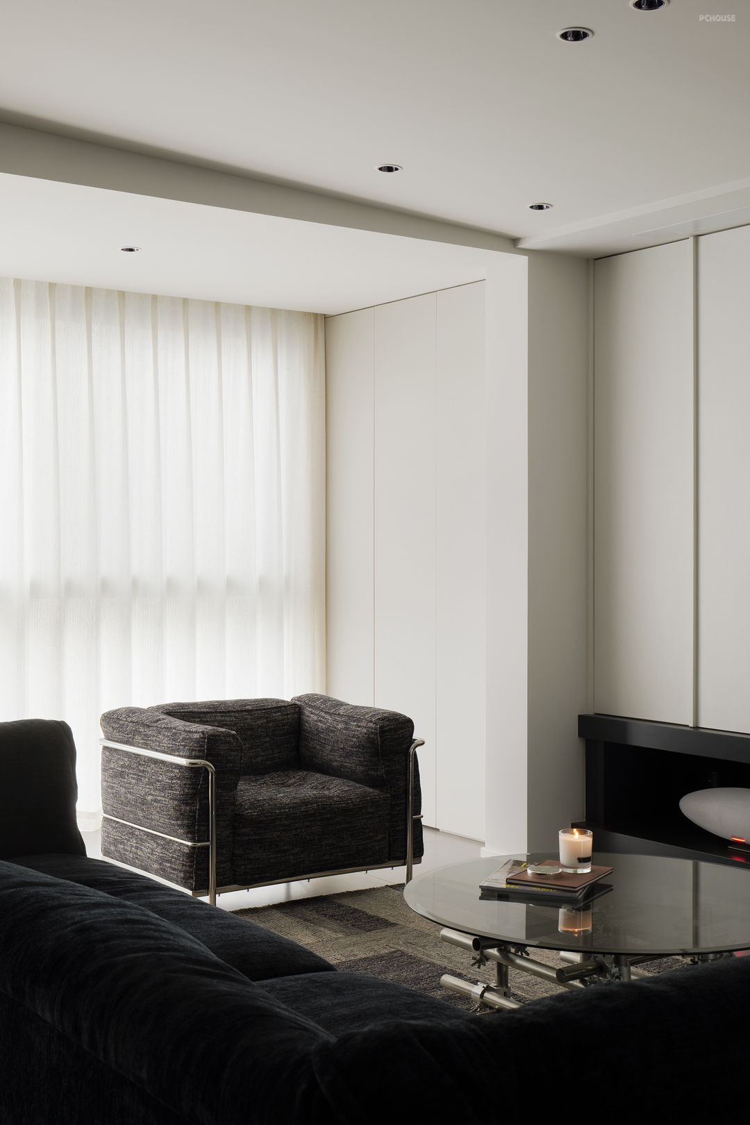 黑色在柔和地旋转,像一首圆舞曲。黑色,是这个家毫无疑问的重音,石材与木质随之点缀。白色留给空间框架——细微处的结构调整,会大大提升居住体验。不向标签化投降,最终有了这个简单纯粹,又不失温柔细腻的黑白灰之家。