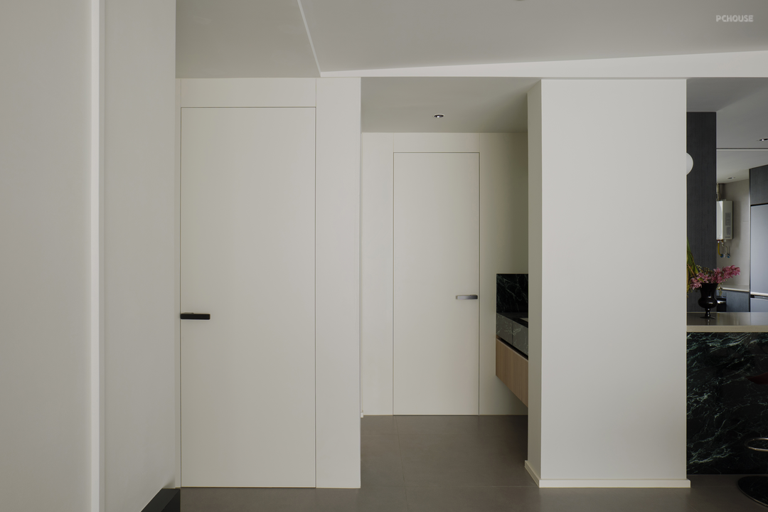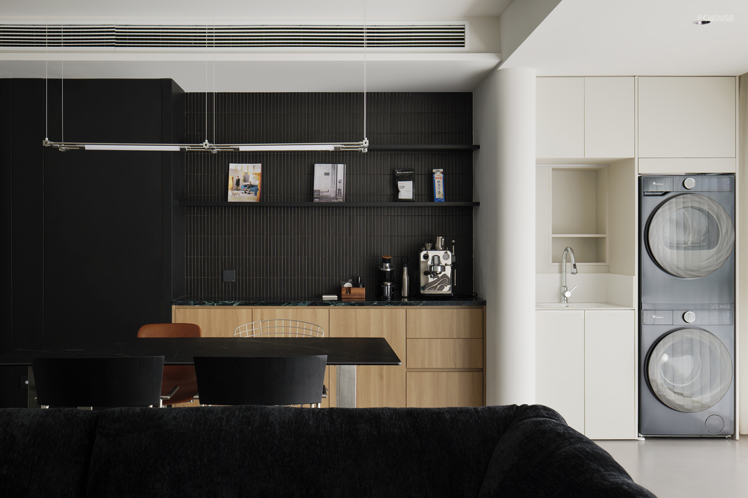 厨房采用无主灯设计,增添吊轨移门,轨道与门框选用黑色,视觉上统一、高级。要想厨房好用,操作空间与储物空间都要充足,几组顶天立地柜,提供充足的储物空间,并整合冰箱与小电器,干净简约。