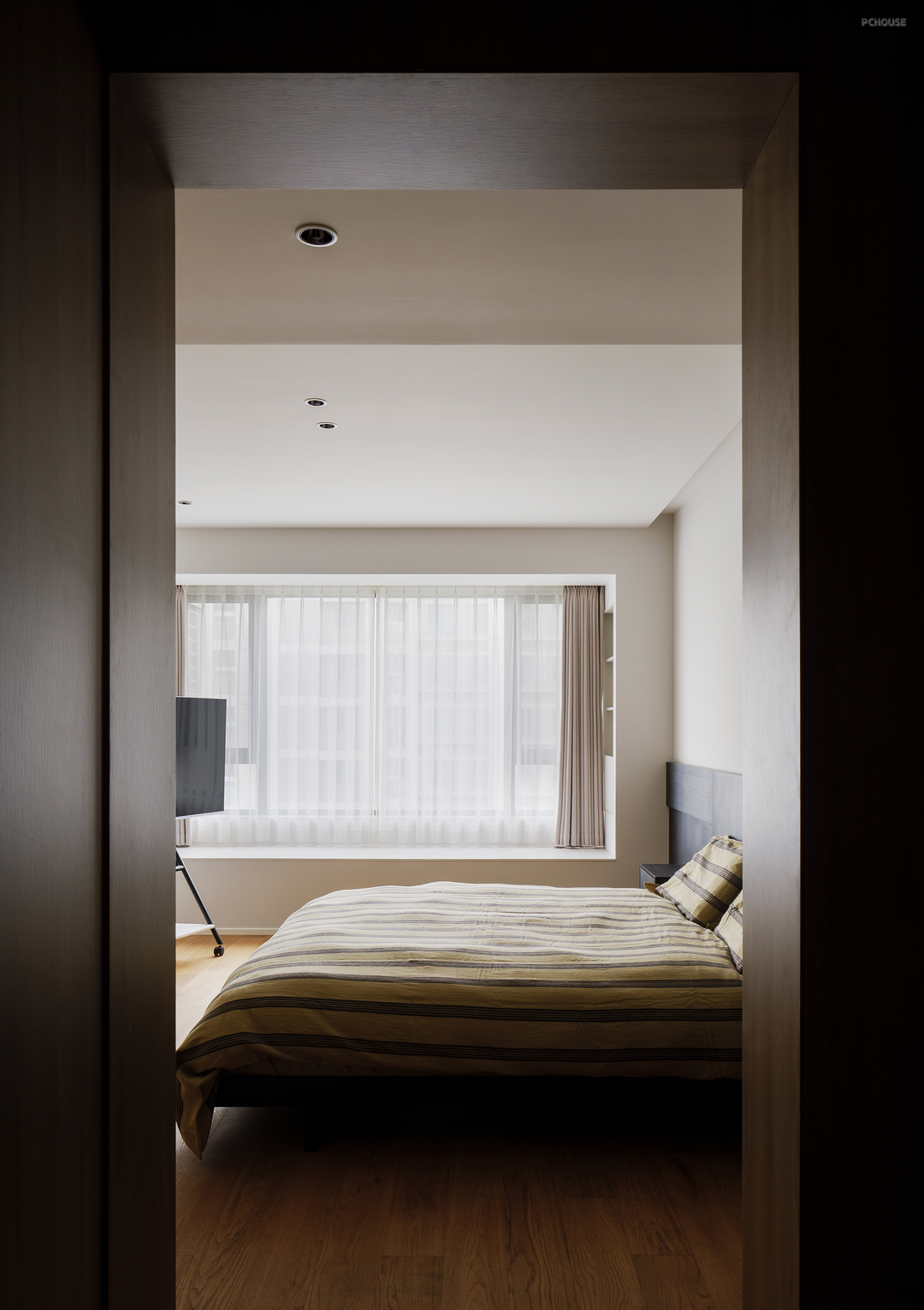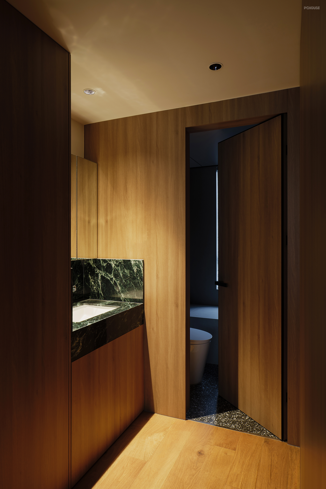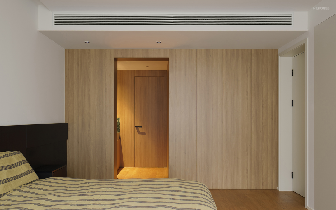 在这里,我们将床尾与干区,向客厅与书房推出,增添储物空间,扩充过道。干区开放,大面积木饰面增添温润的自然氛围。