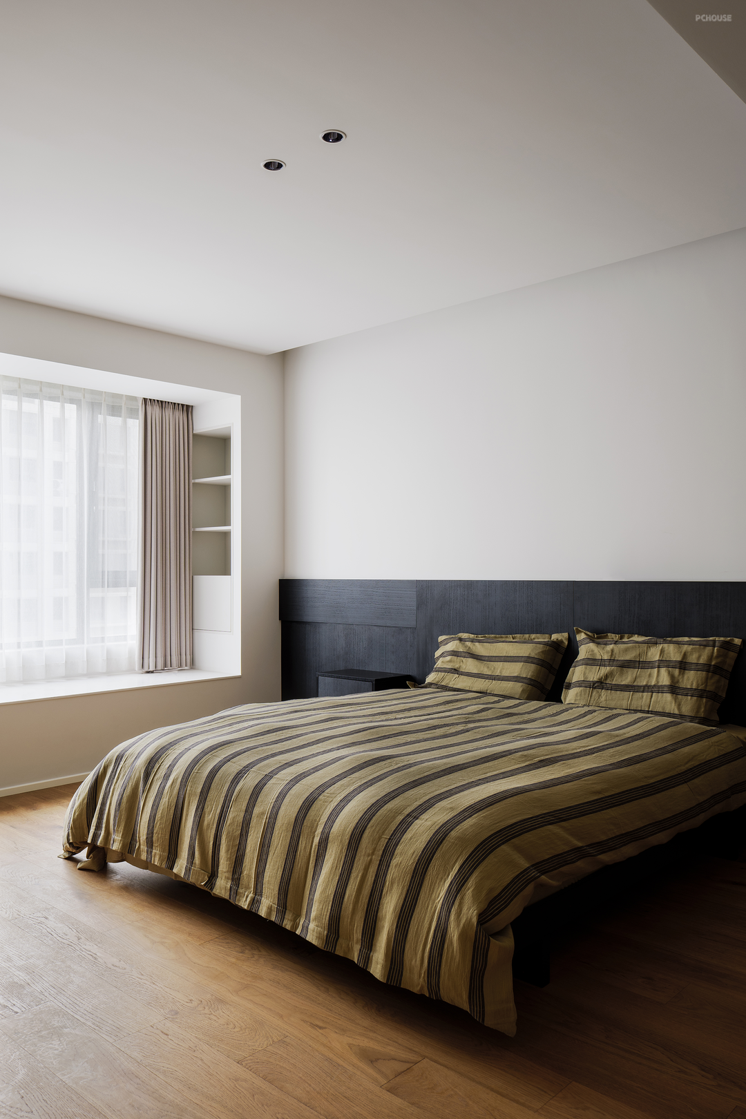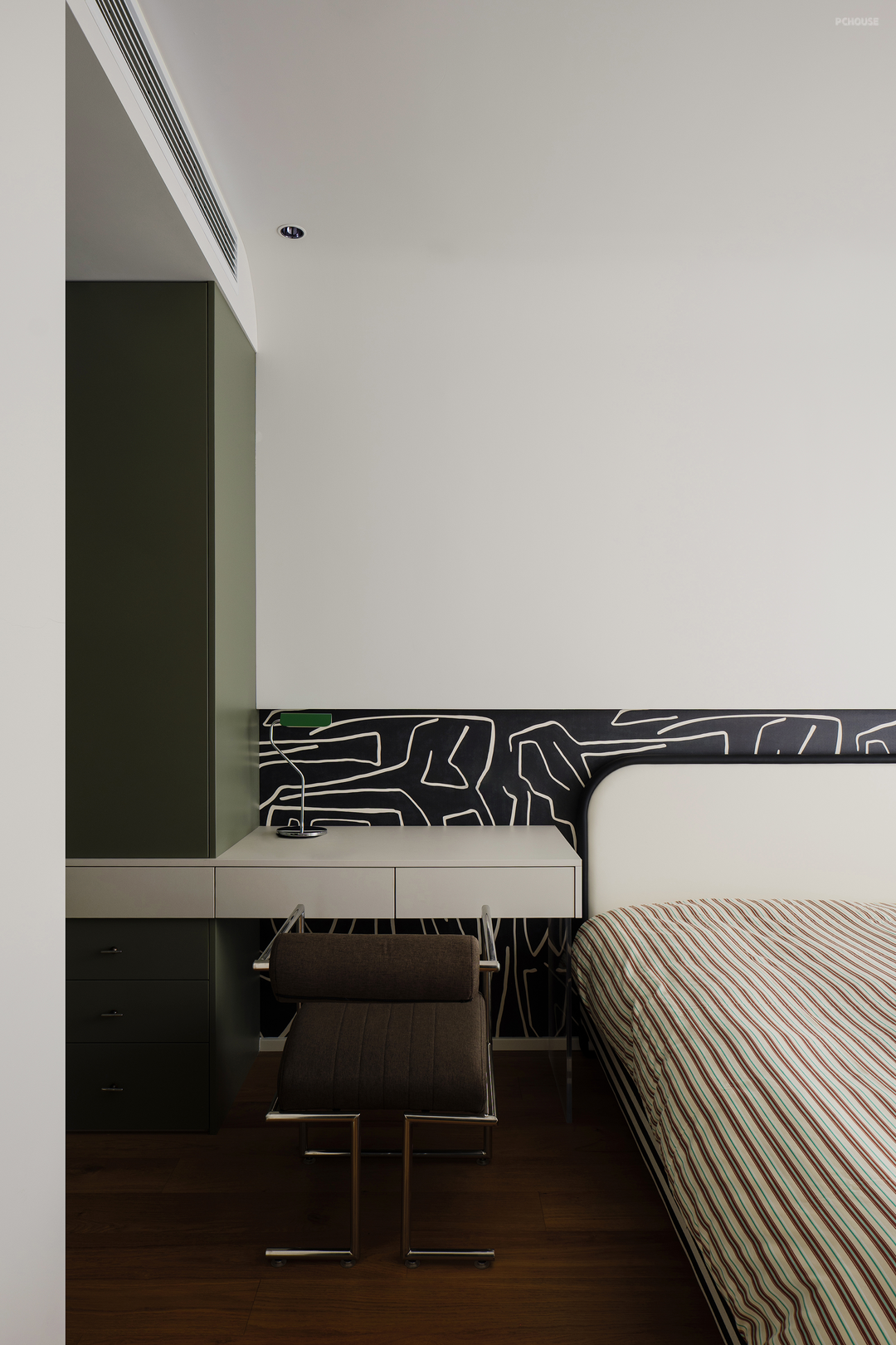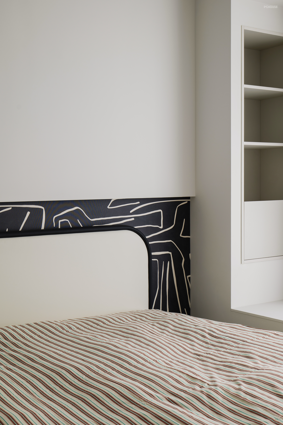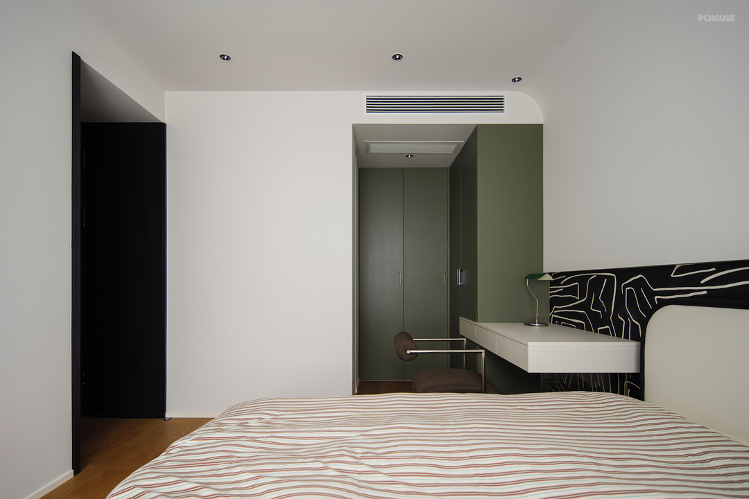 床头不做靠背,定制造型衔接同色系悬浮柜,黑白分明,层次递进。用减法增添卧室的舒适度。