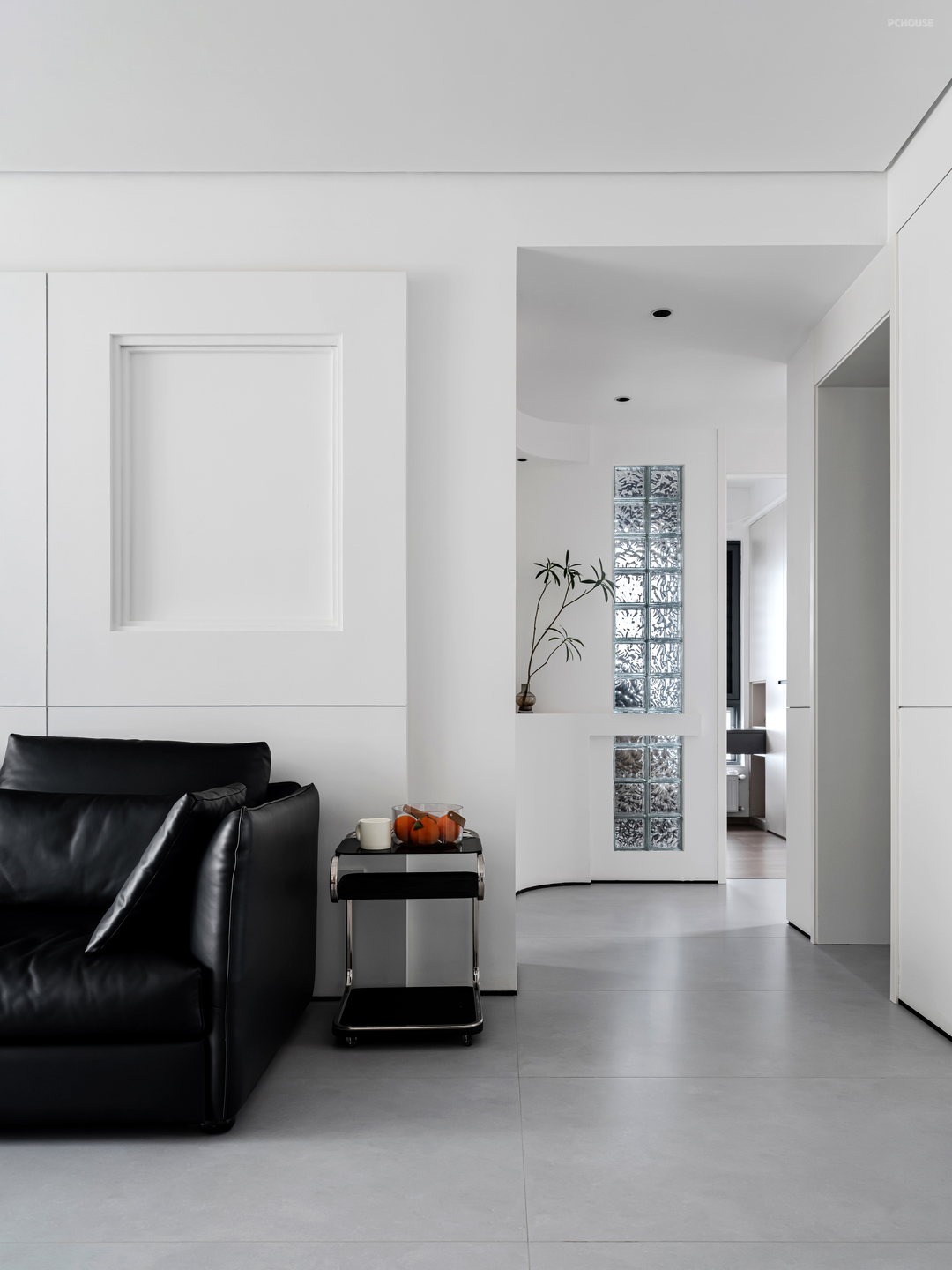 沙发背景未做太多的色彩,而是运用了墙面的进退手法打造不寻常感,加上墙面的勾缝工艺,让白墙也有了艺术感。