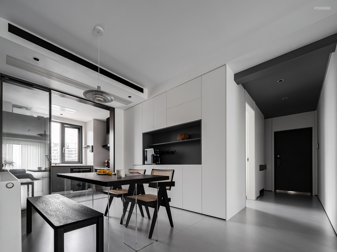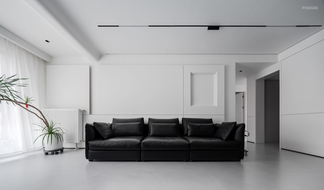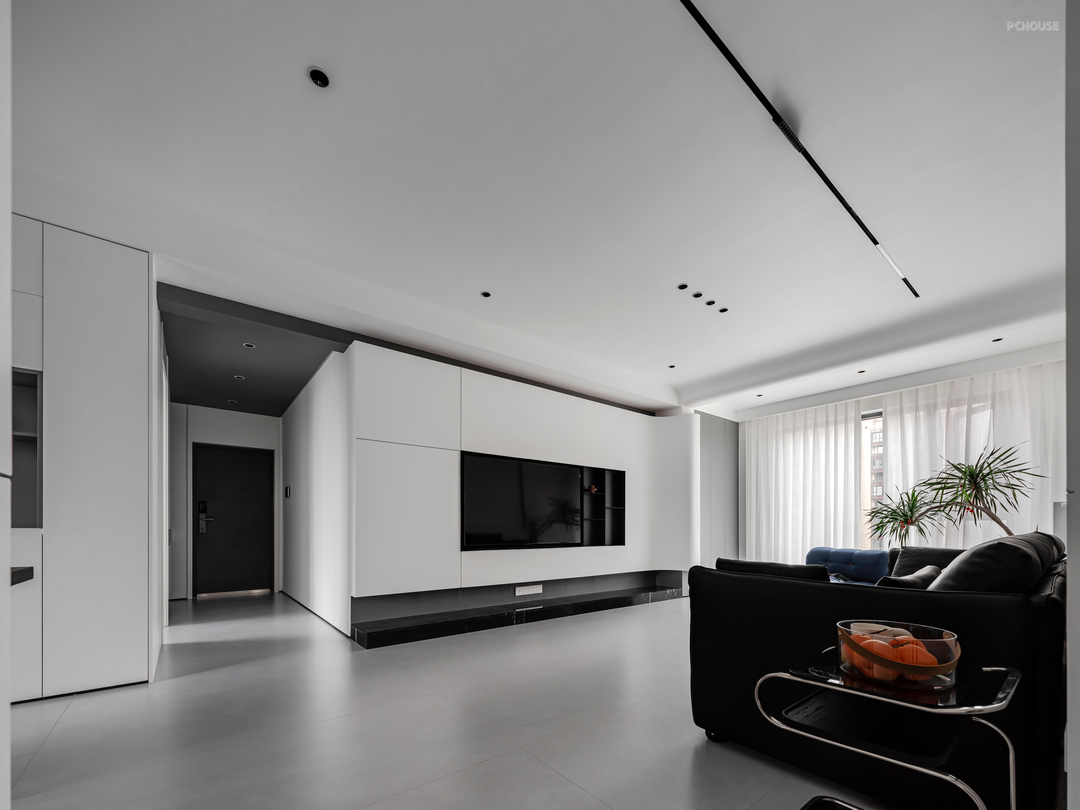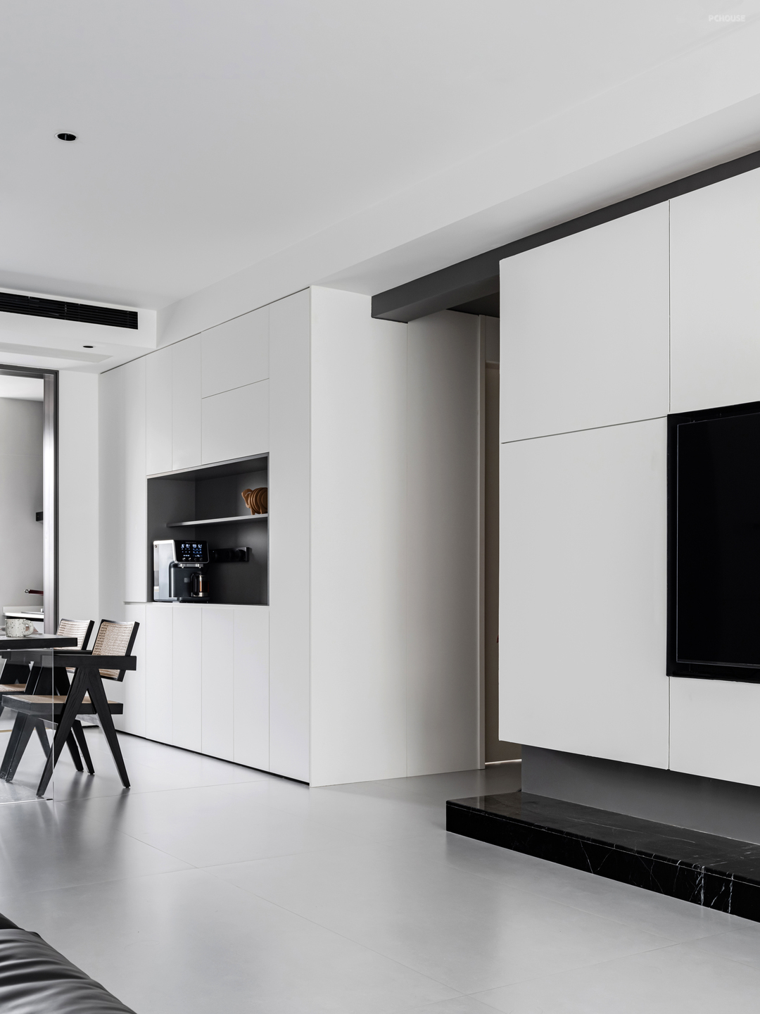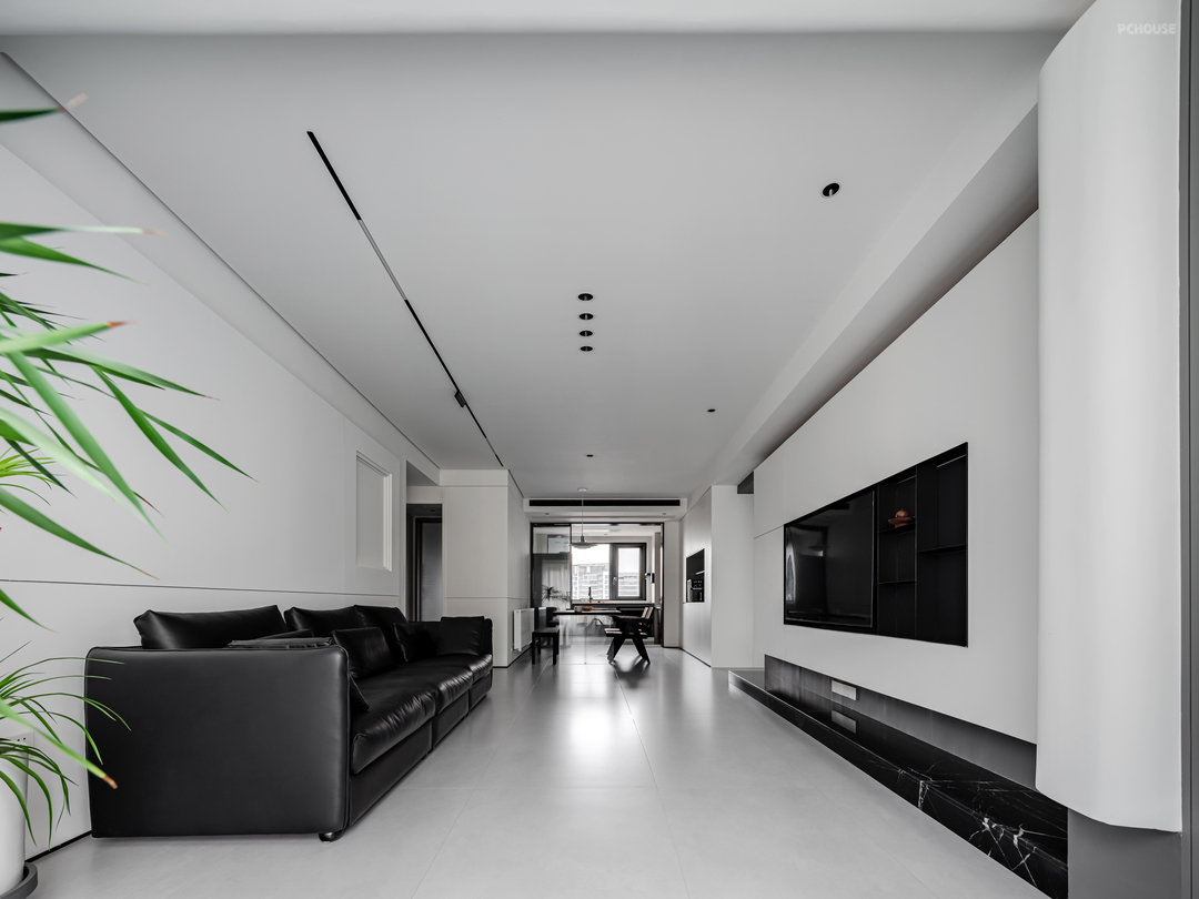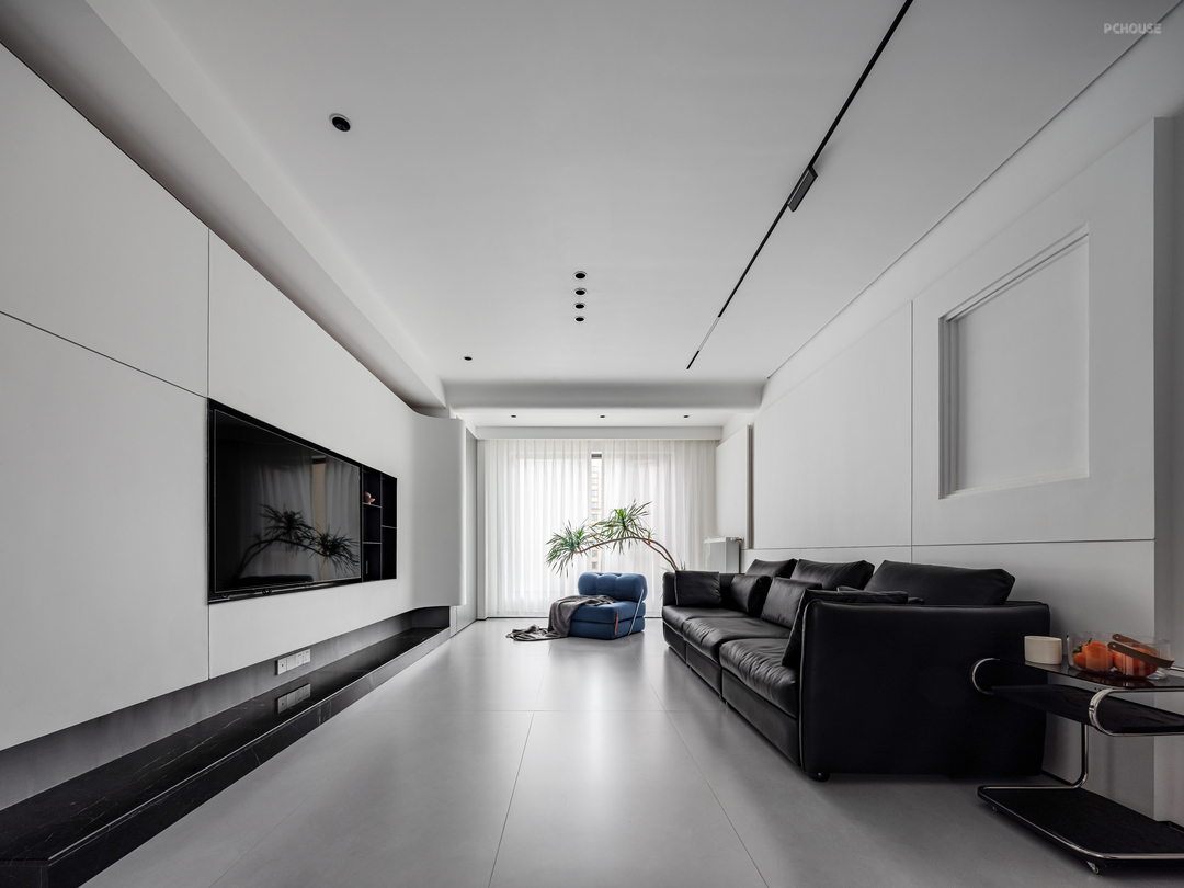 客厅的空间采用了黑白的色彩搭配,这种经典的色彩组合为空间营造了一种沉稳而有力的对比感。黑白二色在视觉效果上具有出色的表现力,不仅突显了空间的现代简约风格,还通过强烈的对比使空间显得更加开阔。