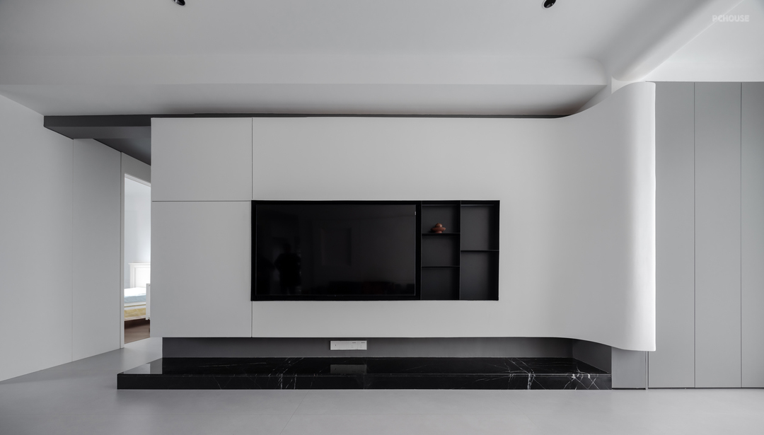 电视背景墙与承重墙紧密相连,这种结构设计不仅增强了空间的稳定性,而且在立面设计上进行了精细的处理,实现了视觉的连贯性和延伸。