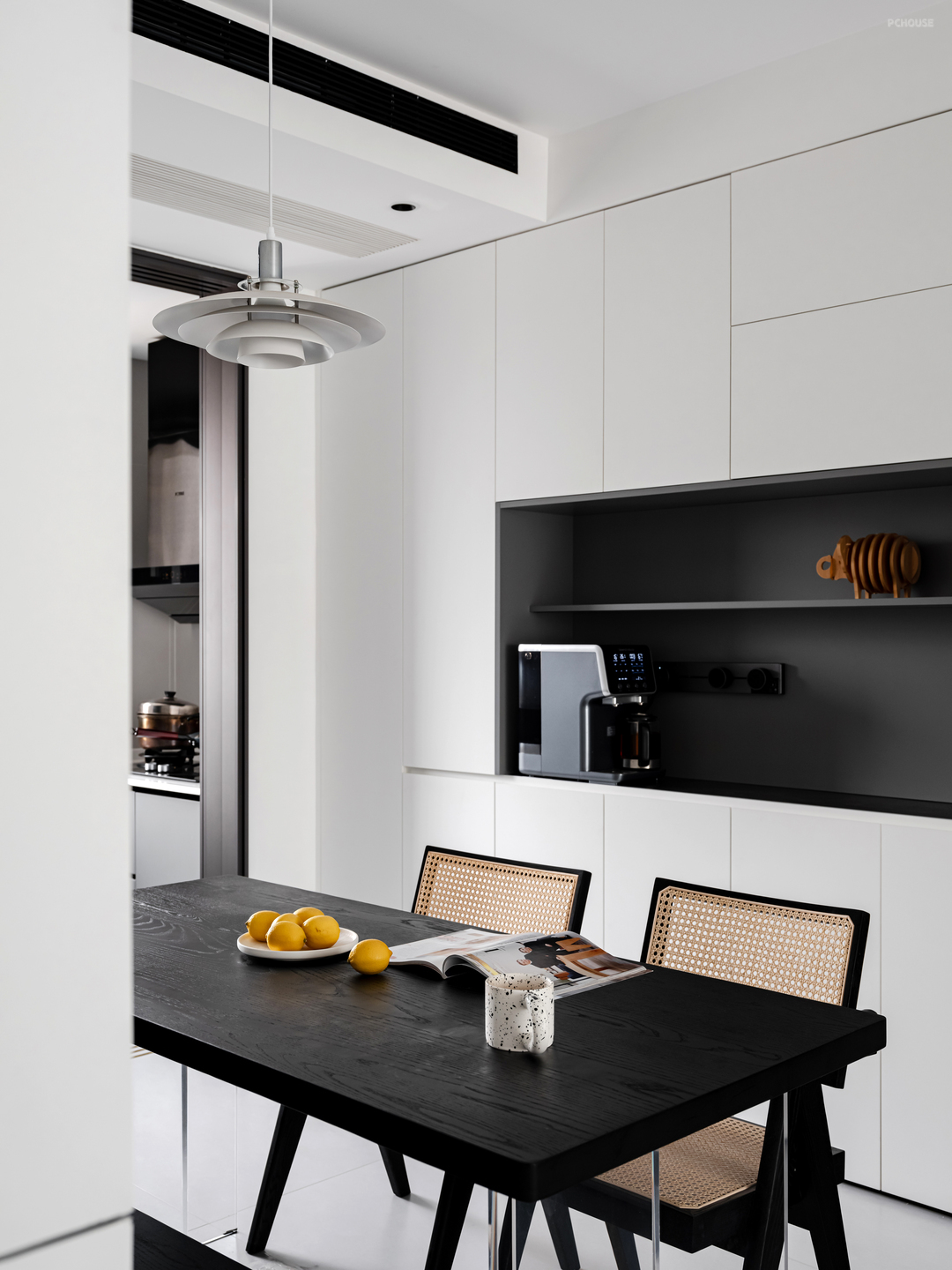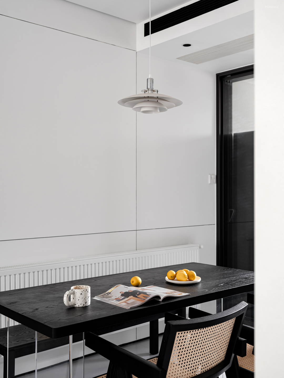 餐厅的装饰色调以黑色为主,这种色彩的运用不仅让整体空间显得稳重而内敛,更重要的是,它有效的将视线焦点引导到餐桌的主题元素上。黑色的背景为其他装饰和摆设提供了鲜明的对比,使它们更引人注目。