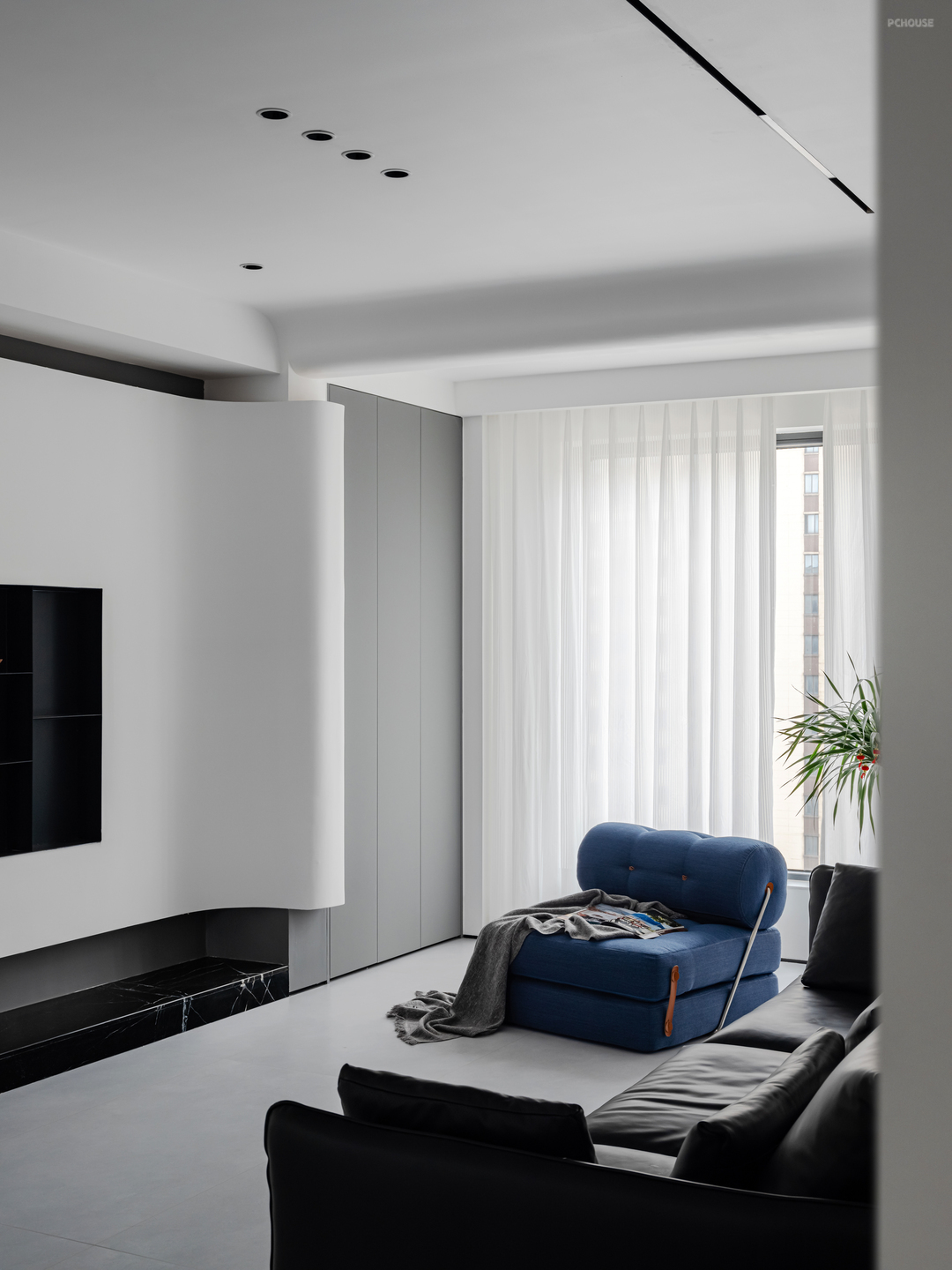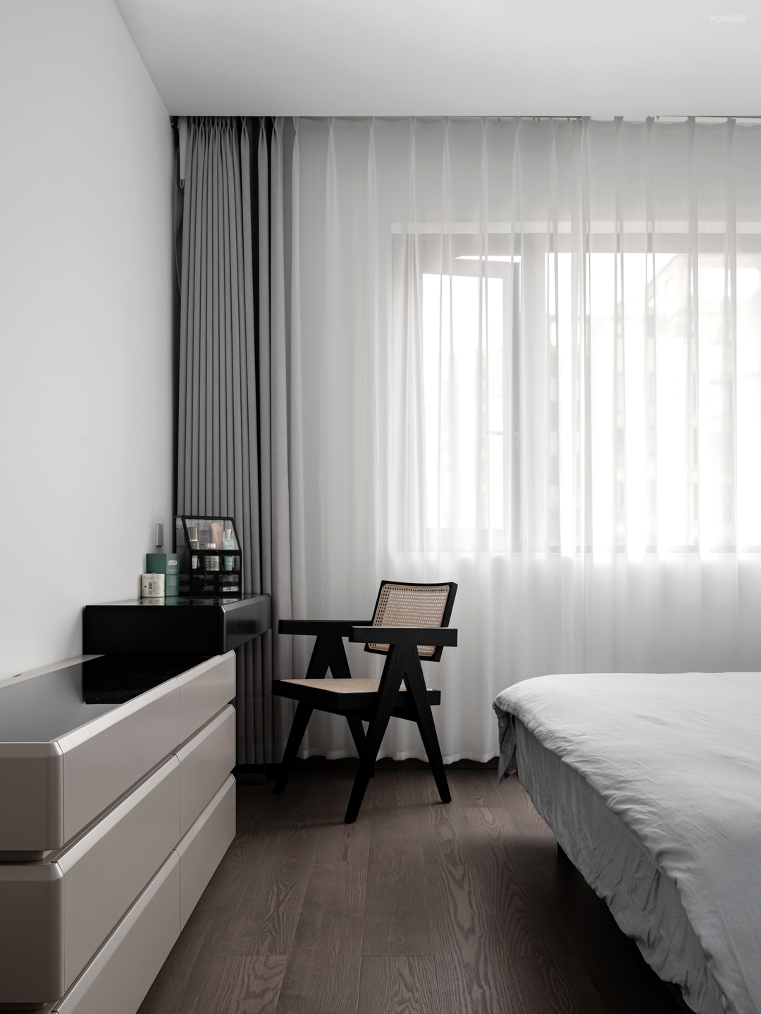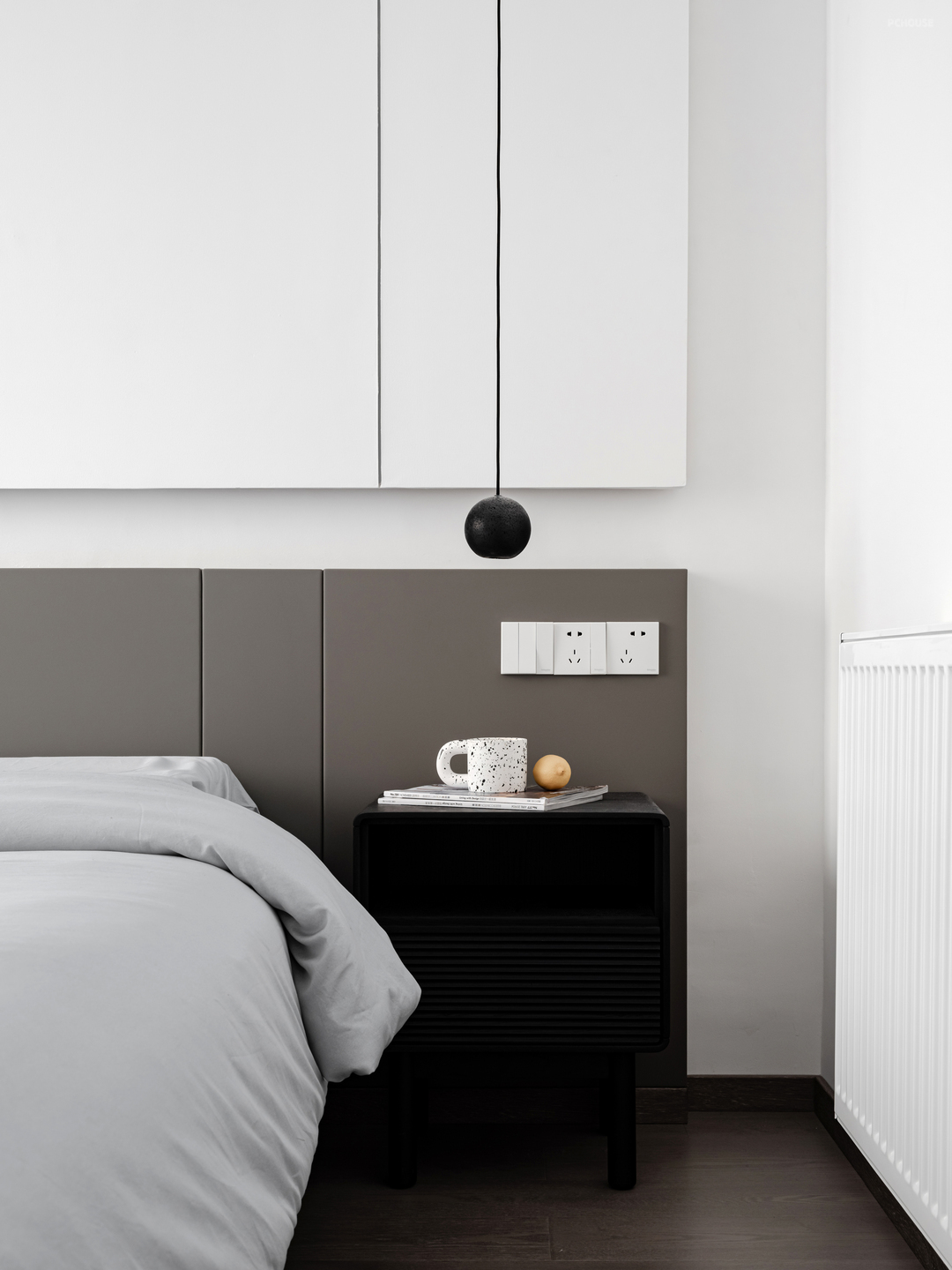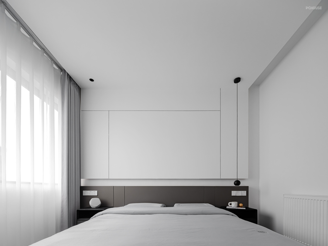 主卧 为保持空间的整体感和设计的一致性,我们坚持顶面与墙面的连贯设计。此外,我们选择的黑白色调,不仅凸显了空间的极简风格,也增强了其现代感。这种设计策略,不仅优化了视觉效果,也提升了居家体验。