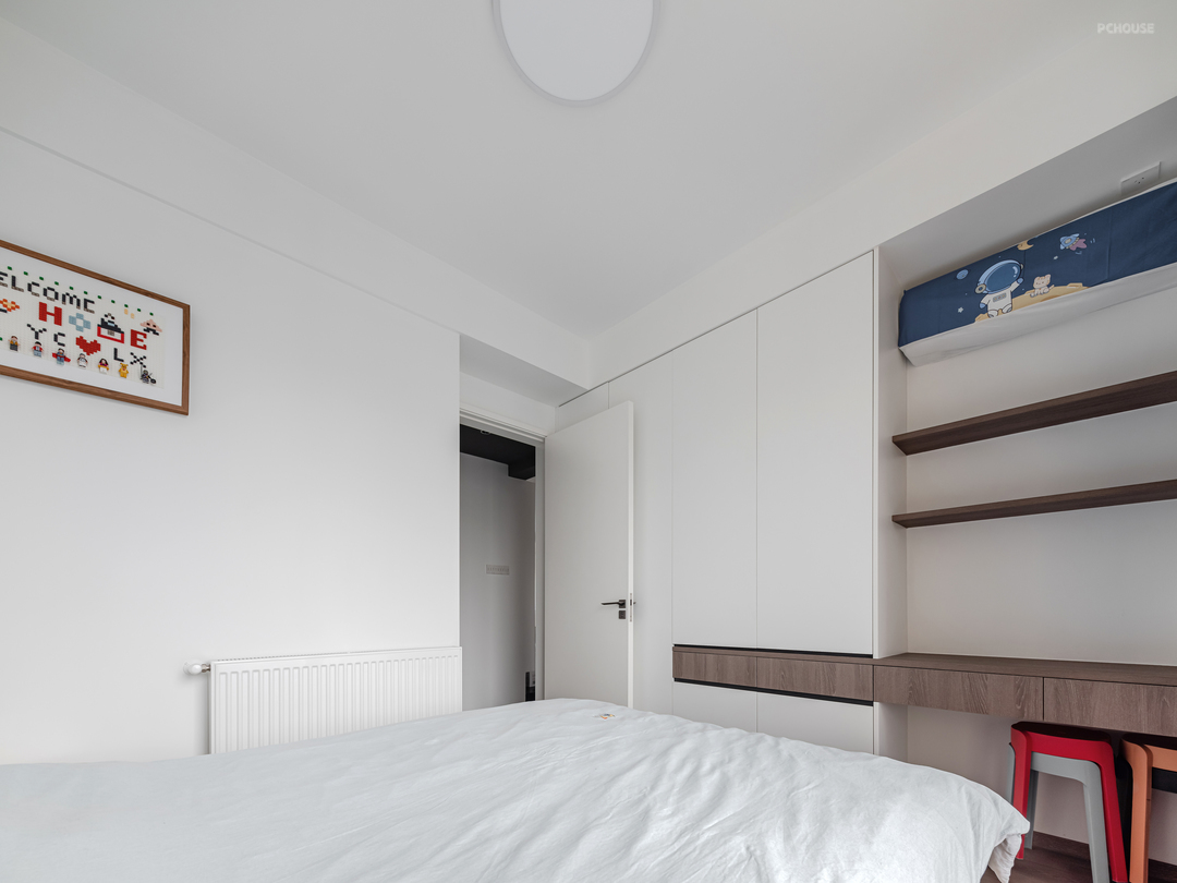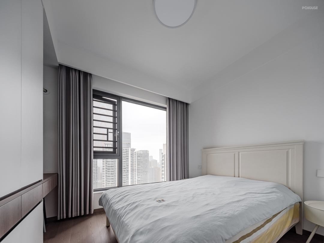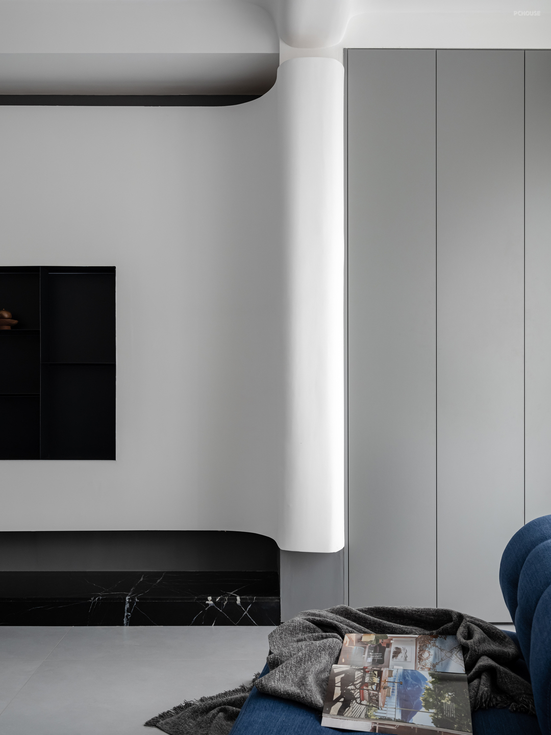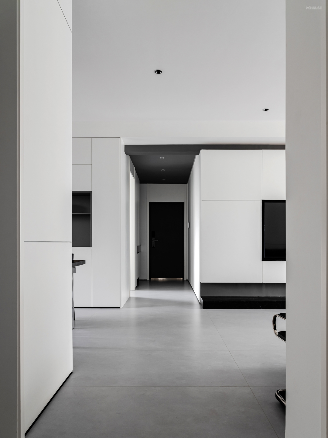 主卧 为保持空间的整体感和设计的一致性,我们坚持顶面与墙面的连贯设计。此外,我们选择的黑白色调,不仅凸显了空间的极简风格,也增强了其现代感。这种设计策略,不仅优化了视觉效果,也提升了居家体验。