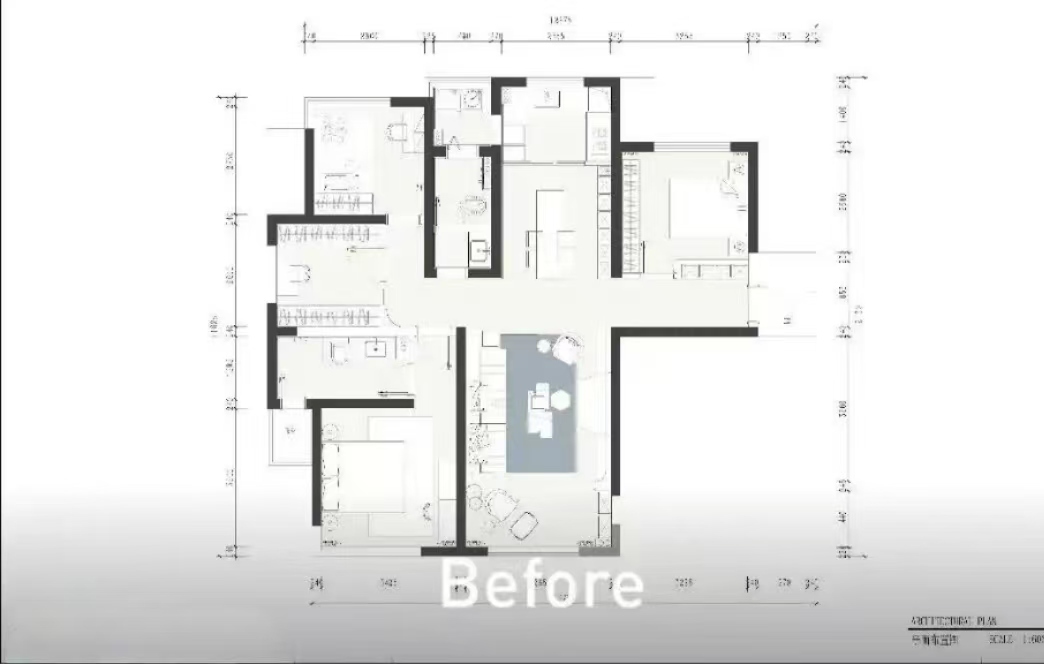 这套房子是4房2卫格局,竖向竖厅户型,业主是对年轻夫妻,考虑将来一个小孩,老人会过来照顾。通过人员结构,结合户型本身情况,建议规划主卧+预览小孩房+客房。剩下的房间多功能(衣帽间+书房结合)