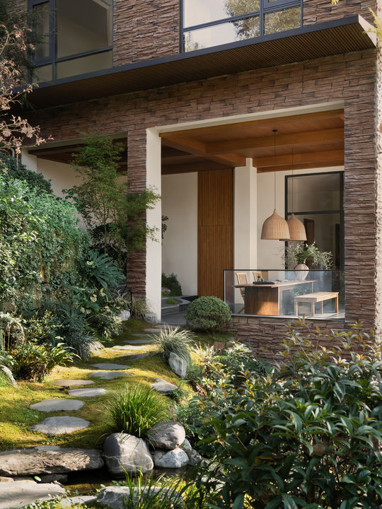 顶层空间则完成室内外的终极对话,茶室借由阳光房的独到优势,与户外花园以折叠门形成连接,不同天气模式下切换使用场景。