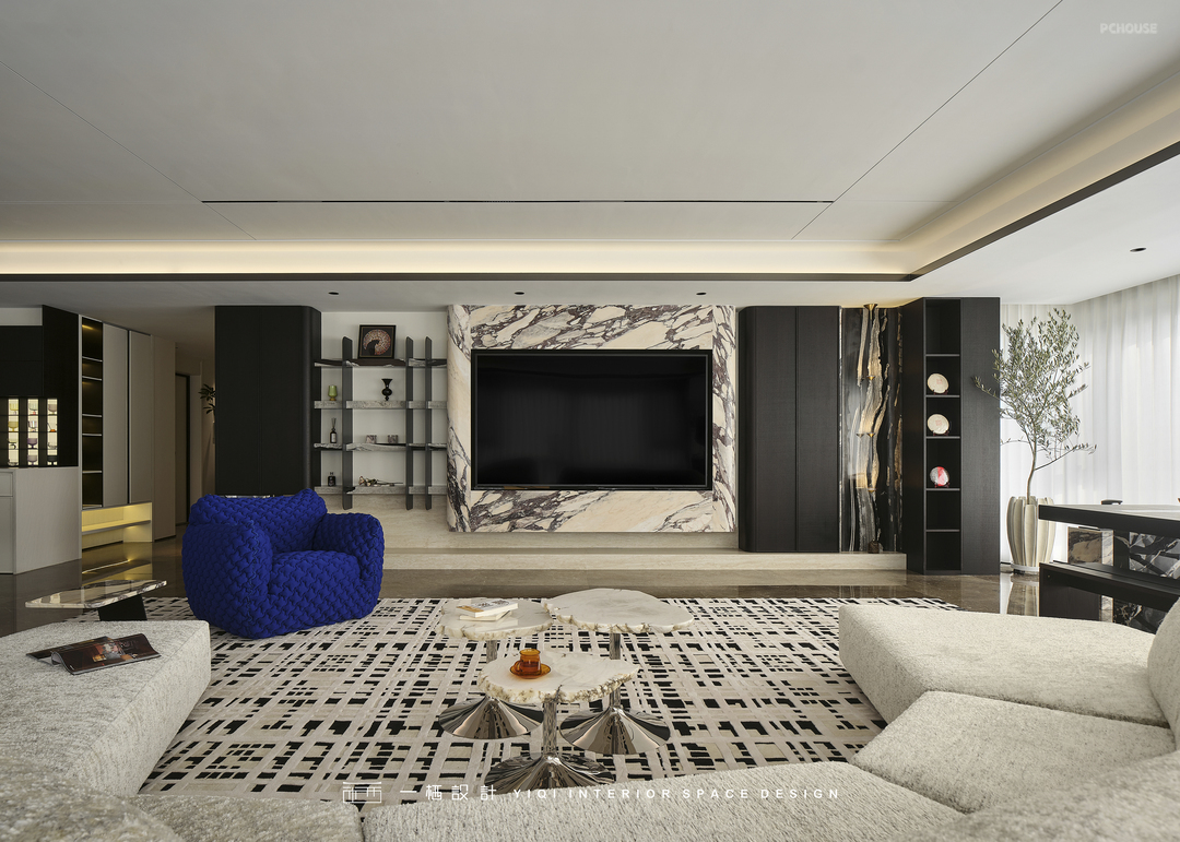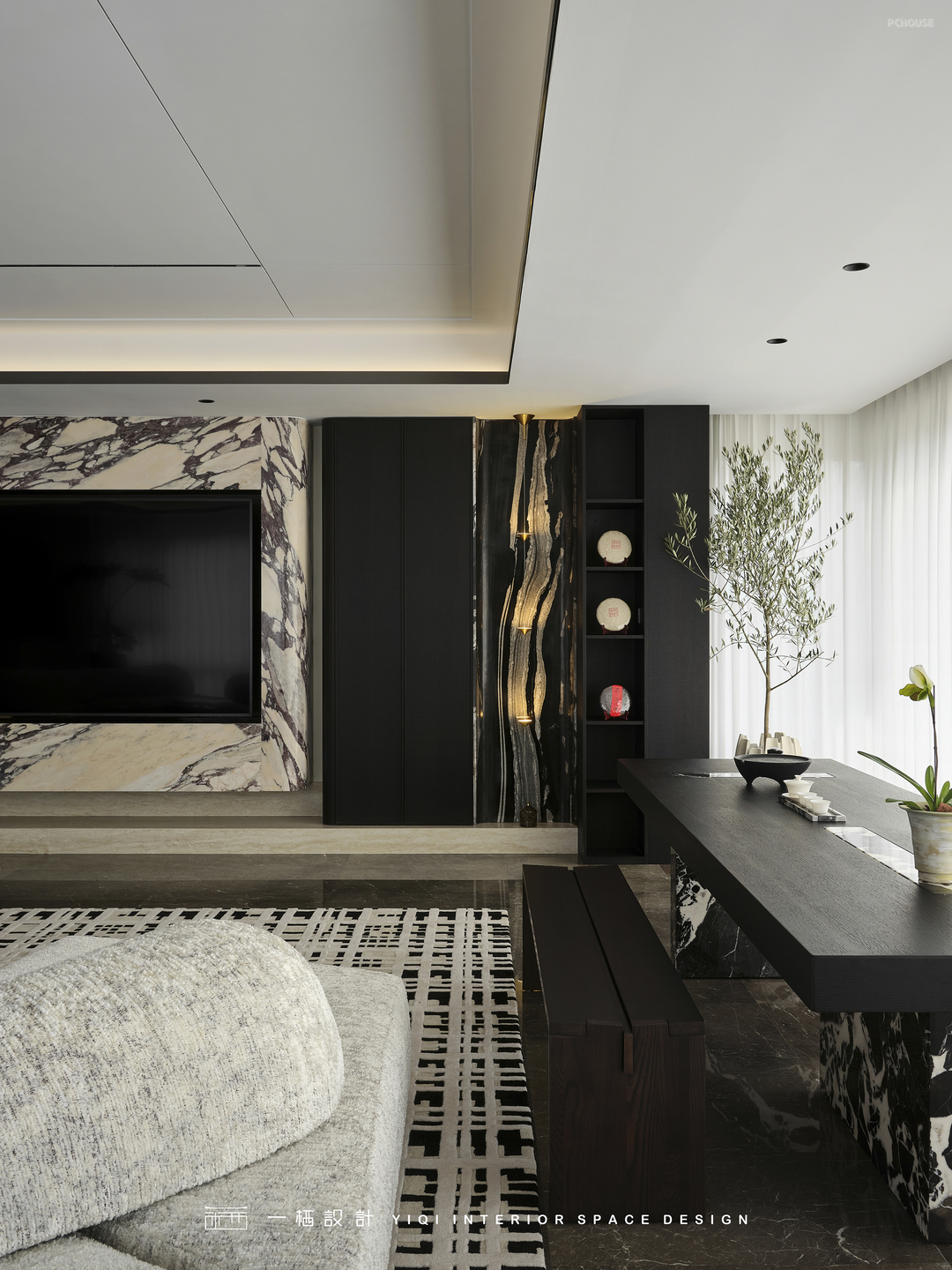 一个空间的基调很大程度取决于基底的色彩。在复古摩登的色系中,略带跳色的中性色几乎是必备条件。电视背景墙由宝格丽紫结合锯横木皮、金属层板、黑白山水墨画奢石、雨帘灯一起呈现。