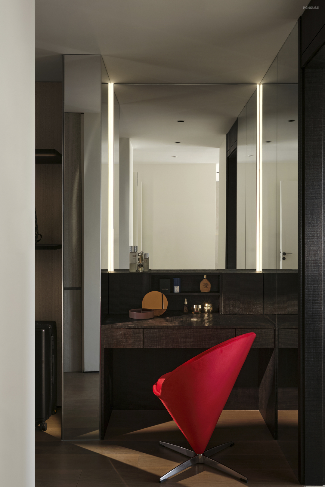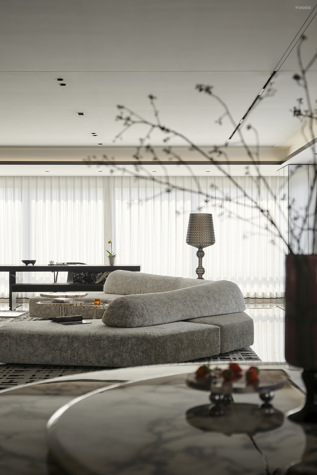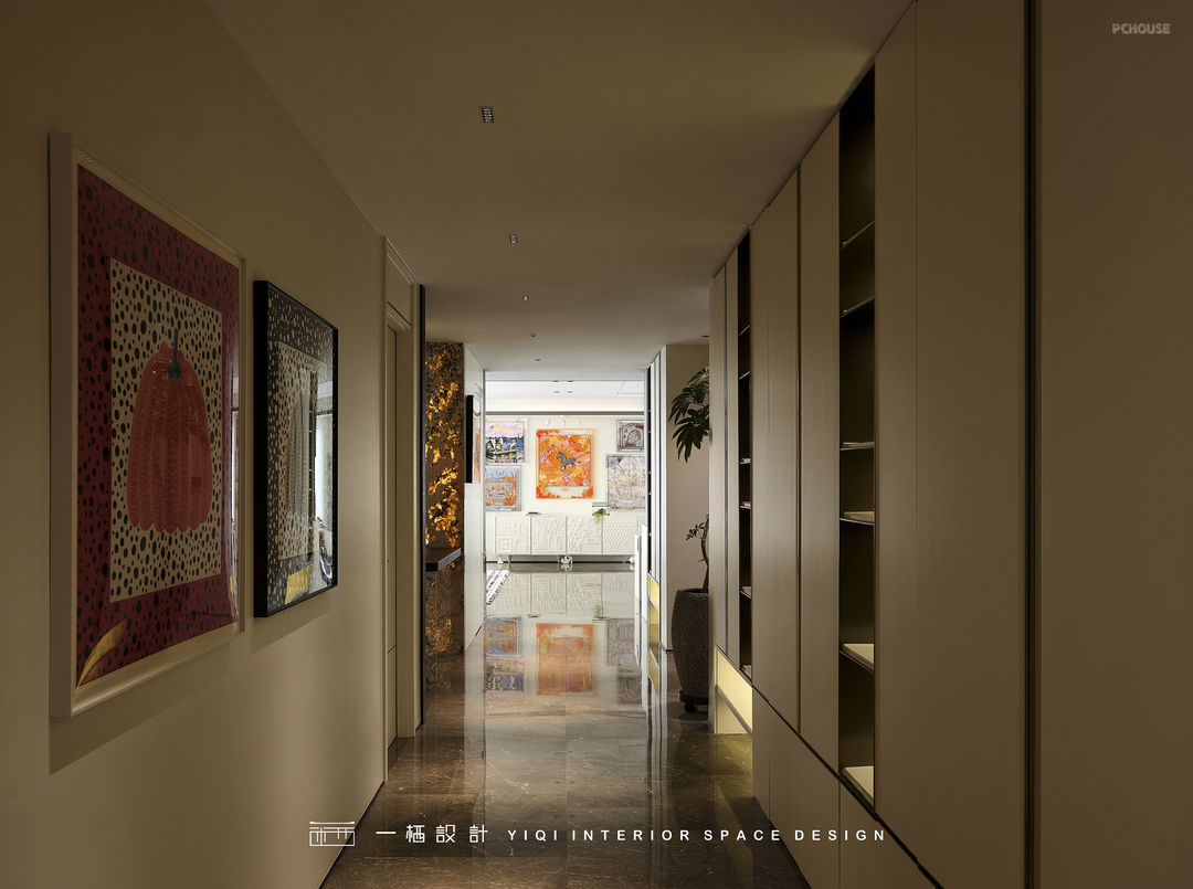沿着入户玄关有两处过渡区,以极致的清冷艺术感吸引眼球,相比之下,功能区的丰盈有目共睹。在设计之初,设计师尤为注重区域之间的衔接,致力于将艺术与生活的“初见”与“久伴”自然落实。