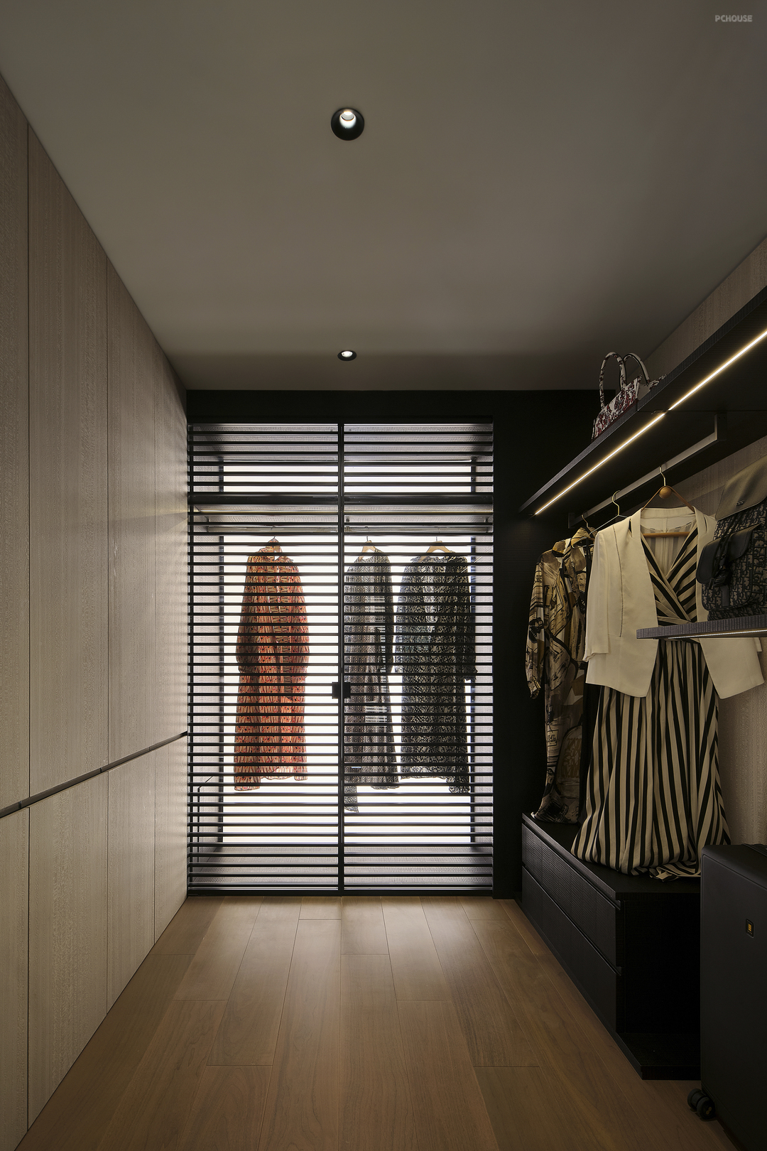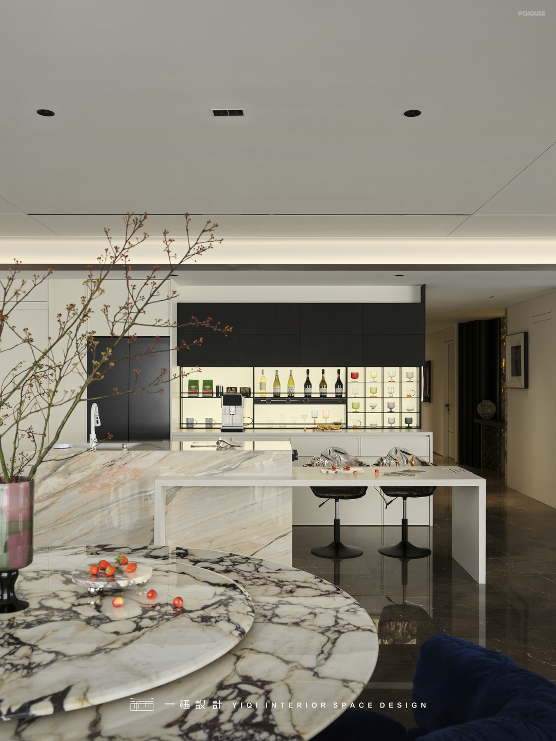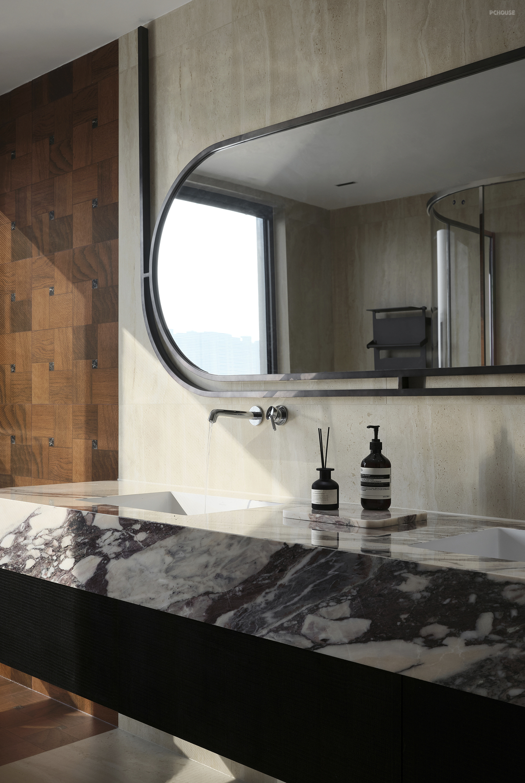 沿着入户玄关有两处过渡区,以极致的清冷艺术感吸引眼球,相比之下,功能区的丰盈有目共睹。在设计之初,设计师尤为注重区域之间的衔接,致力于将艺术与生活的“初见”与“久伴”自然落实。