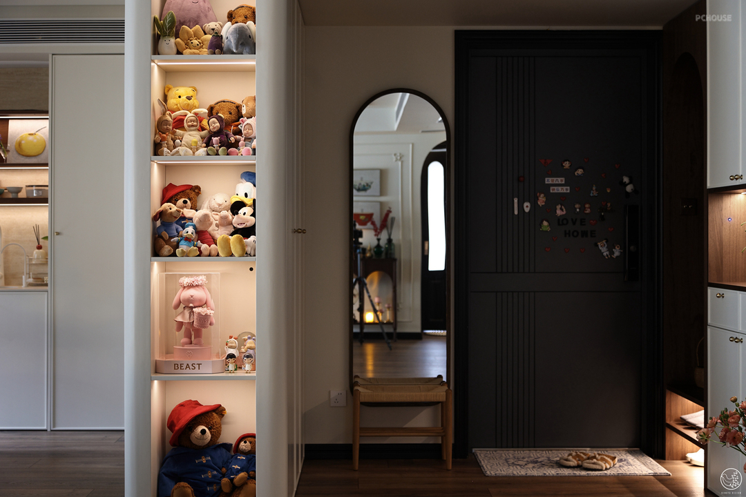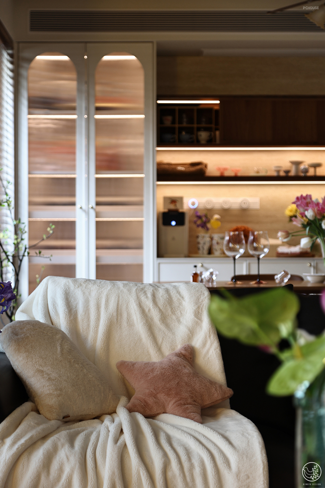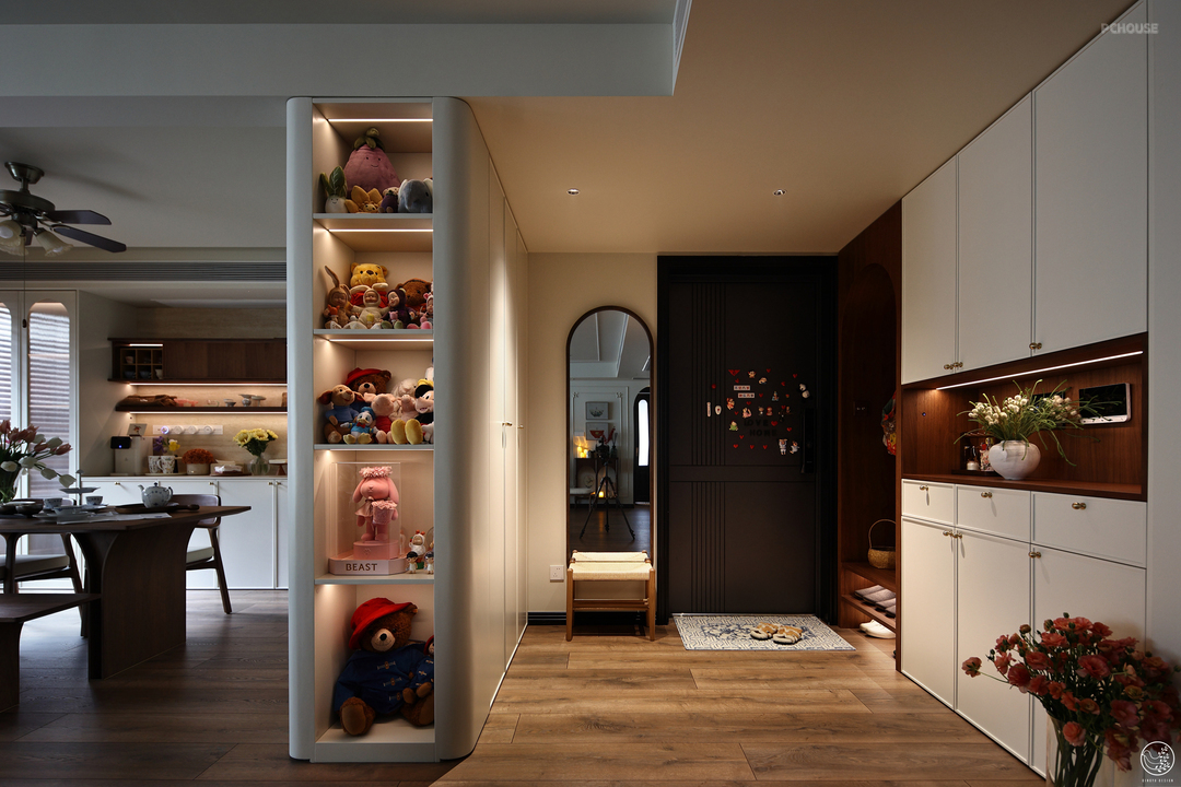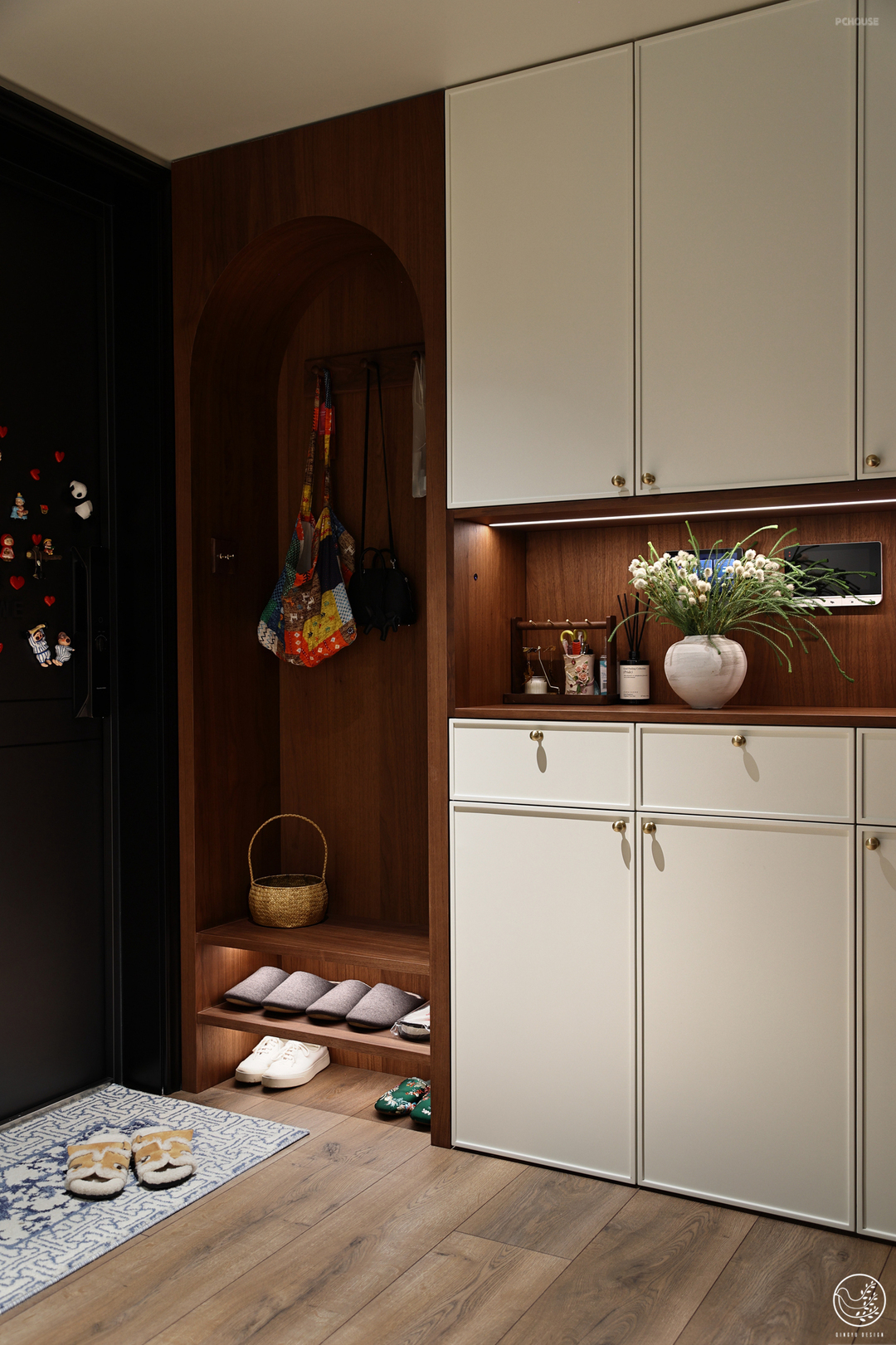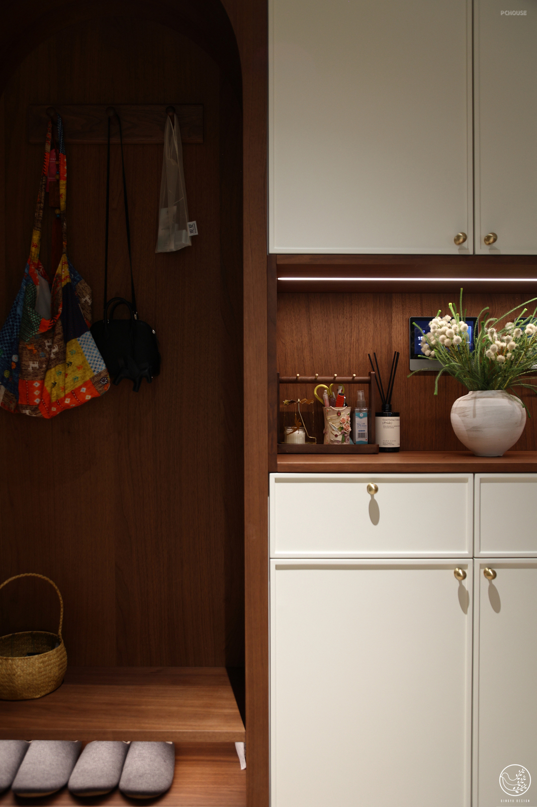 设计师刘丽将原本进门右侧的房间打通做餐厅后,使入户区域更加敞亮,并在进门处设置了鞋柜与坐柜,提升了日常中的实用度,而餐厅与入户的隔墙也巧妙地以储物柜代替。