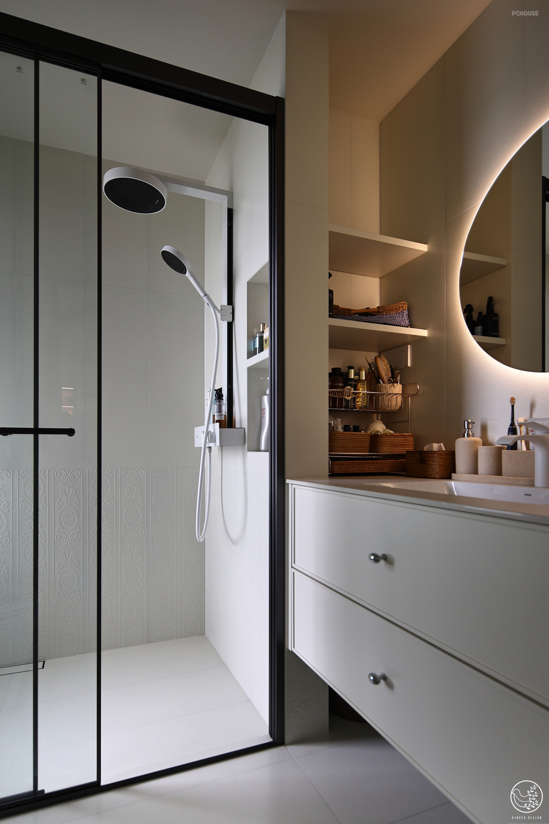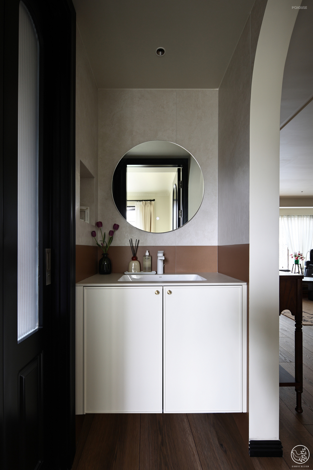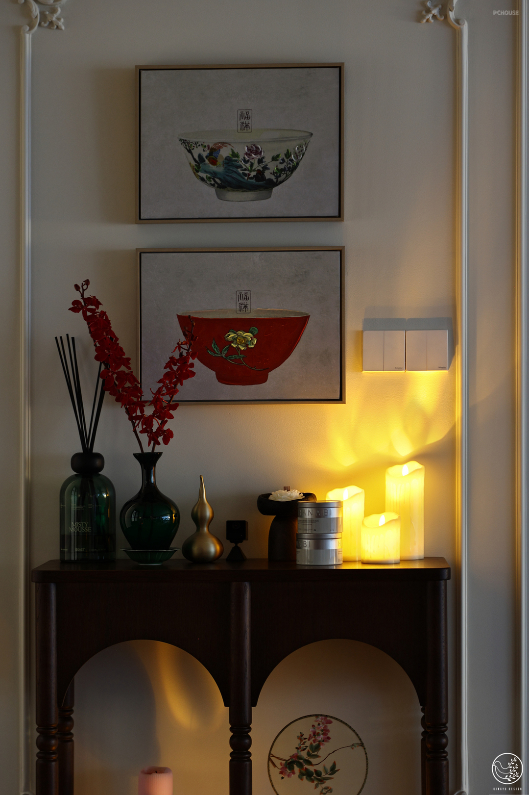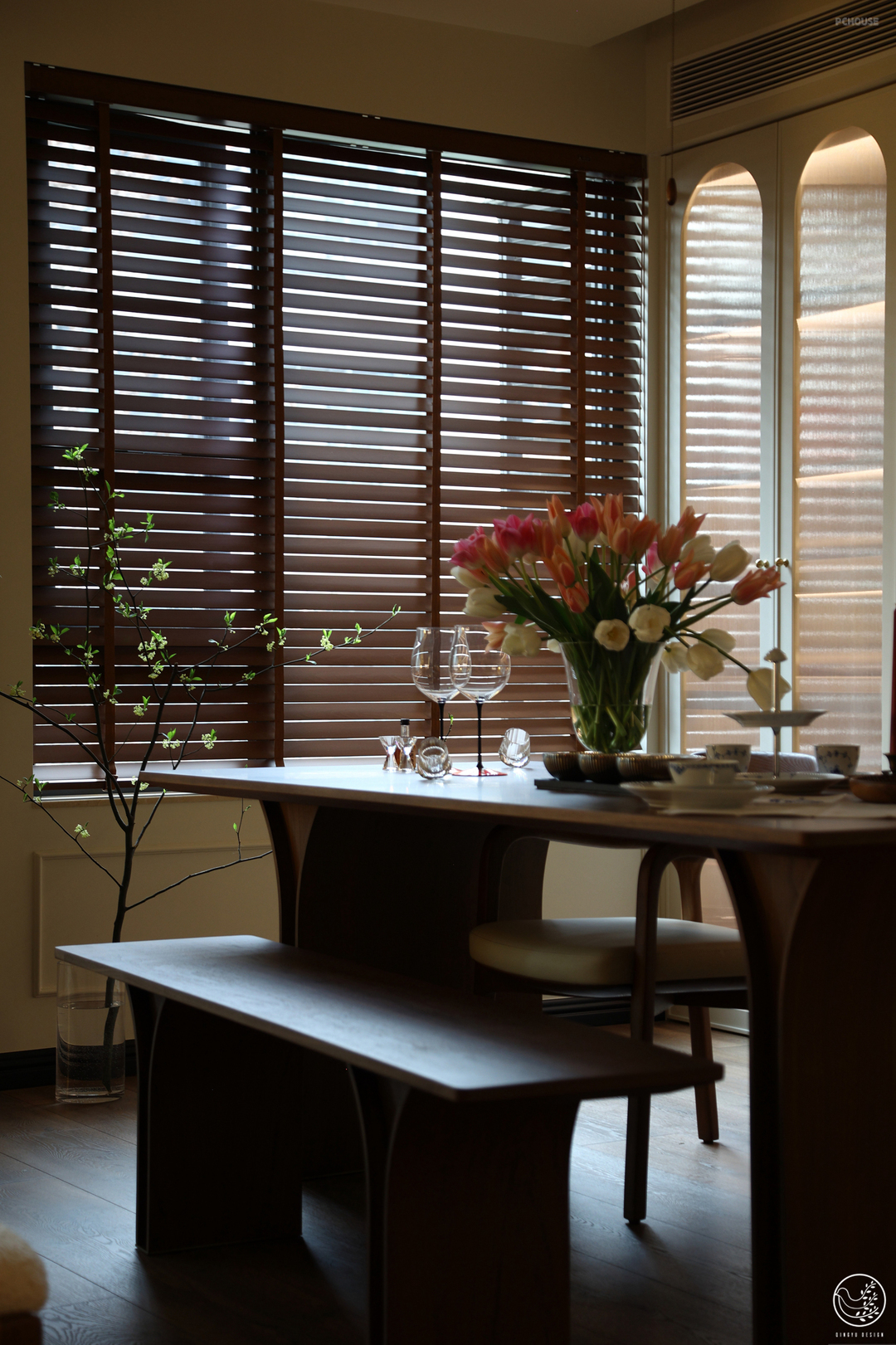 设计师刘丽将原本进门右侧的房间打通做餐厅后,使入户区域更加敞亮,并在进门处设置了鞋柜与坐柜,提升了日常中的实用度,而餐厅与入户的隔墙也巧妙地以储物柜代替。