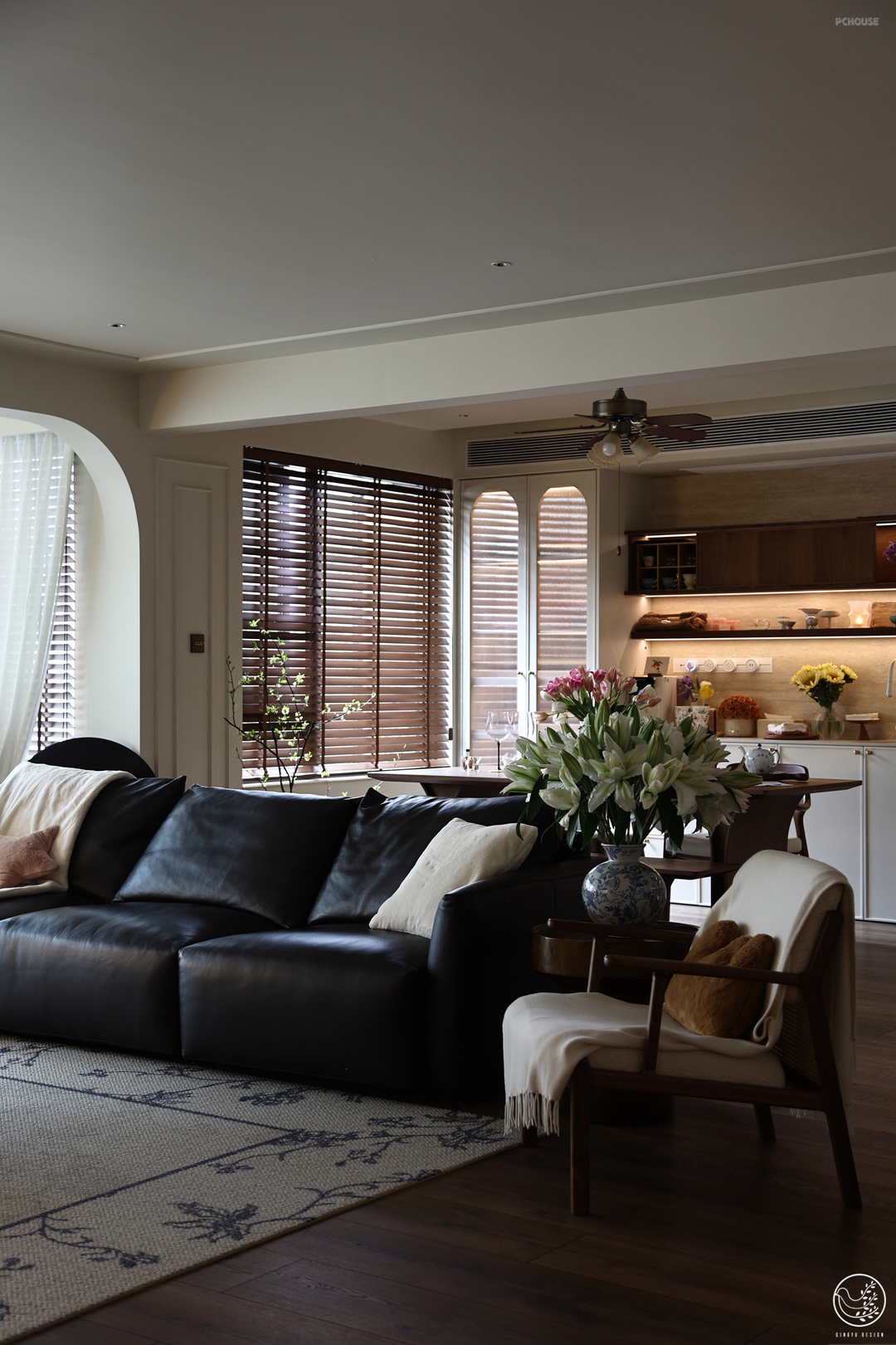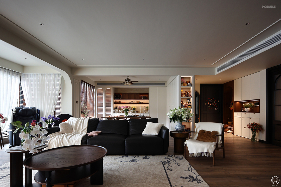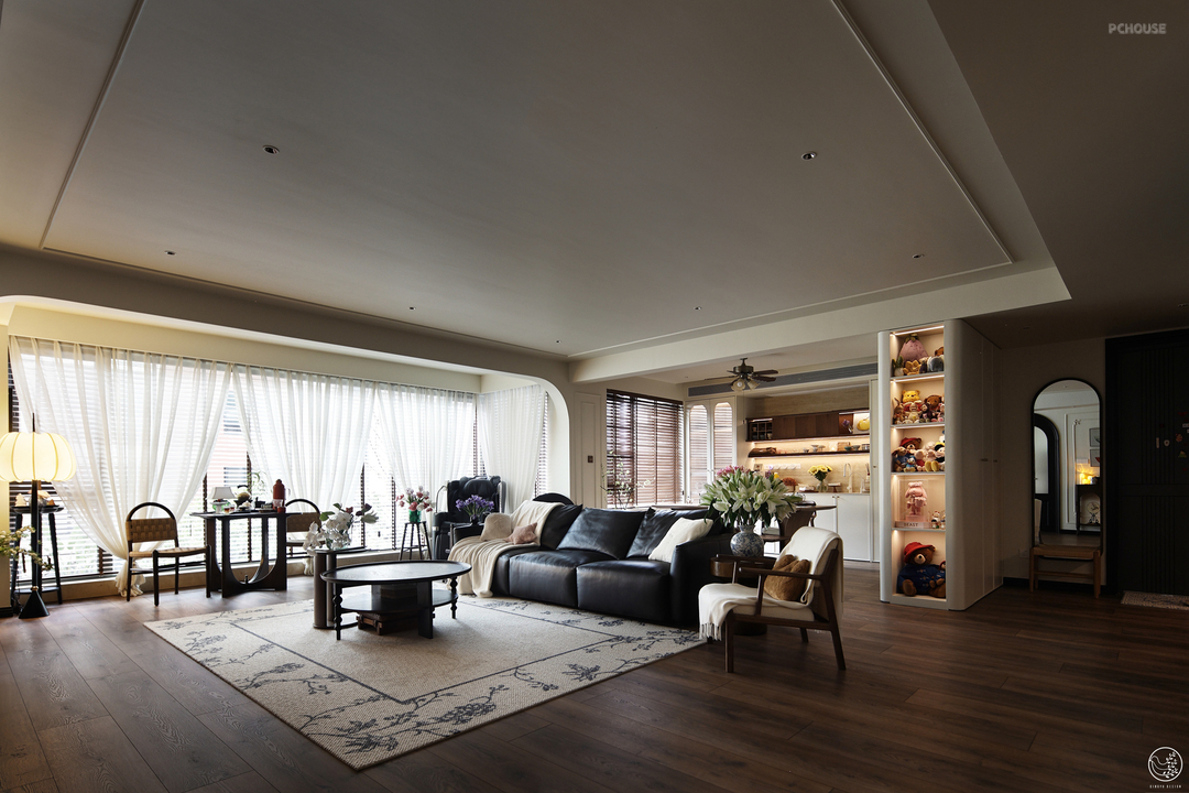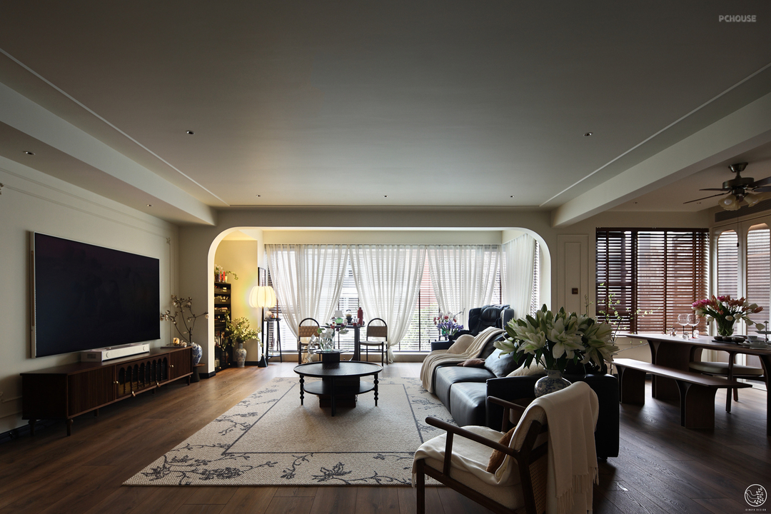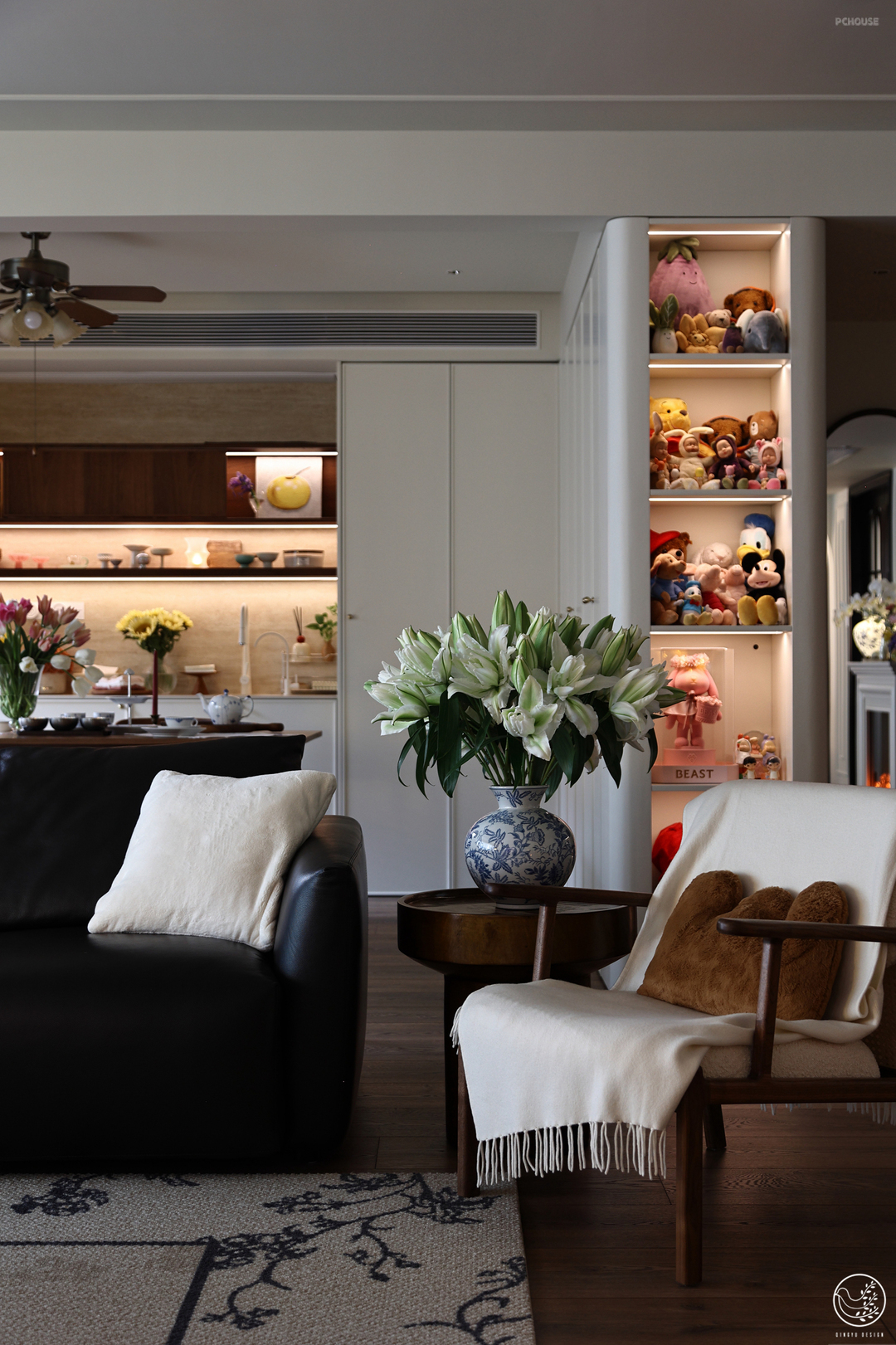 因为餐厅有了新的位置,所以客厅变得很宽敞了,也就可以有更松弛的布局与呈现。