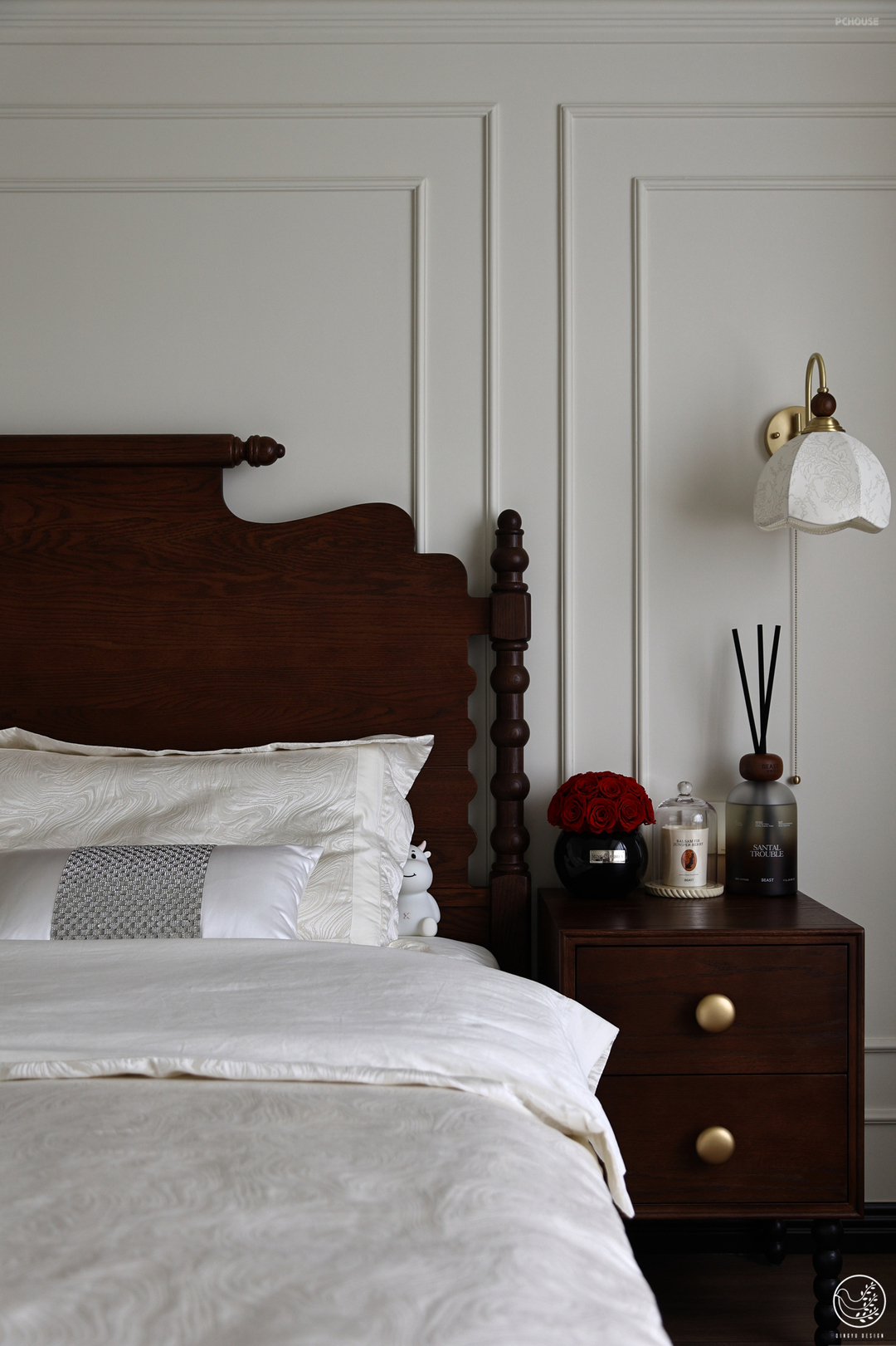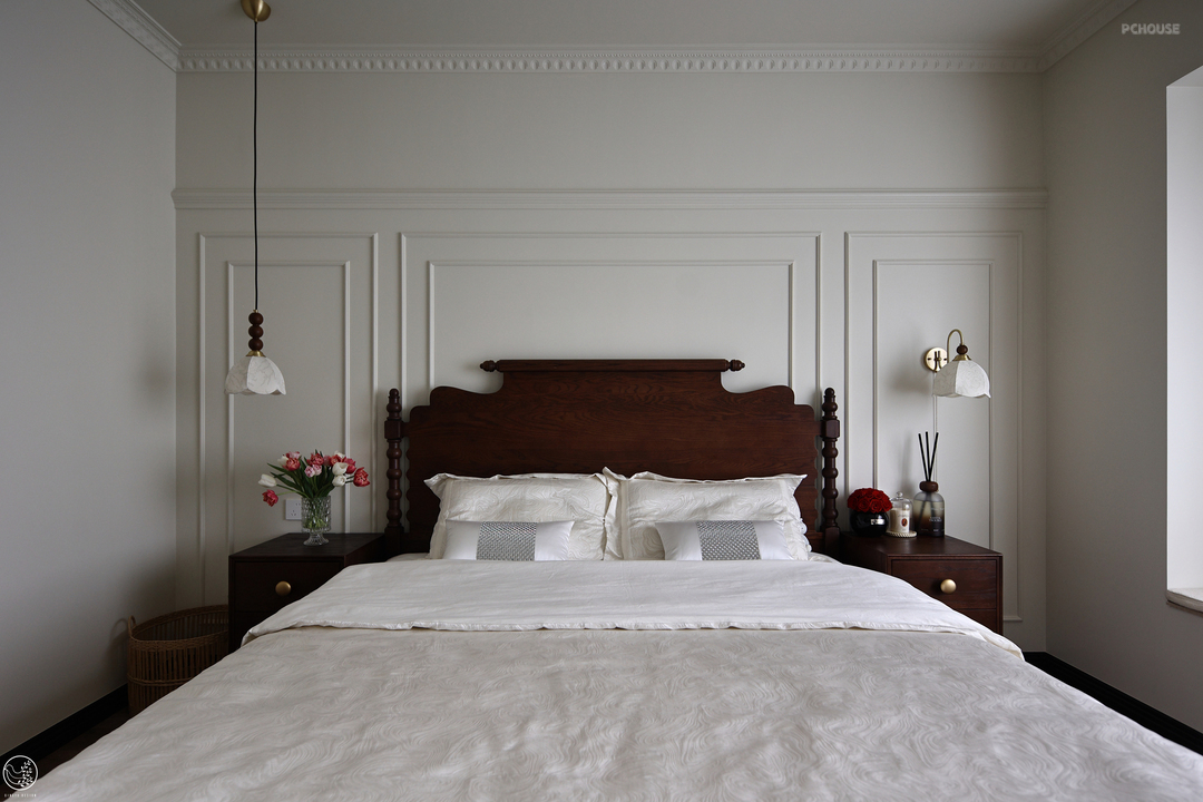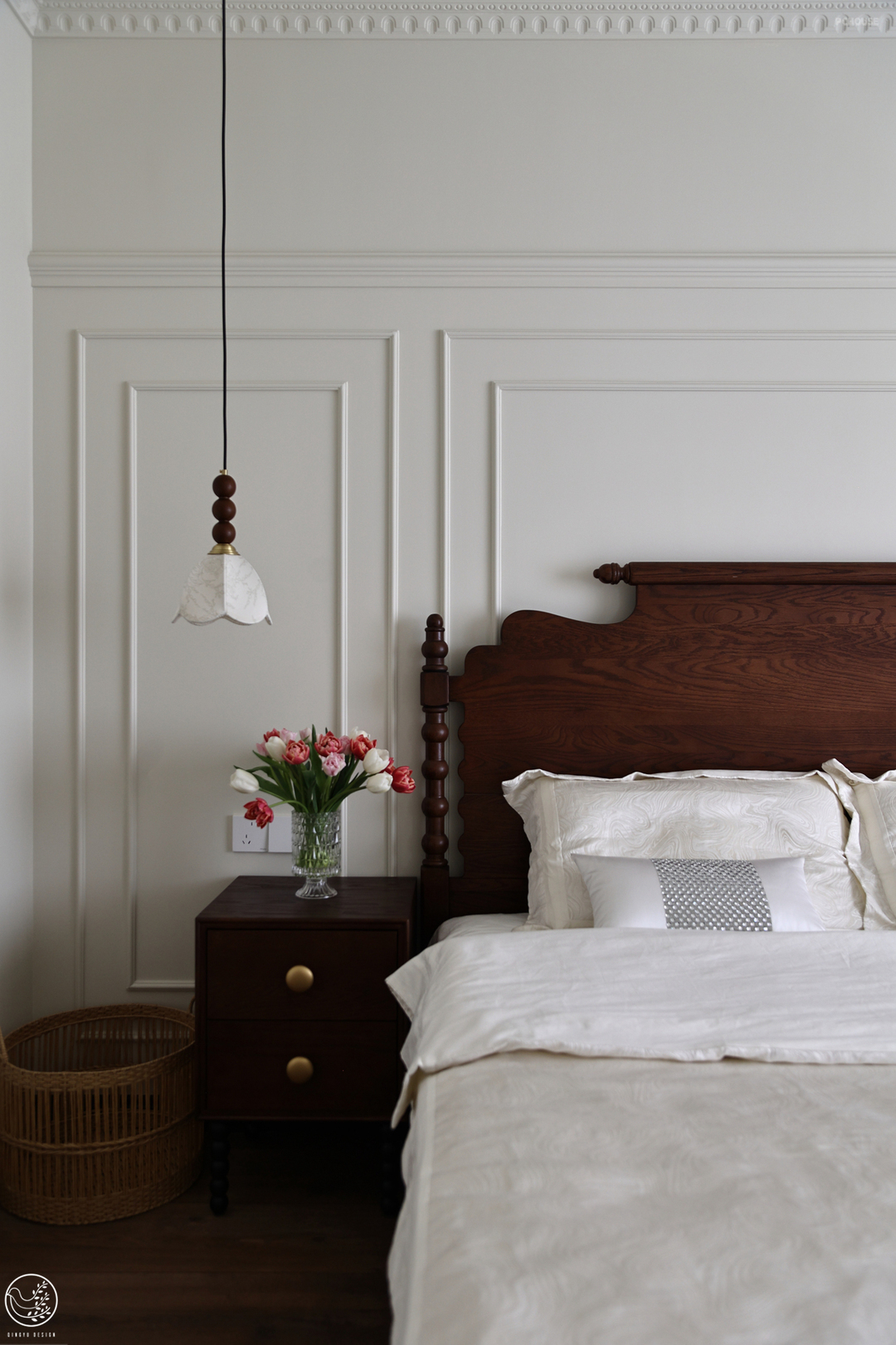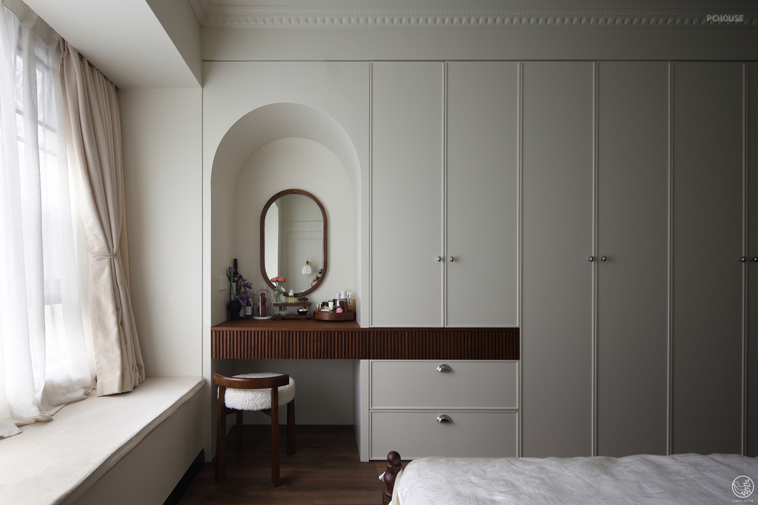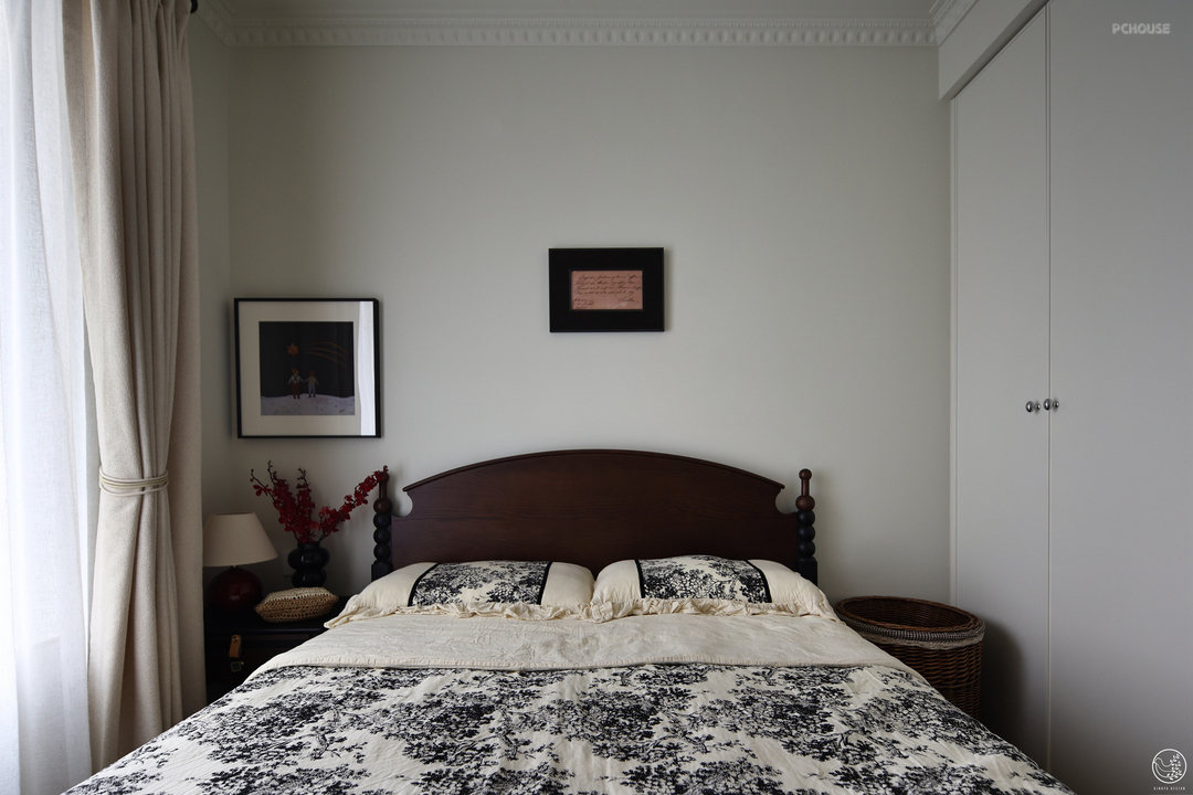 设计师没有在主卧室铺陈过多的造型,只用石膏线条做了乳胶漆同色,但寥寥几笔勾画出的效果也是精致有神韵。