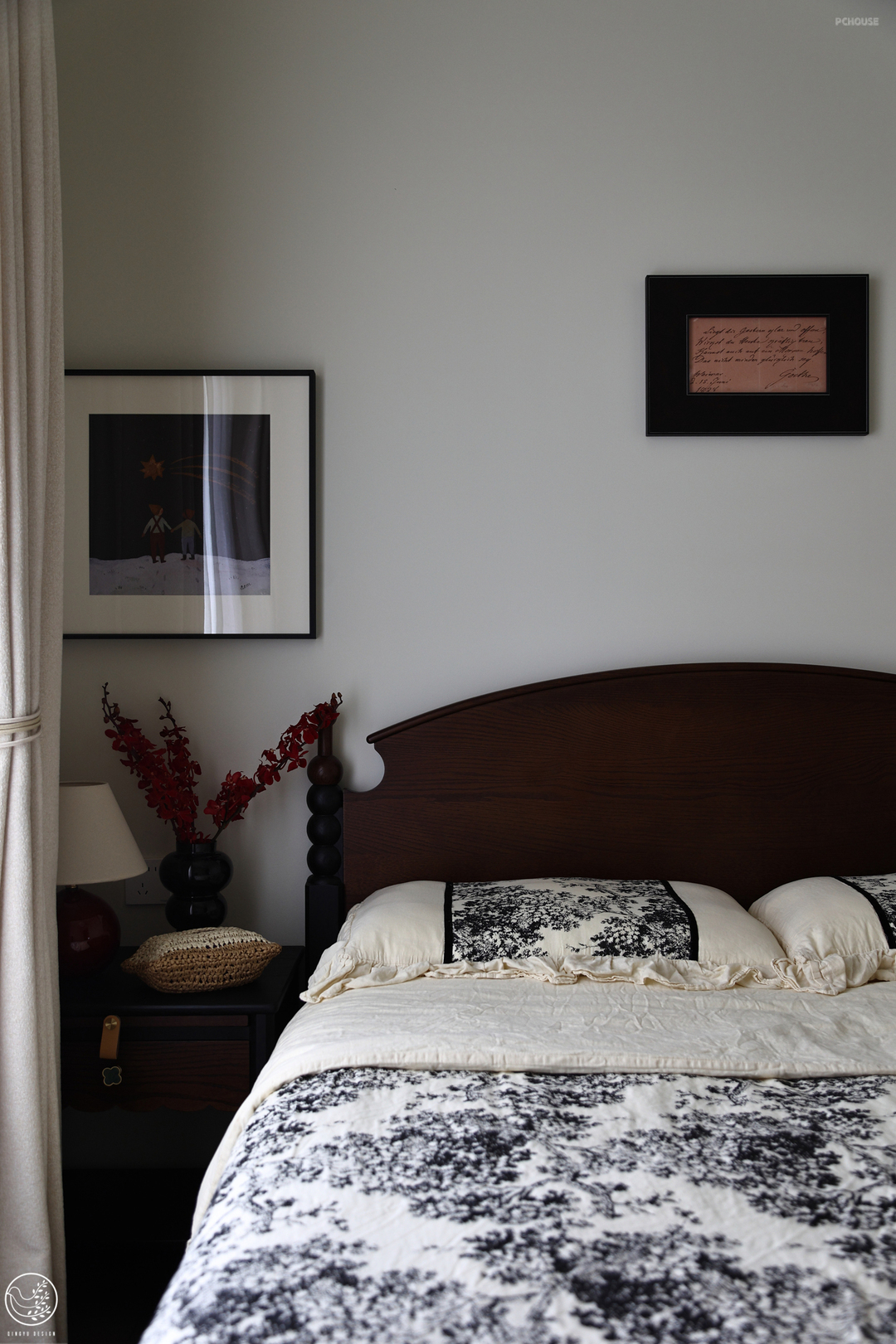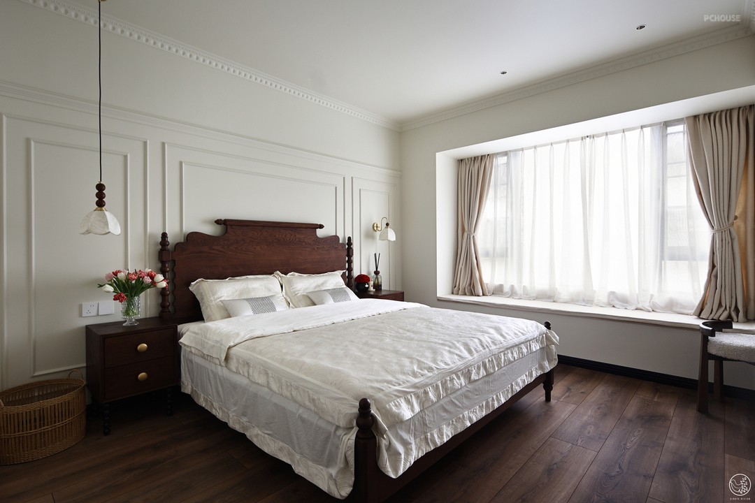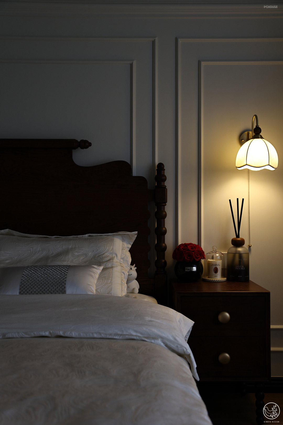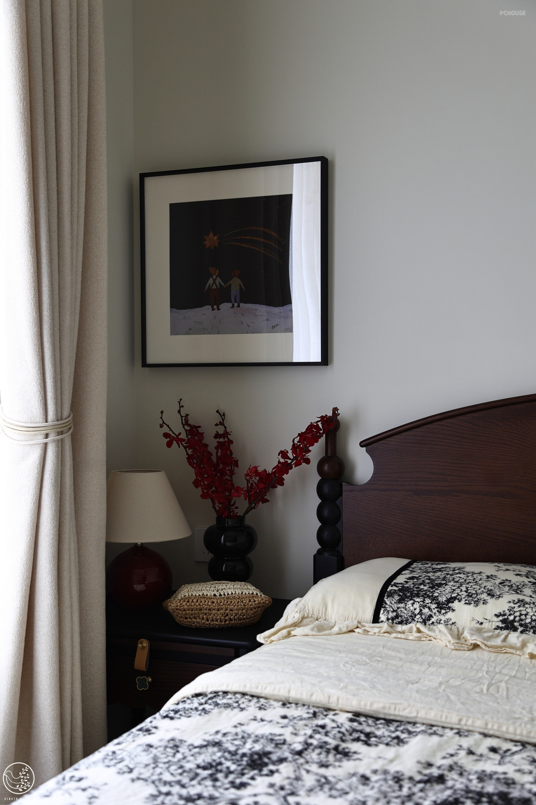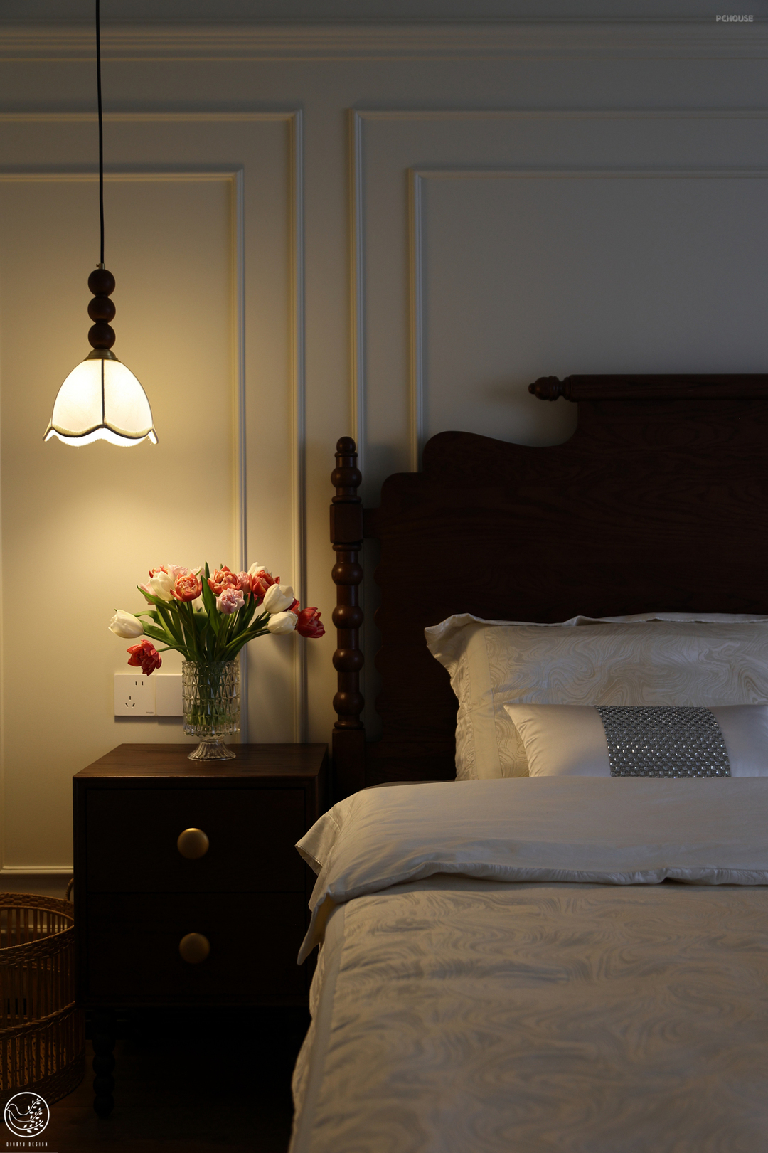 设计师没有在主卧室铺陈过多的造型,只用石膏线条做了乳胶漆同色,但寥寥几笔勾画出的效果也是精致有神韵。