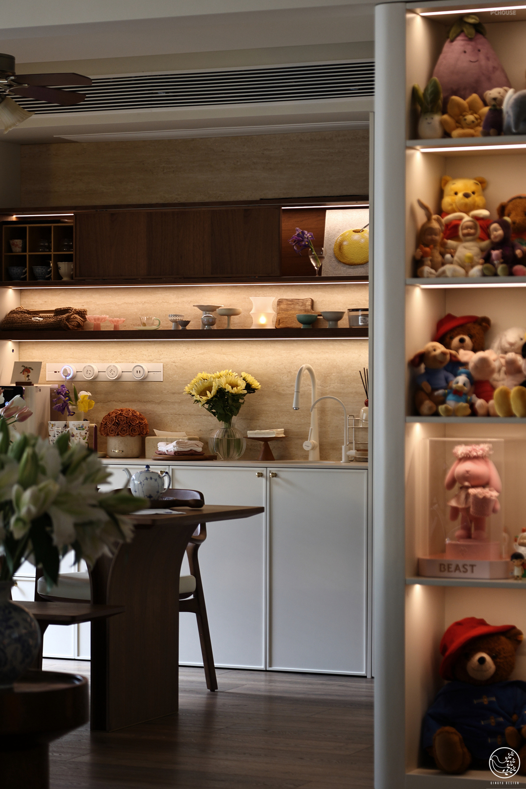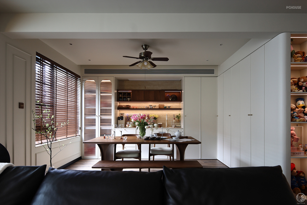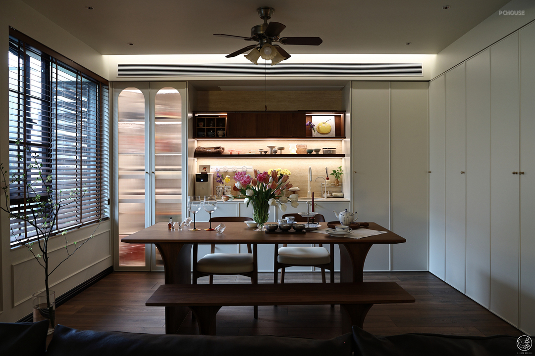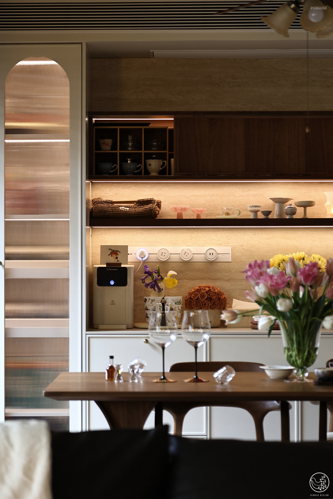 原本的房间拆除墙体后,设计师将它打造为餐厅和西厨区,并配置了满墙的收纳柜,来兼顾好看与杂物收纳。