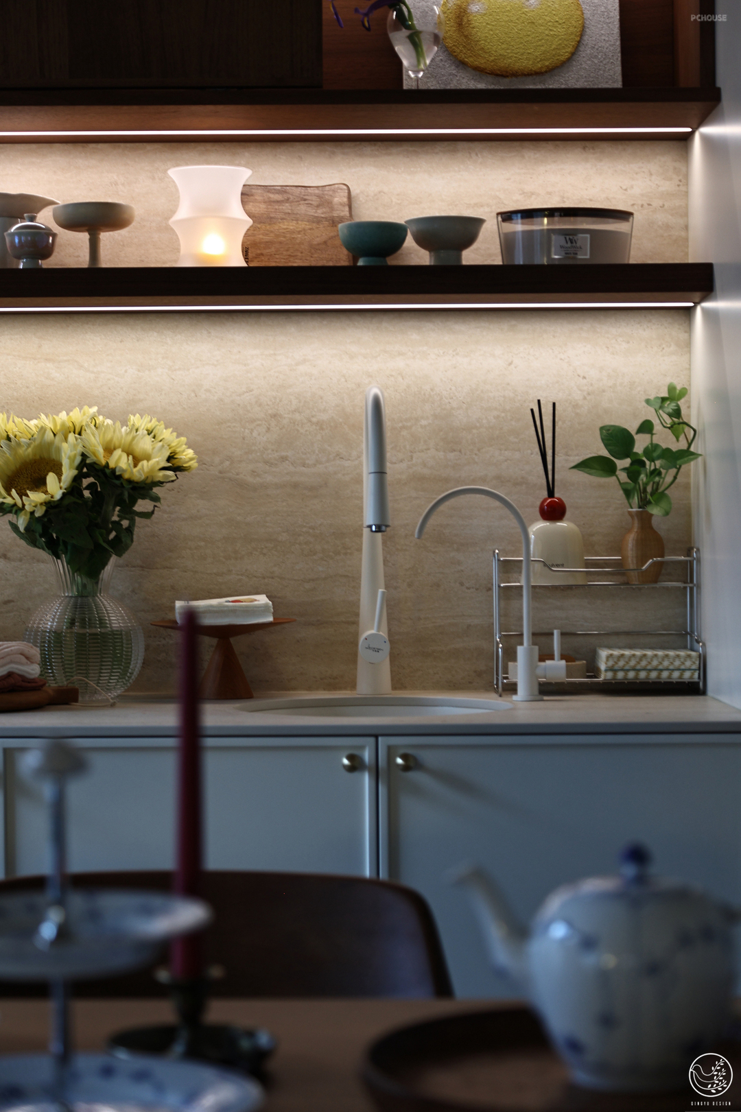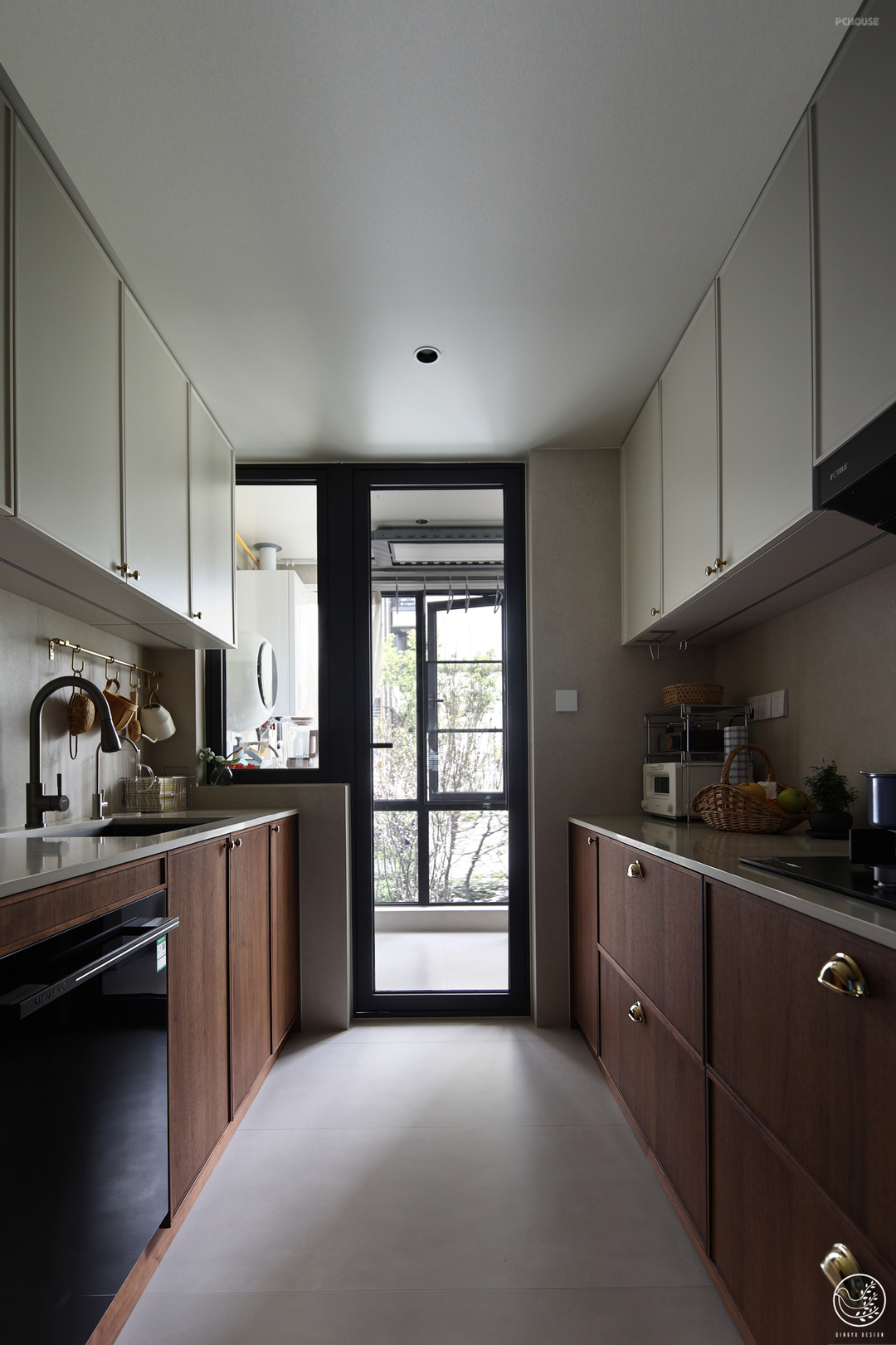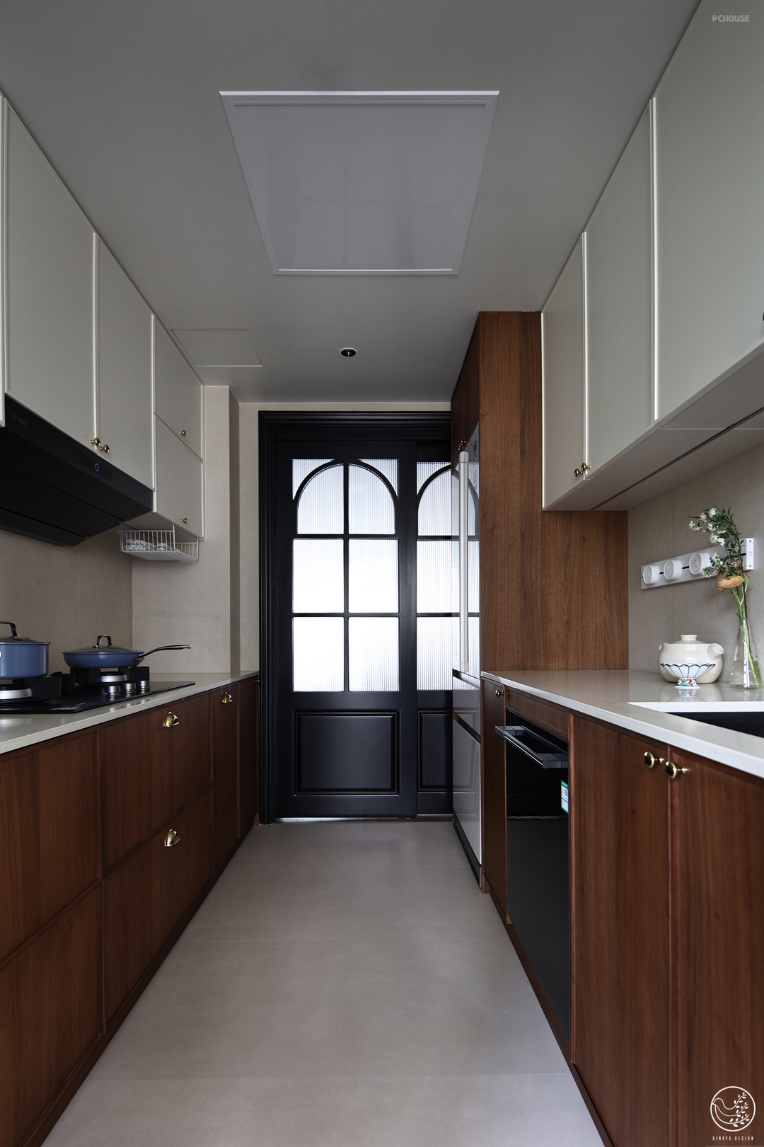 原本的房间拆除墙体后,设计师将它打造为餐厅和西厨区,并配置了满墙的收纳柜,来兼顾好看与杂物收纳。