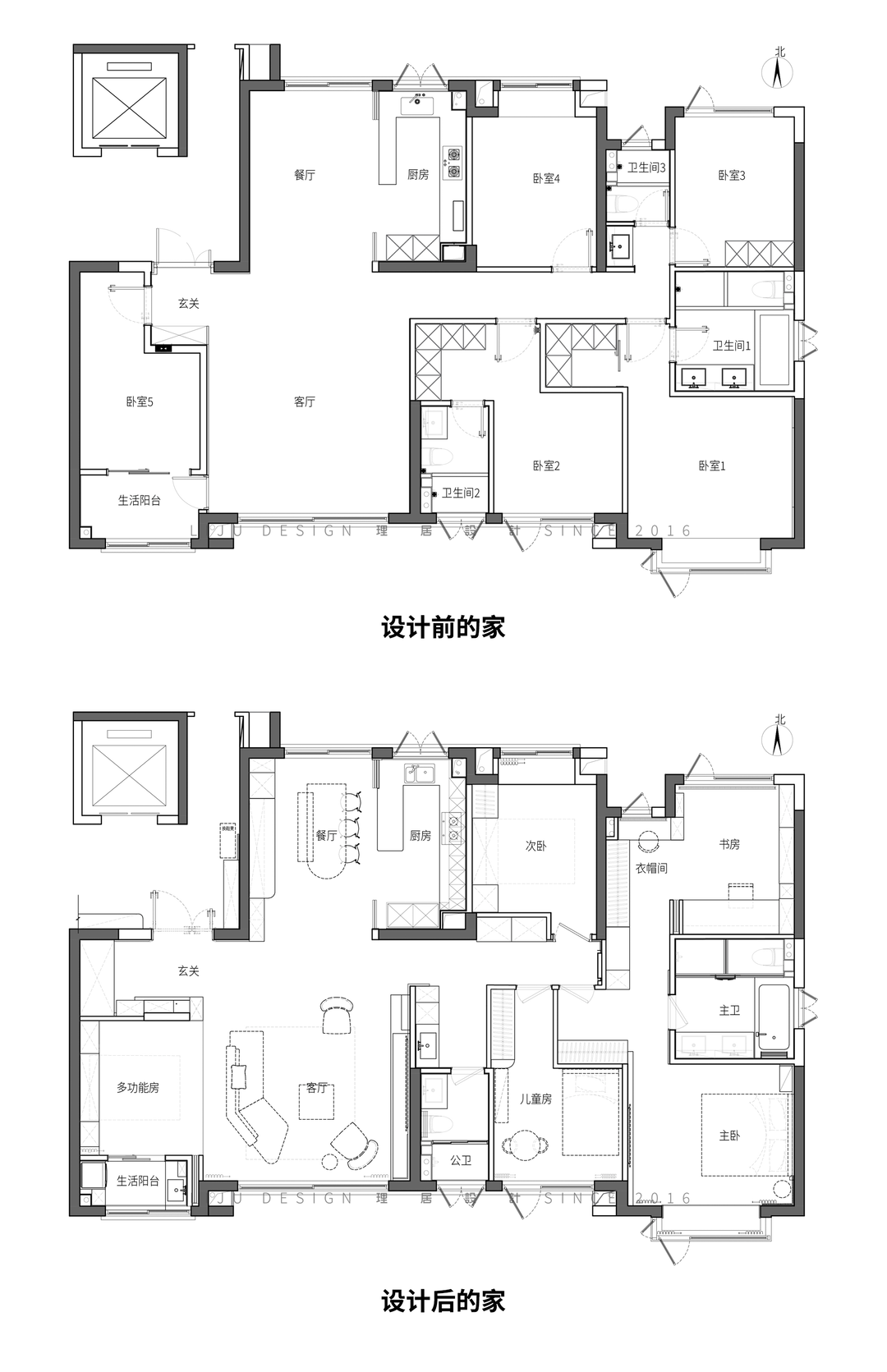 连接公私区域的走廊在改造之后缩短了距离,客卫的替换获得了“缩短使用距离、保证卧室区域的私密性、增加主卧面积以成为大套间”一举三得的效果。