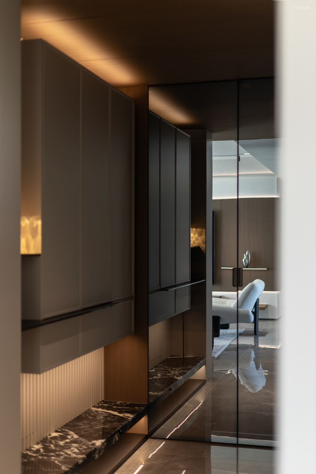 临近入户、无法保证睡眠品质与私密性的卧室被一分为二,分别划入玄关和客厅。玄关处,吊柜、储物柜的搭配消化了进门物品与童车等大件物品的存放,石材与镜面的搭配,为“轻奢”定调。