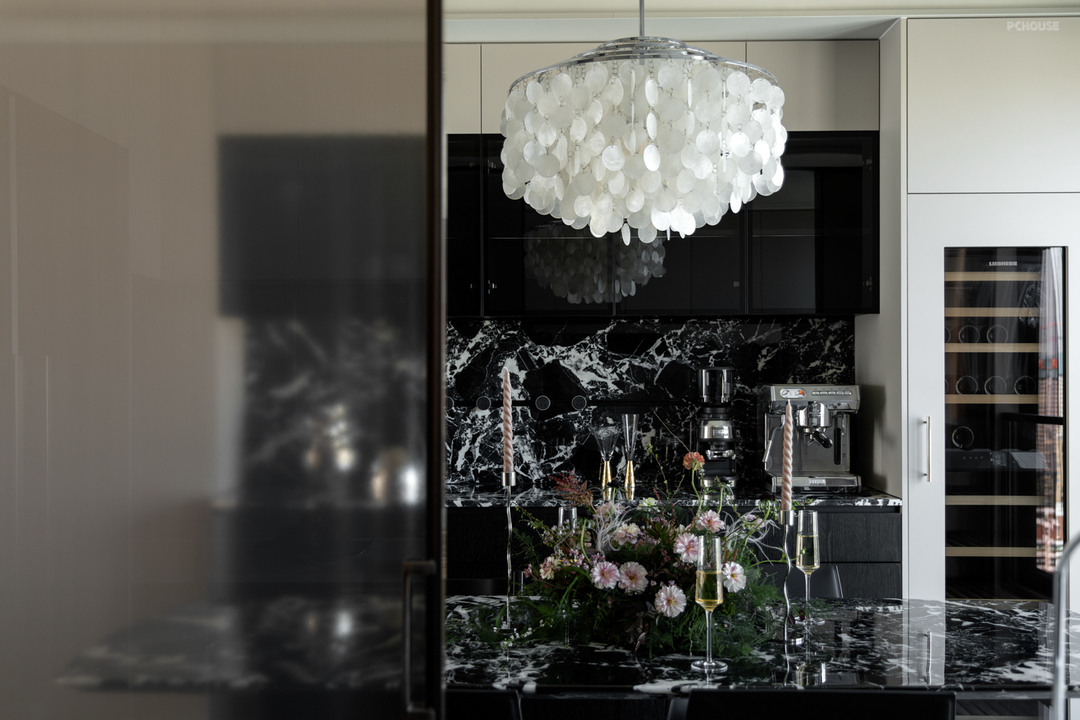 沉稳低调的拿破仑黑是餐厅的主基调,金属、玻璃、石材的碰撞,在柔美灵动的贝壳灯下,冷冽与温润交织出一场静谧而流动的材质协奏。