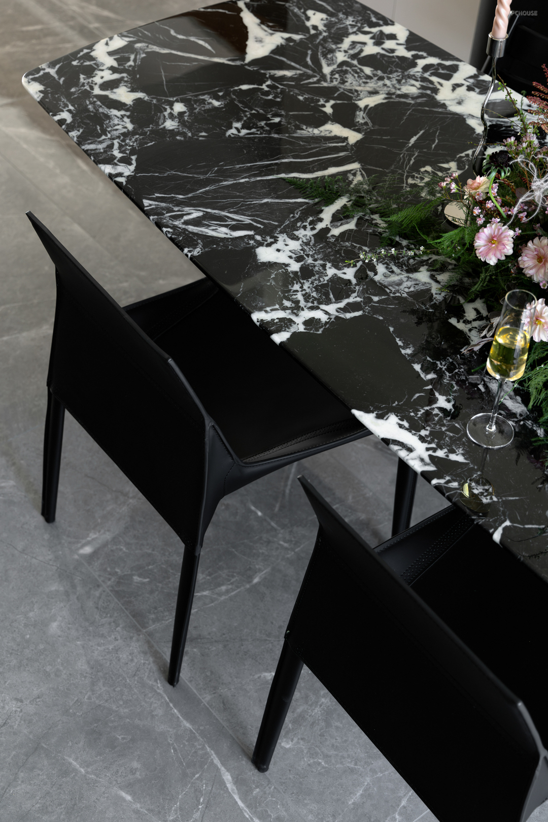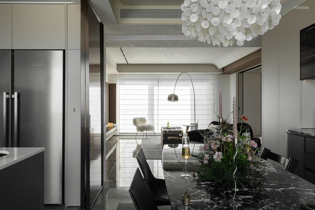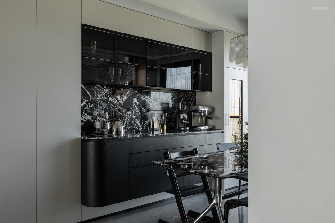 狭长的餐厅不适合常规的成品家具,于是以一方以弧修饰的大理石定制餐桌置于其中,用细微尺寸的把控,来保障餐厅在日常使用场景下的舒适感。