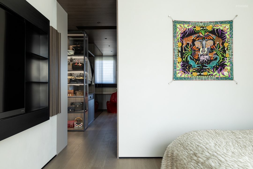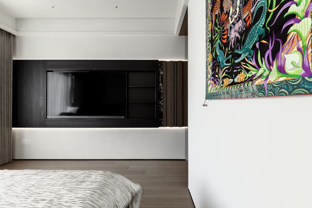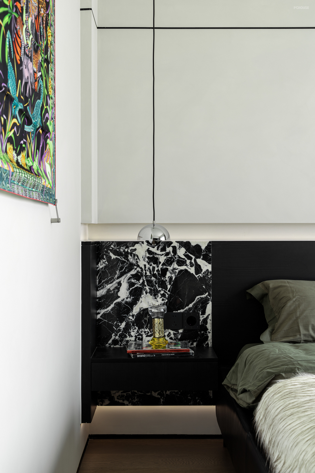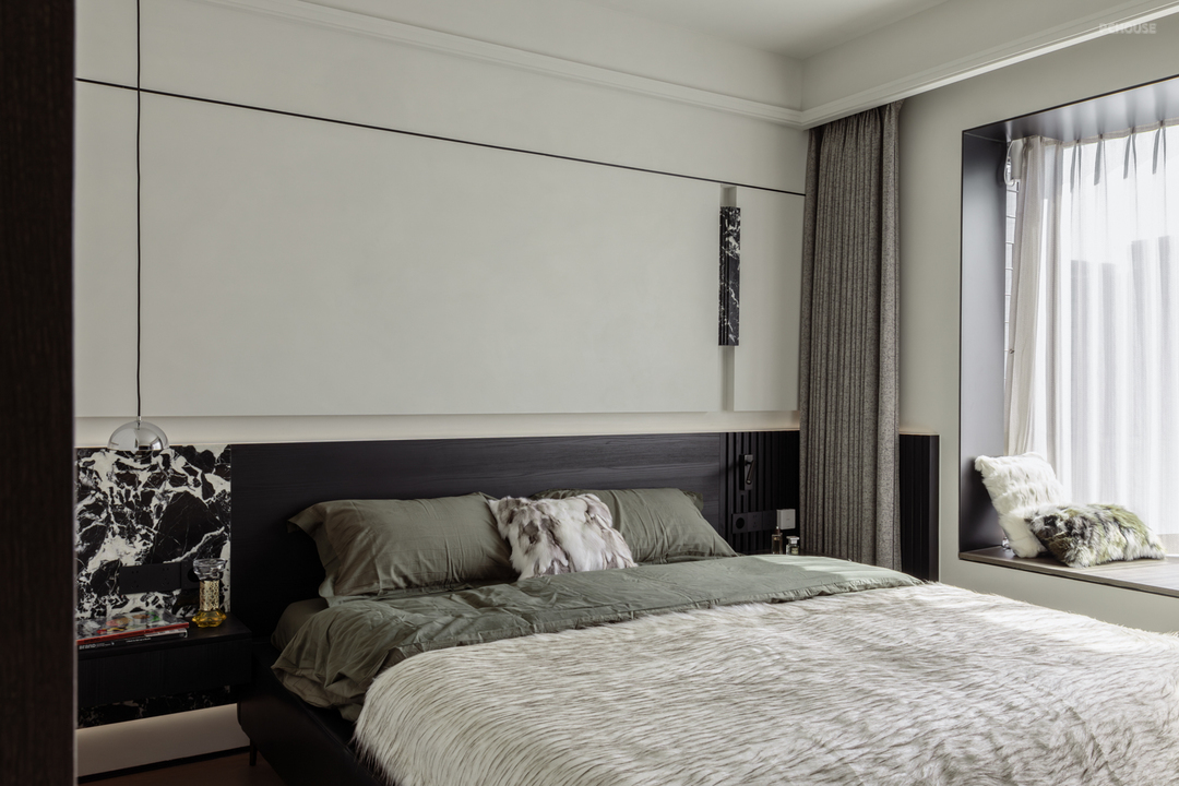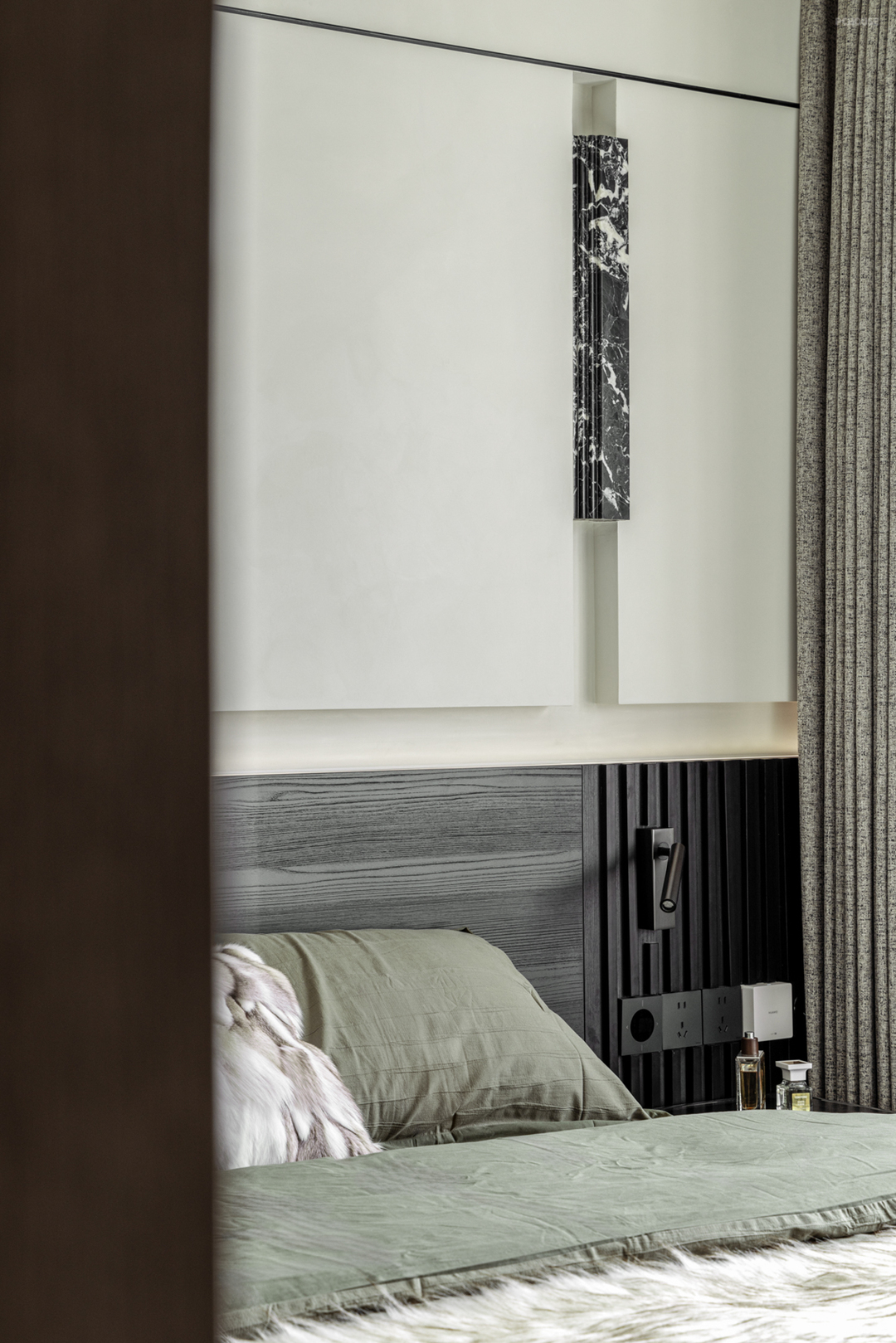 公区的材质作为统一的设计元素延续至主卧,温馨柔软的氛围则是交由软装来营造。