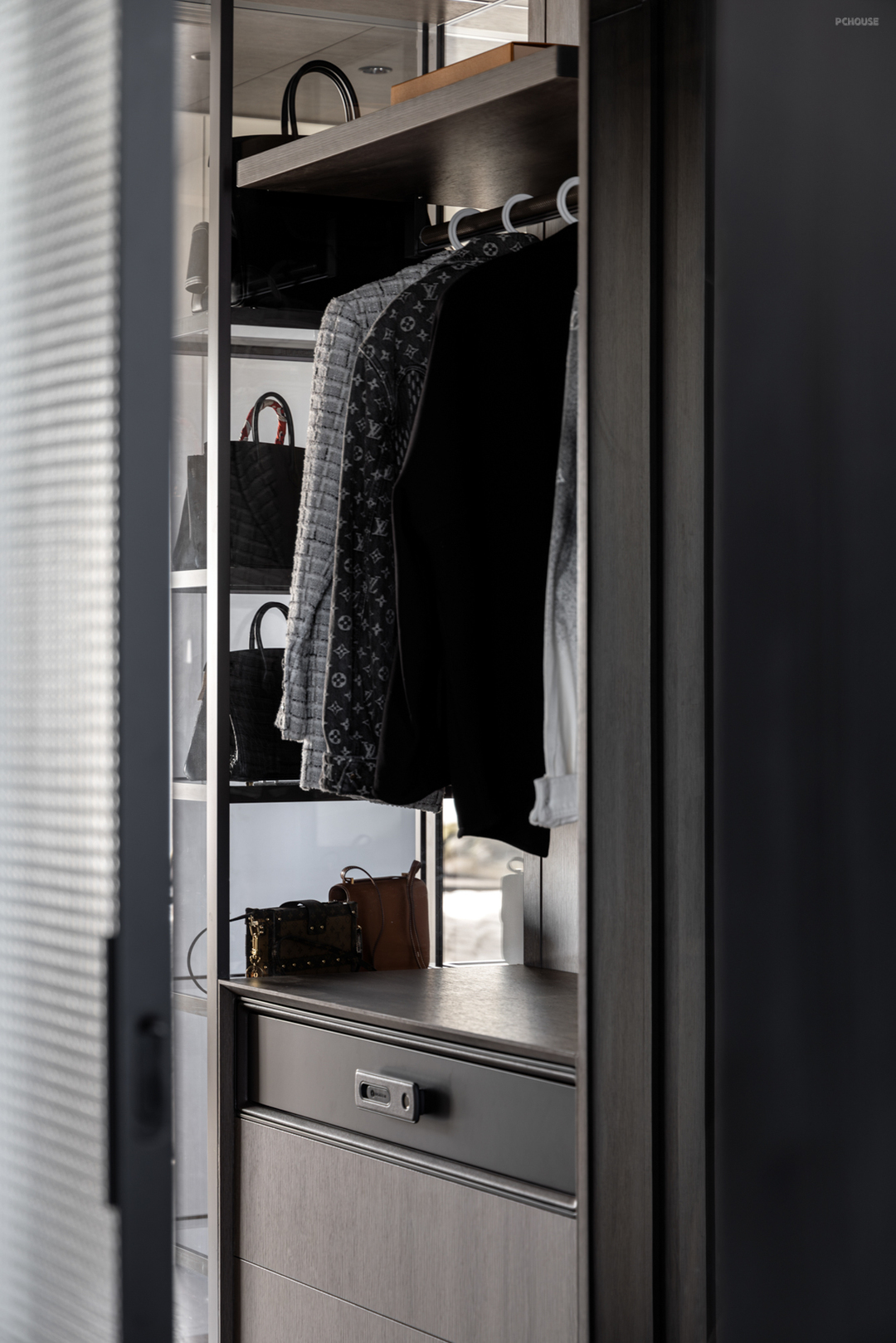 沿着套间内过道设置的衣物空间,依然考虑展示与拿取的便捷性。