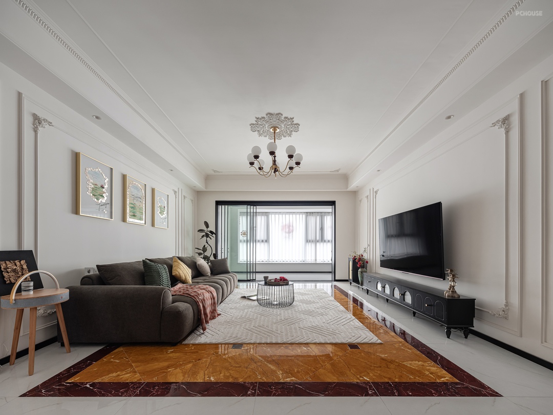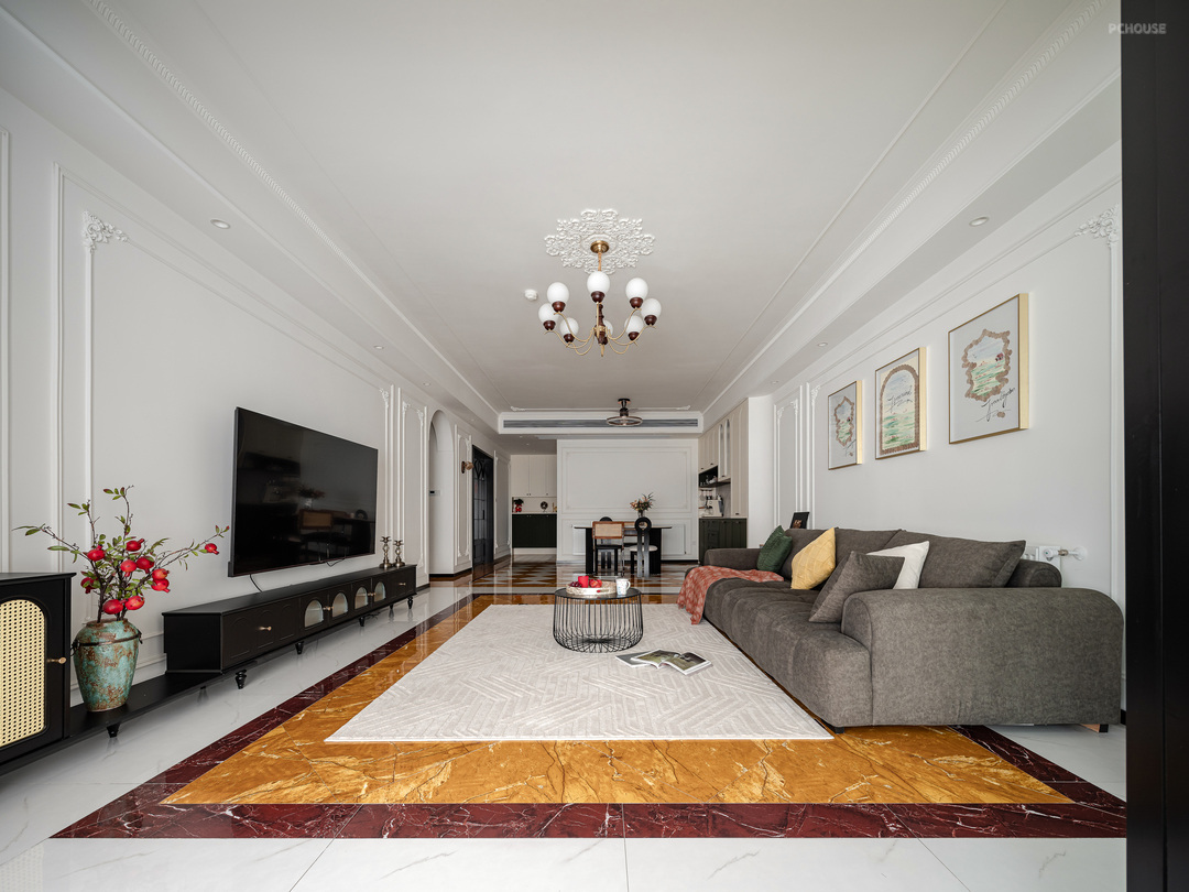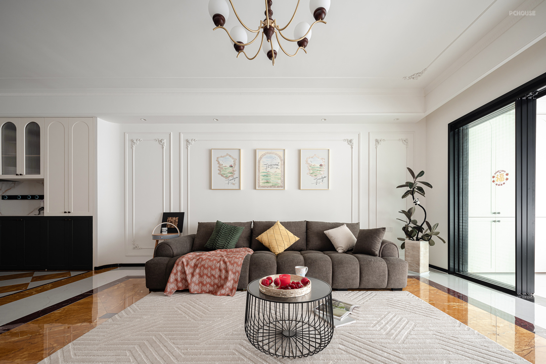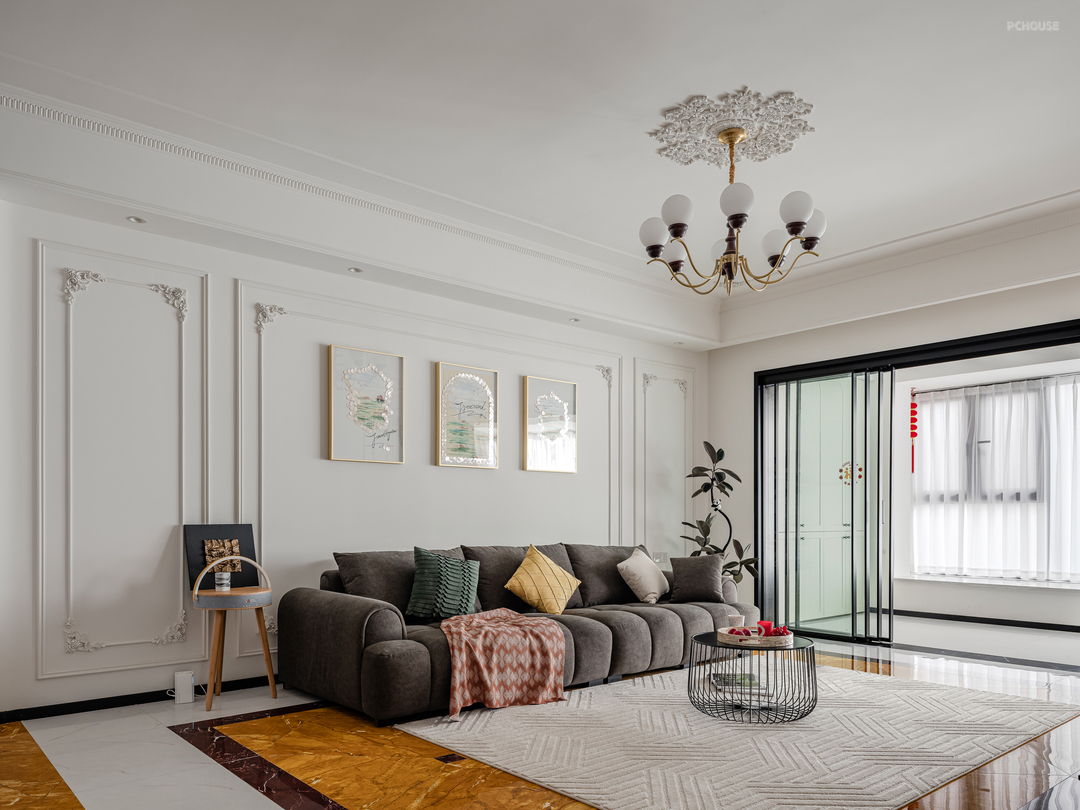 客厅墙面均用对称的法式PU线条做装饰,低成本打造浪漫法式风,让整个空间开又自由。
