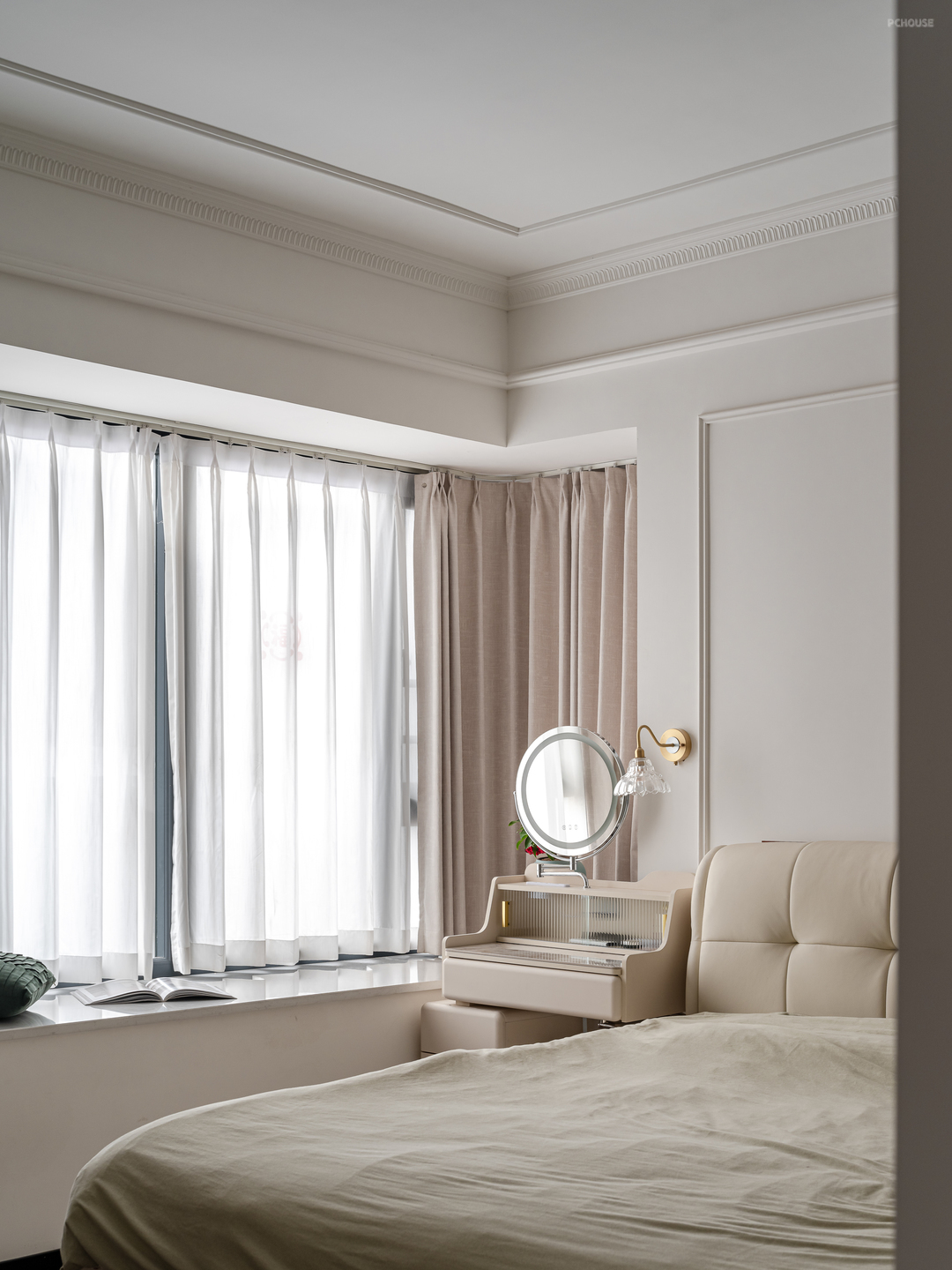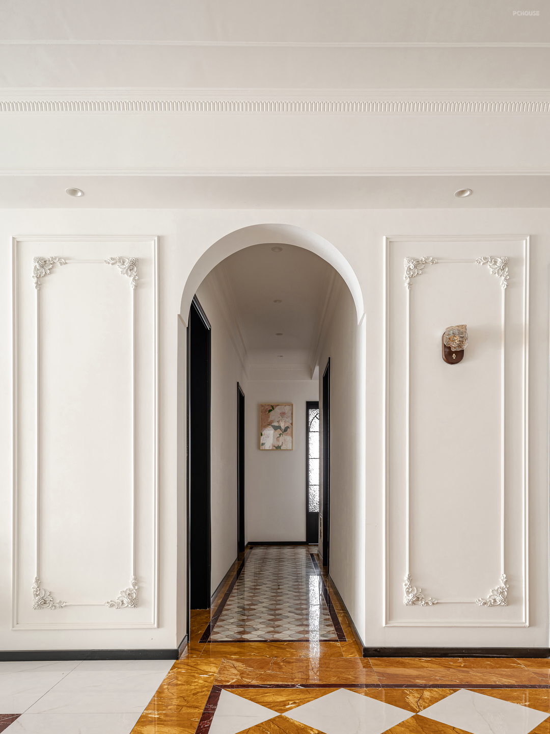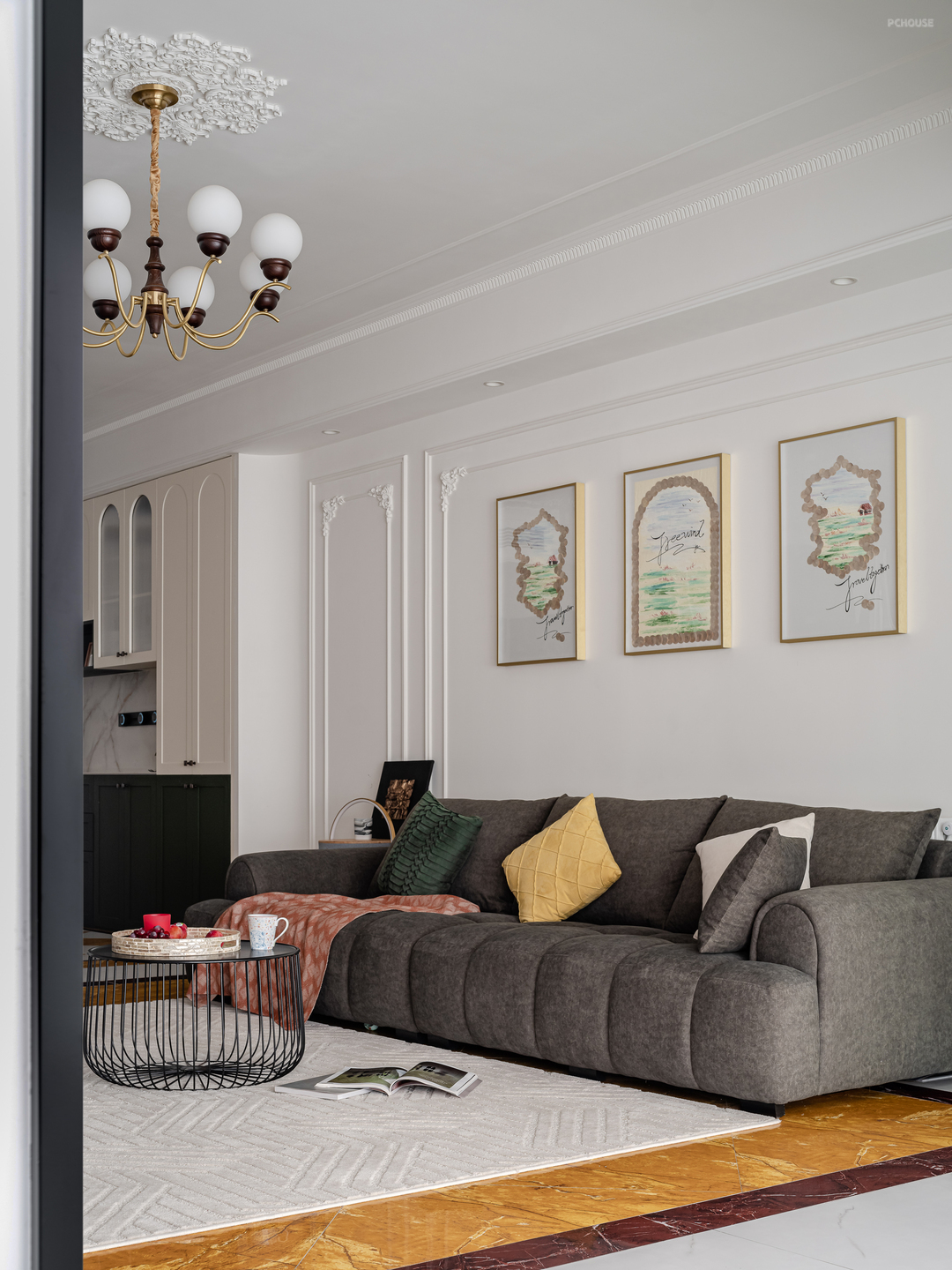 客厅墙面均用对称的法式PU线条做装饰,低成本打造浪漫法式风,让整个空间开又自由。