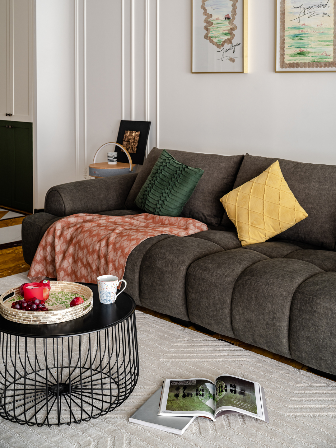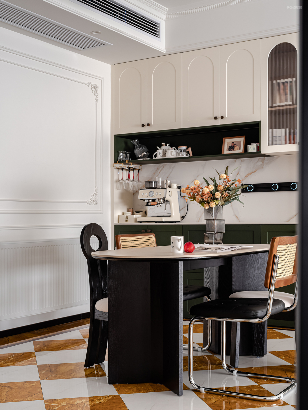 餐桌旁做了组到顶的餐边柜,配色和鞋柜一样,墨绿加白色,沉稳又不失清爽。开放格放置了咖啡机,红酒杯,茶杯。。。悠闲时,和三两好友或家人,聊聊天,品品茶