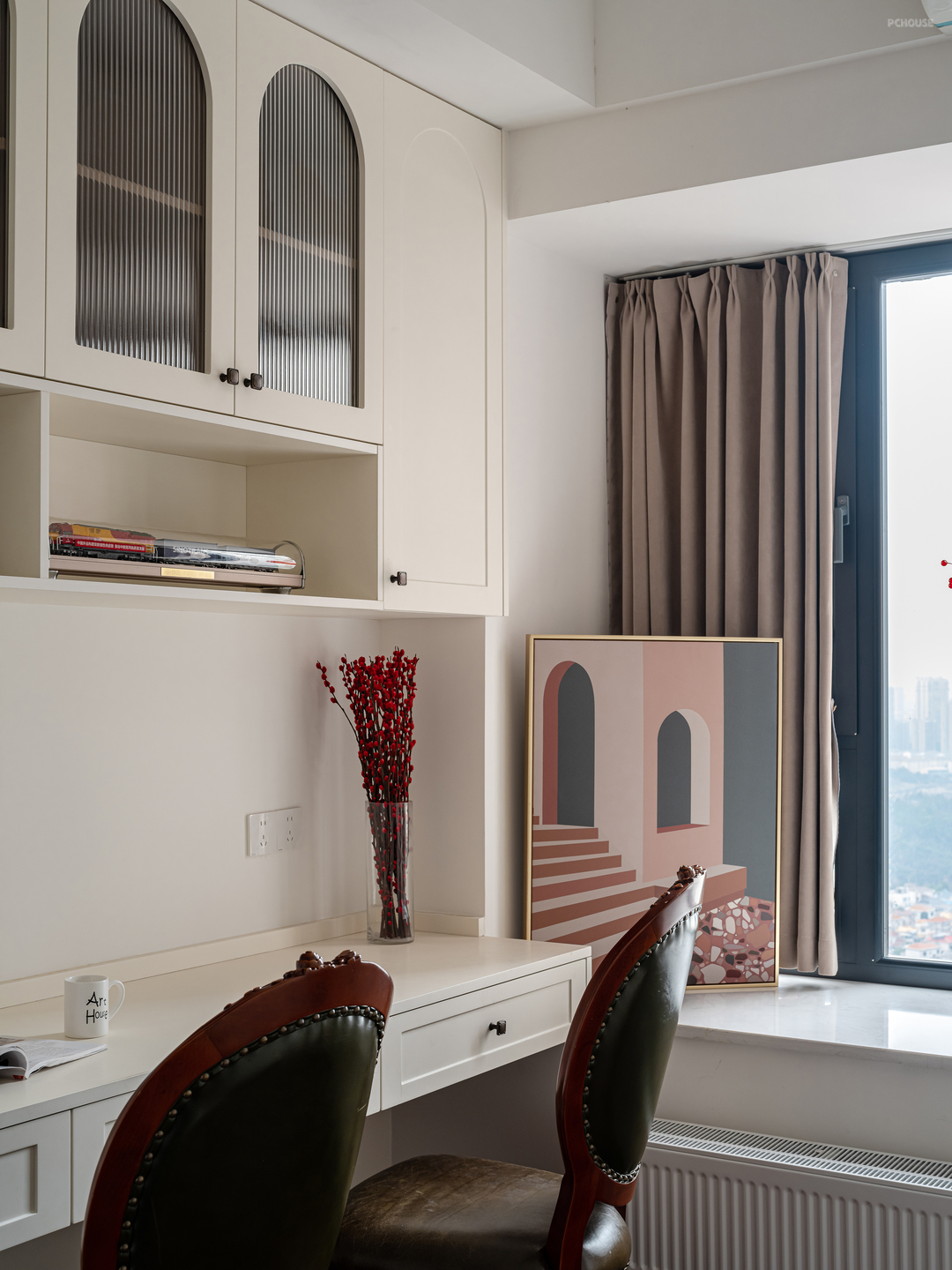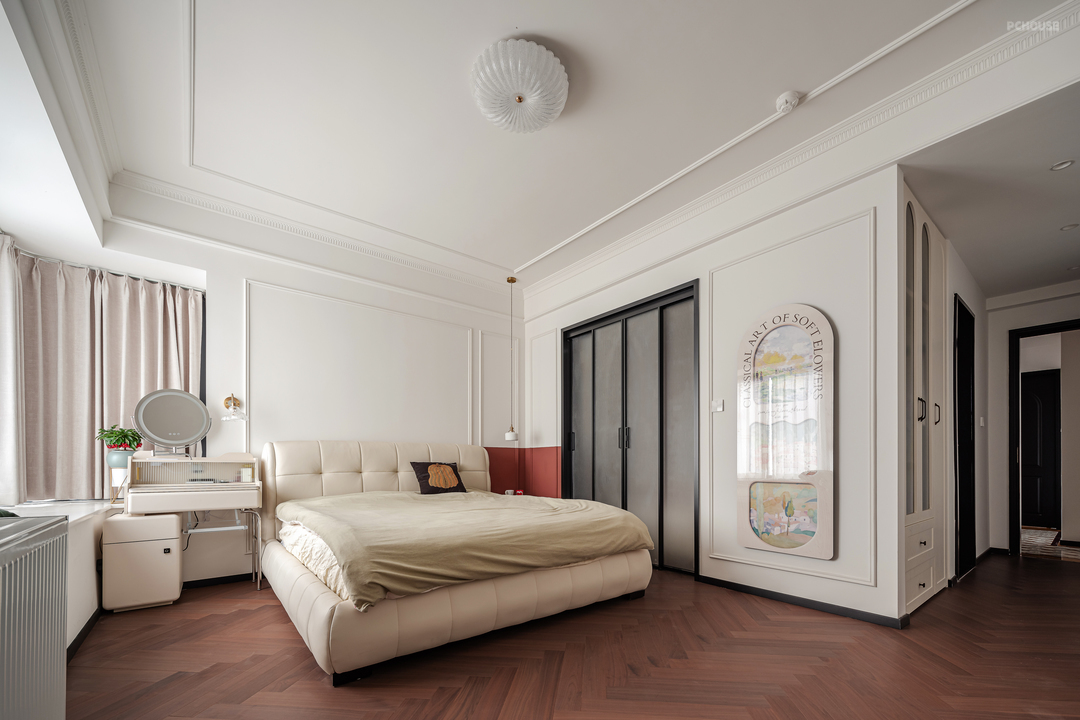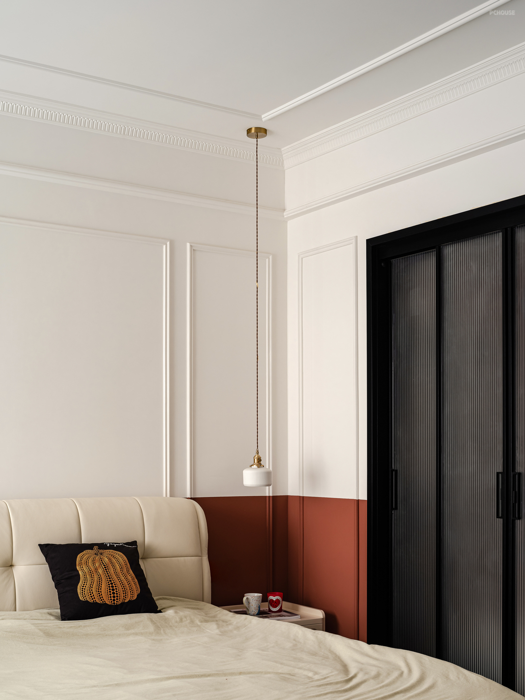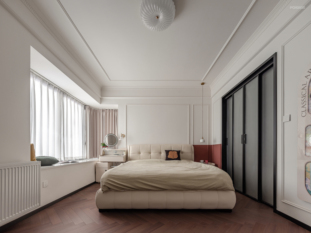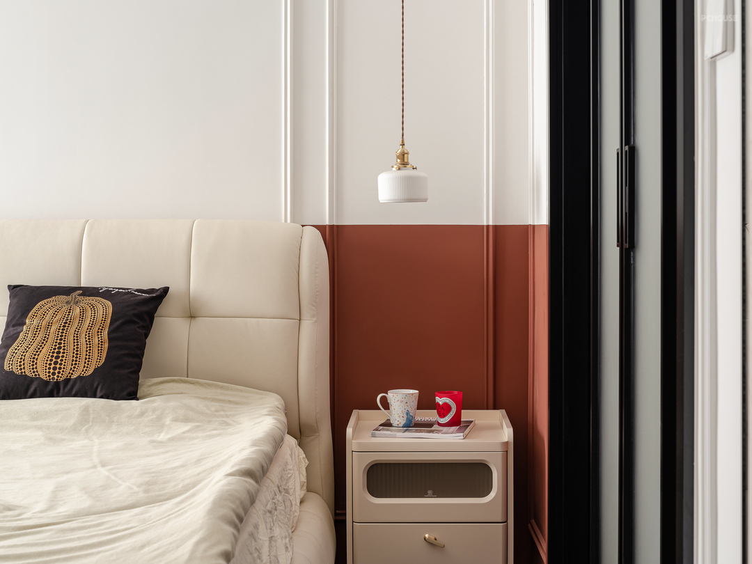 主卧床头背景用PU线做装饰,加砖红色的半墙墙漆配黑色的衣帽间玻璃门,打造出了热情奔放的氛围,又能体现出沉稳内敛的气质,整个空间营造出一种独特的风格,兼具时尚与经典。