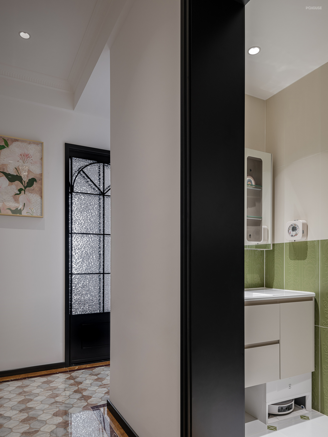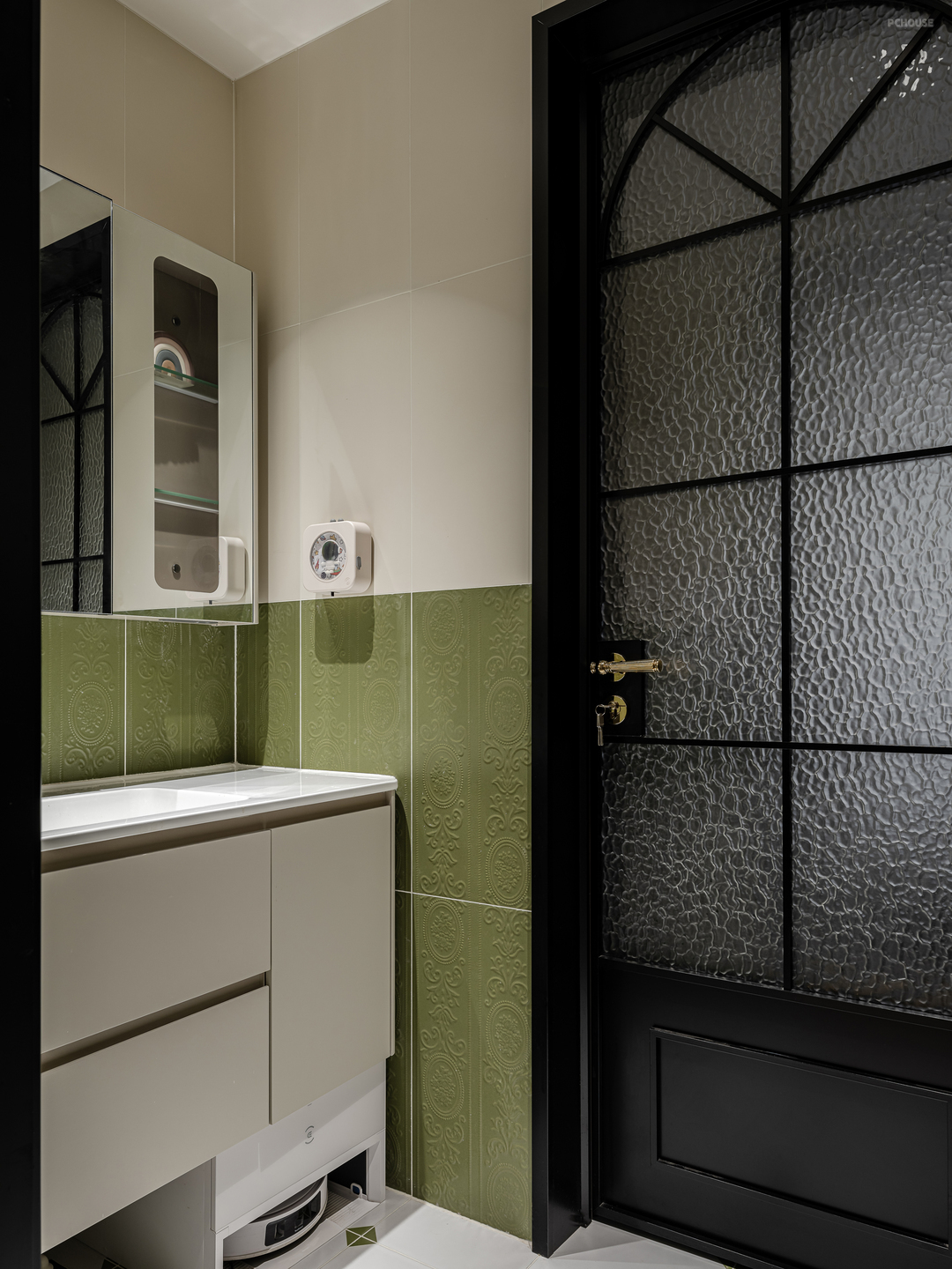 次卫生间墙面选择了复古绿的花纹瓷砖,上半部分搭配干净的白色,经典又耐看。地面是同色系的小花砖,自然又复古的氛围感一下就有了。卫生间门做的是黑色复古铝合金门,配上金色拉手,又增添了份精致感。