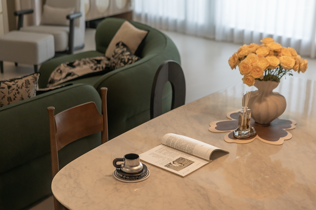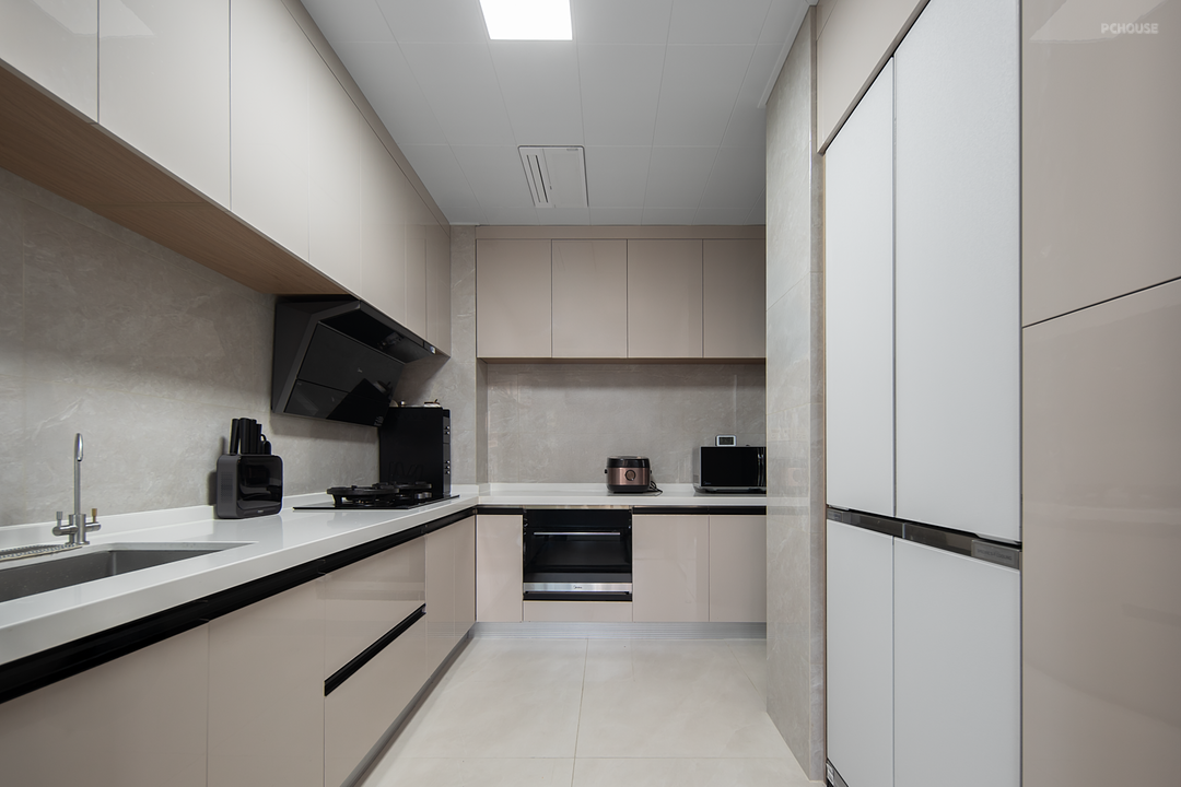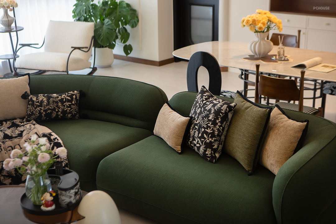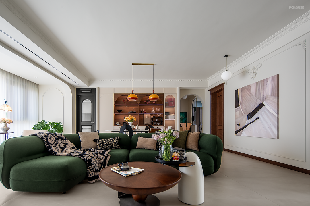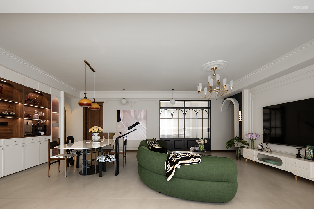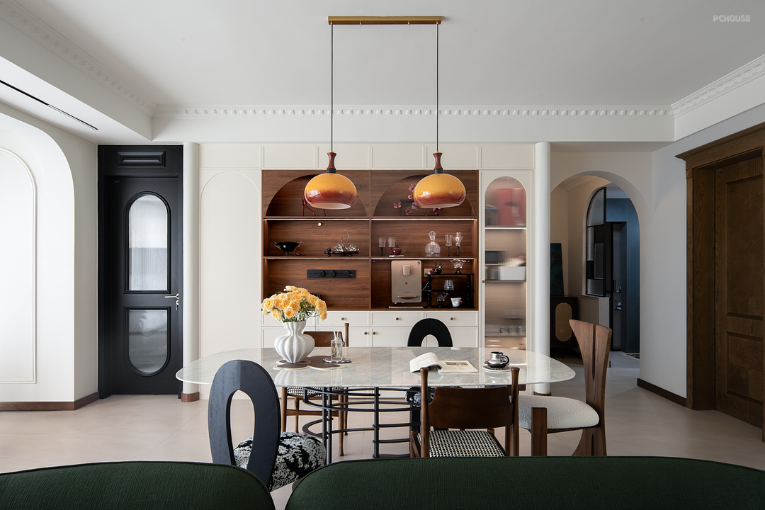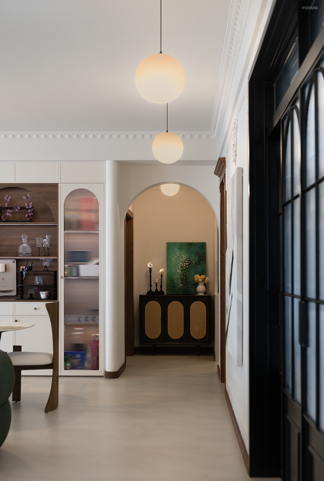 厨房门做了大胆的黑色用来跳色,餐边柜左右虚实结合,中间穿插跳色,右边过道也做了弧形造型。从左到右各种元素和造型均做了呼应对称布局,乱中有序,序中有异。