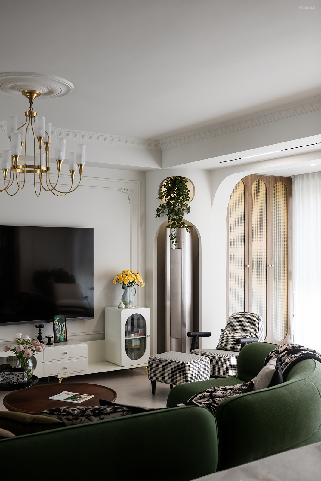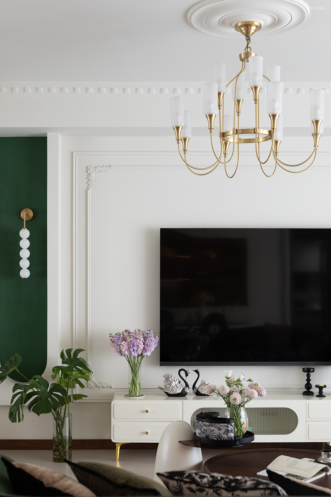 电视墙采用线条和弧形造型相呼应,搭配金色吊灯。