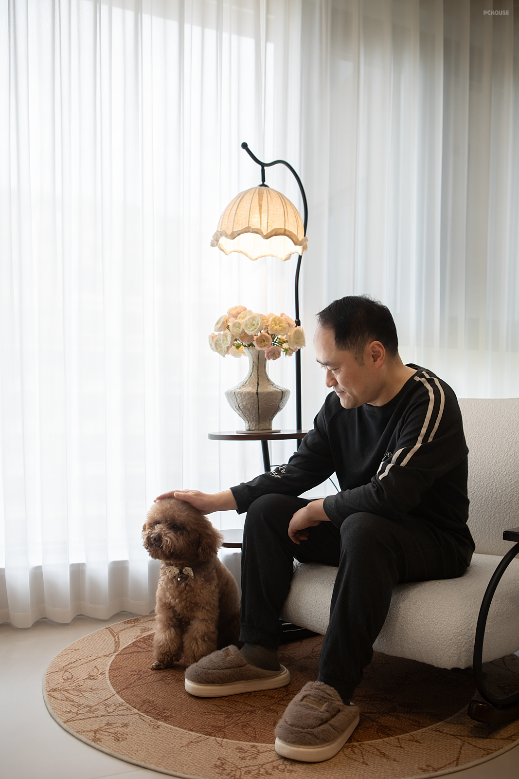男屋主与爱犬,阳台的垫子成了爱犬最喜欢的地方,一个躺椅,一个落地灯,倚窗眺望,半躺夏眠,四季皆是景。