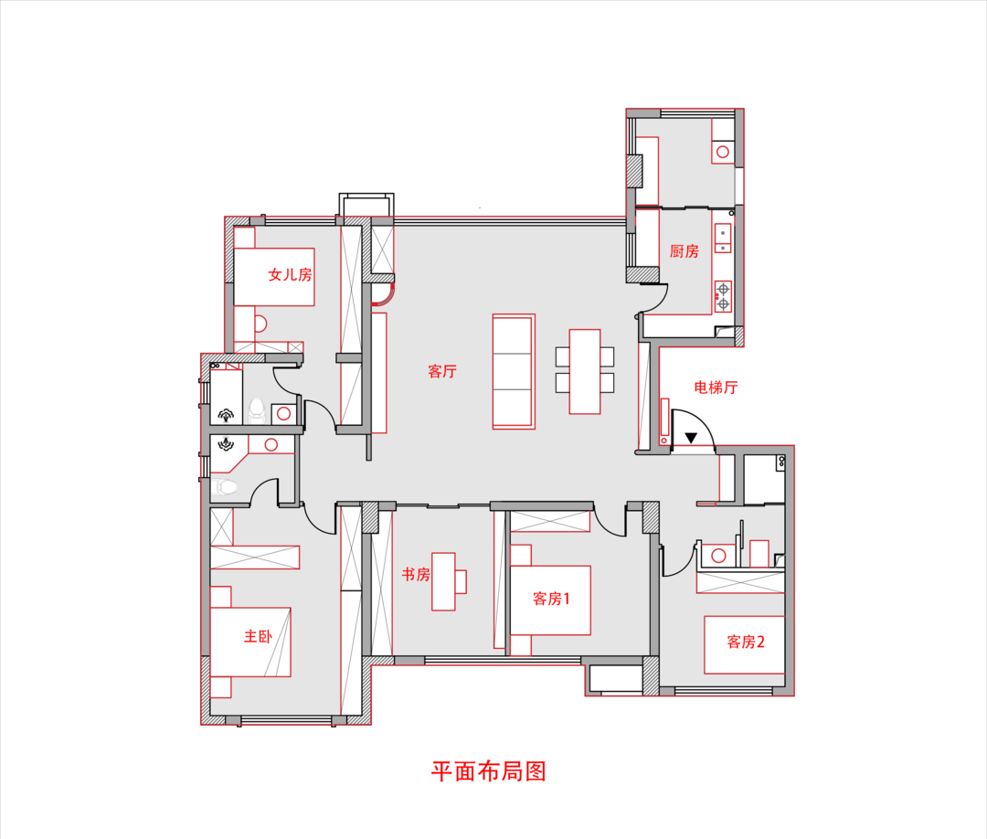 把一个大的房间一分为二,一半用作书房,一半用作客房。其他布局如图所示,主卧室和女儿房尽量做多的衣柜,增加书桌。