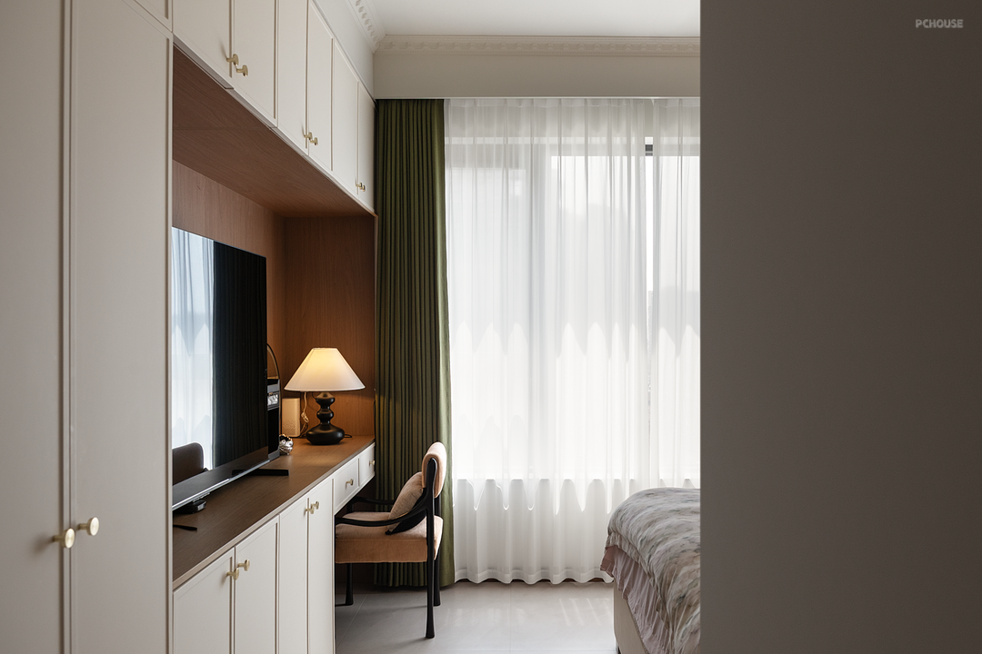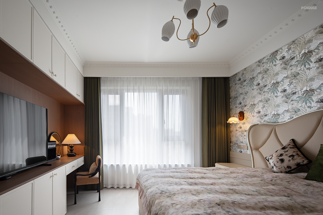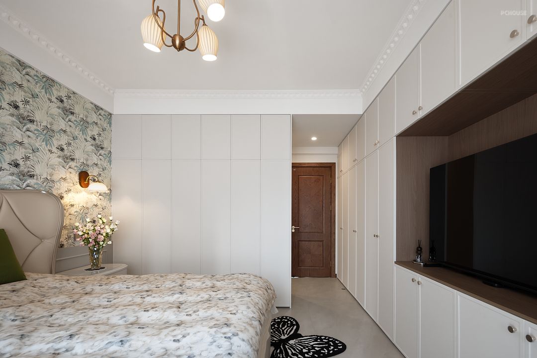 床尾一排衣柜,中间镂空放电视和梳妆台,收纳充足,没有满墙衣柜的压迫感。
