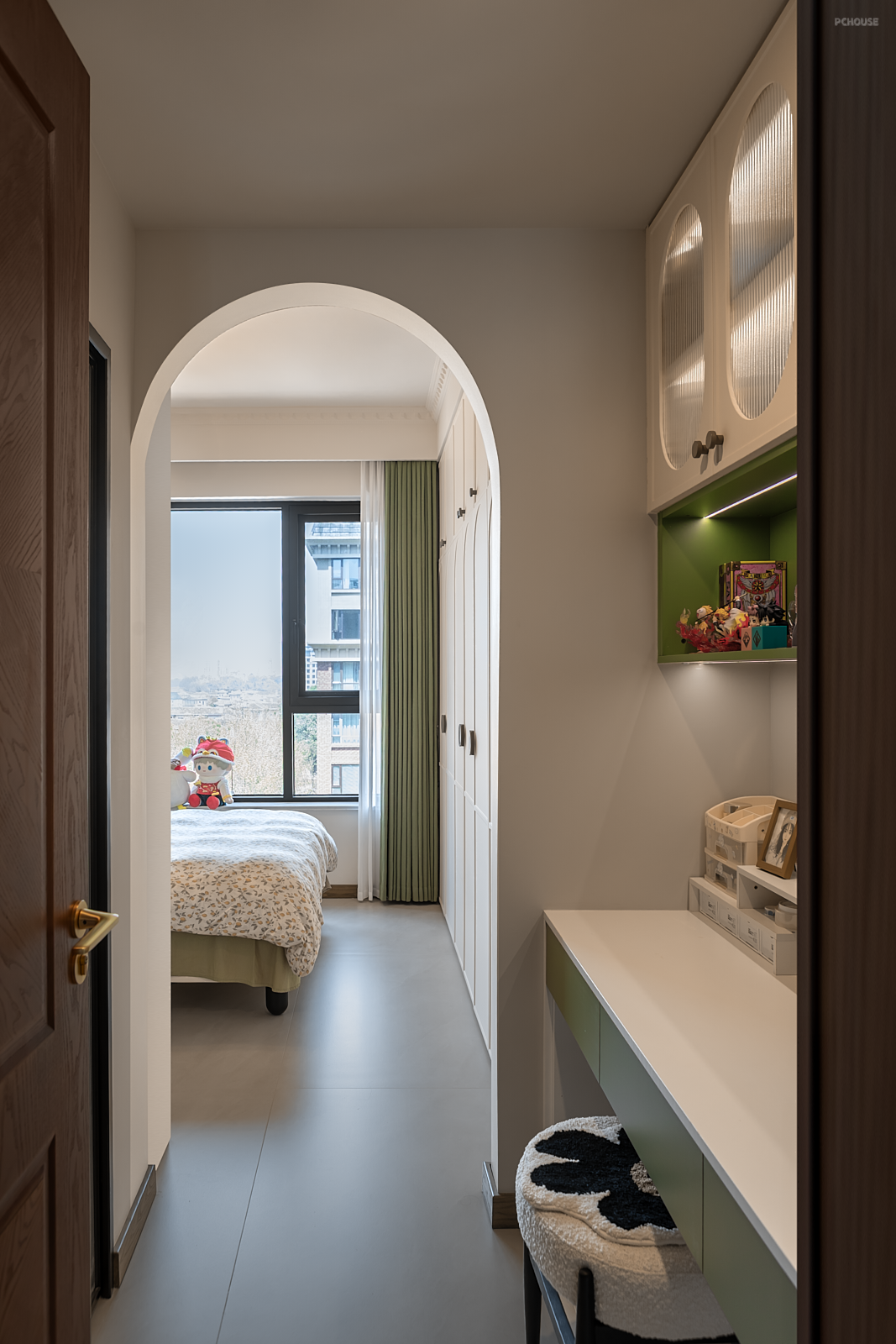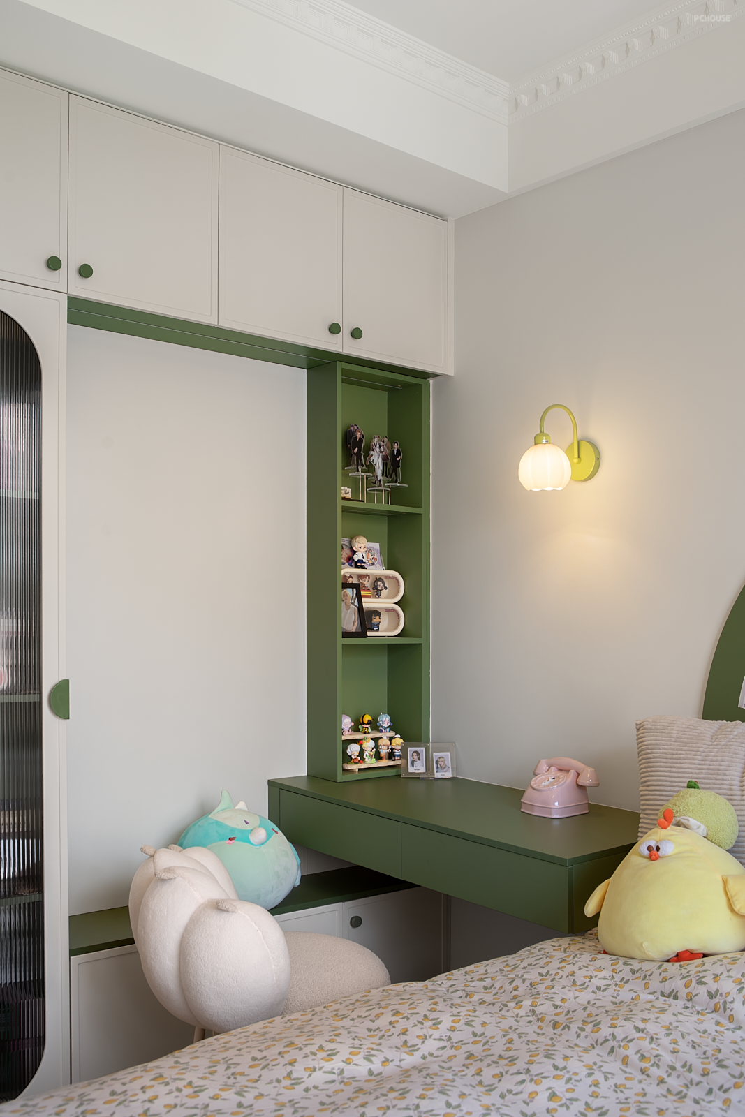 女儿房床头一侧做了书柜、卡座和一个书桌,平时和闺蜜在房间里沟通、聊天也是很确幸的事情。