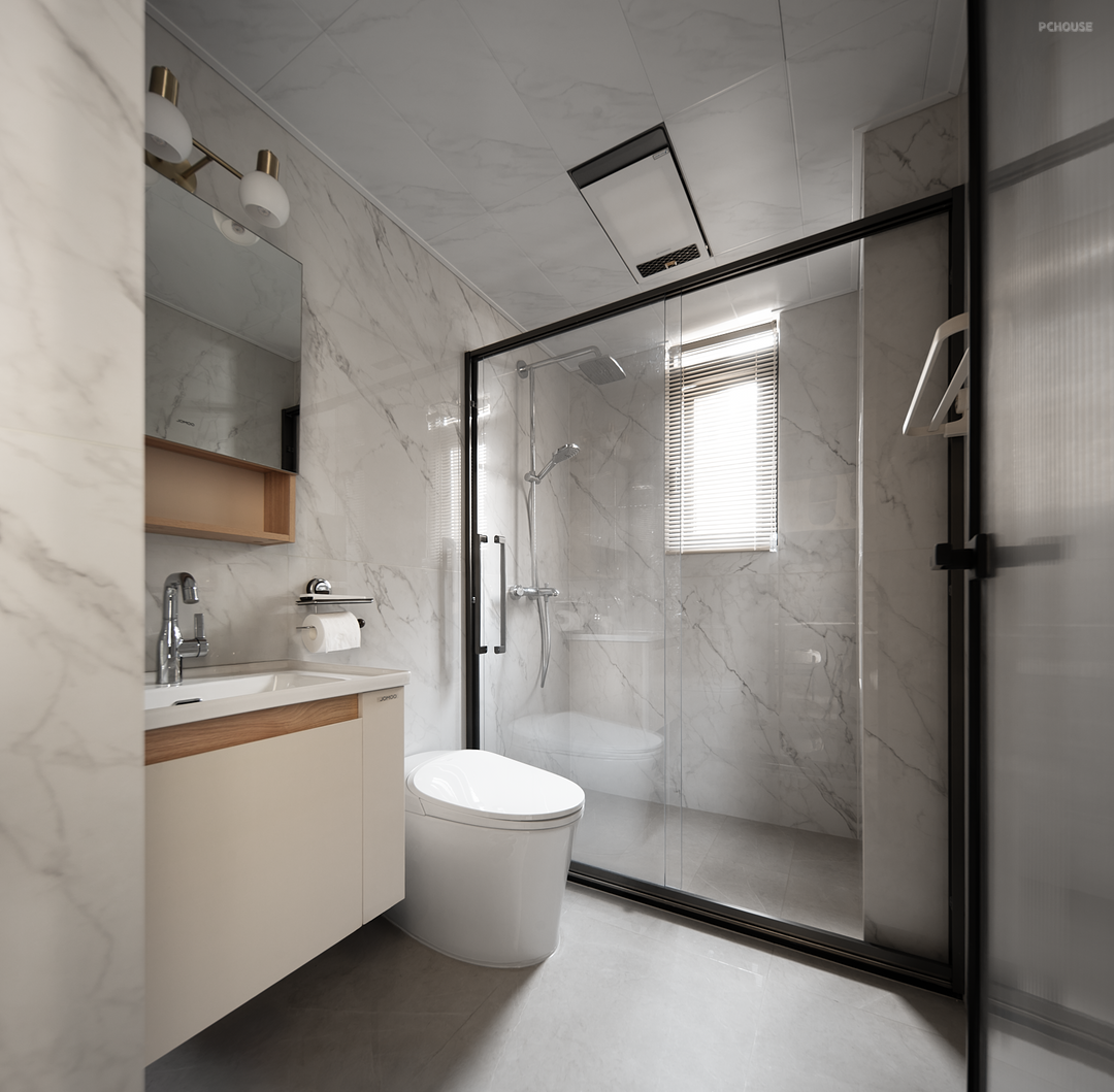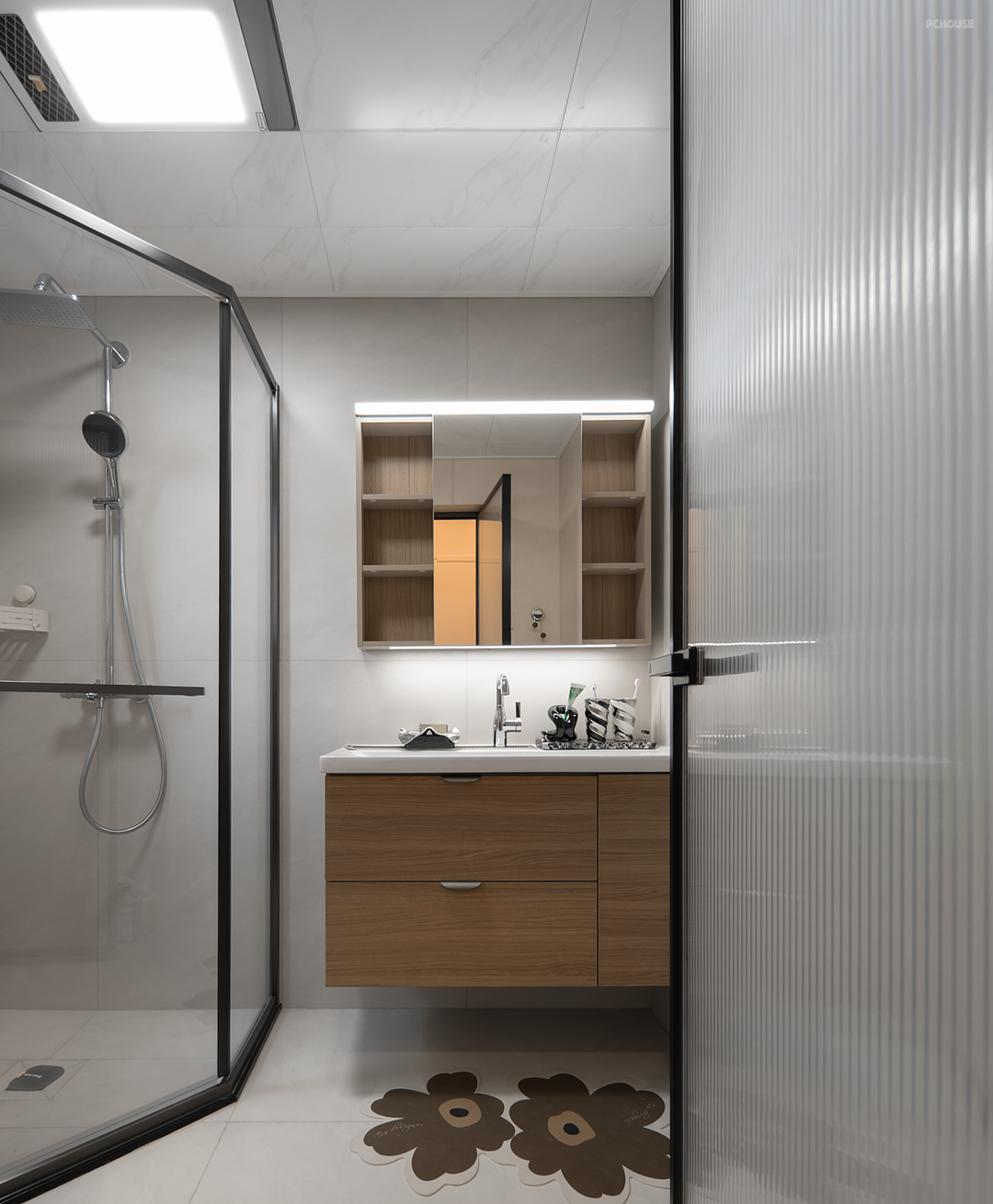 主卧室另一侧为卫生间,用衣柜做隔墙,增加储物又阻挡卫生间门直冲床。