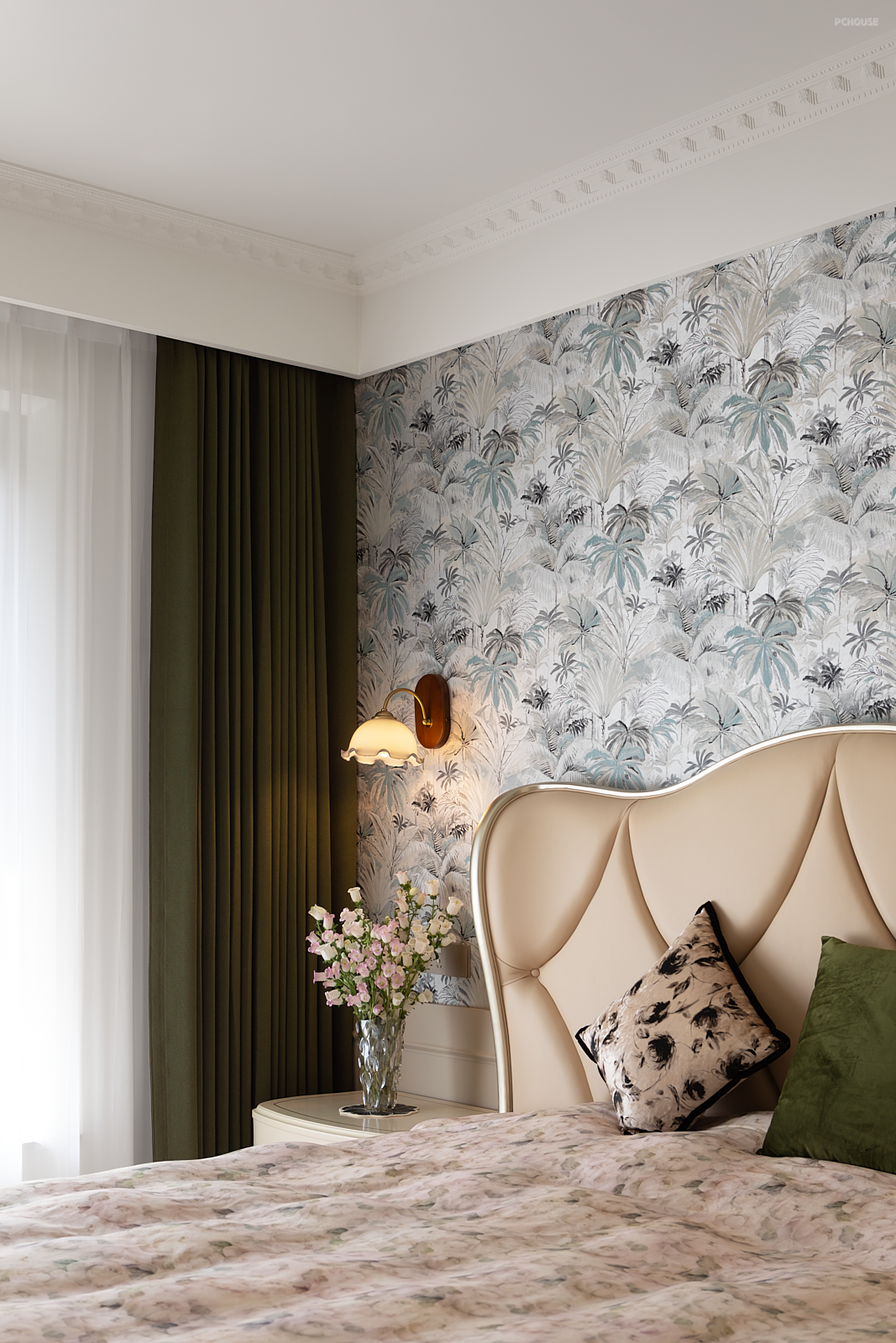 主卧室床头做了壁纸和壁灯,下半部分还有护墙板,整体色调深中浅相搭配。