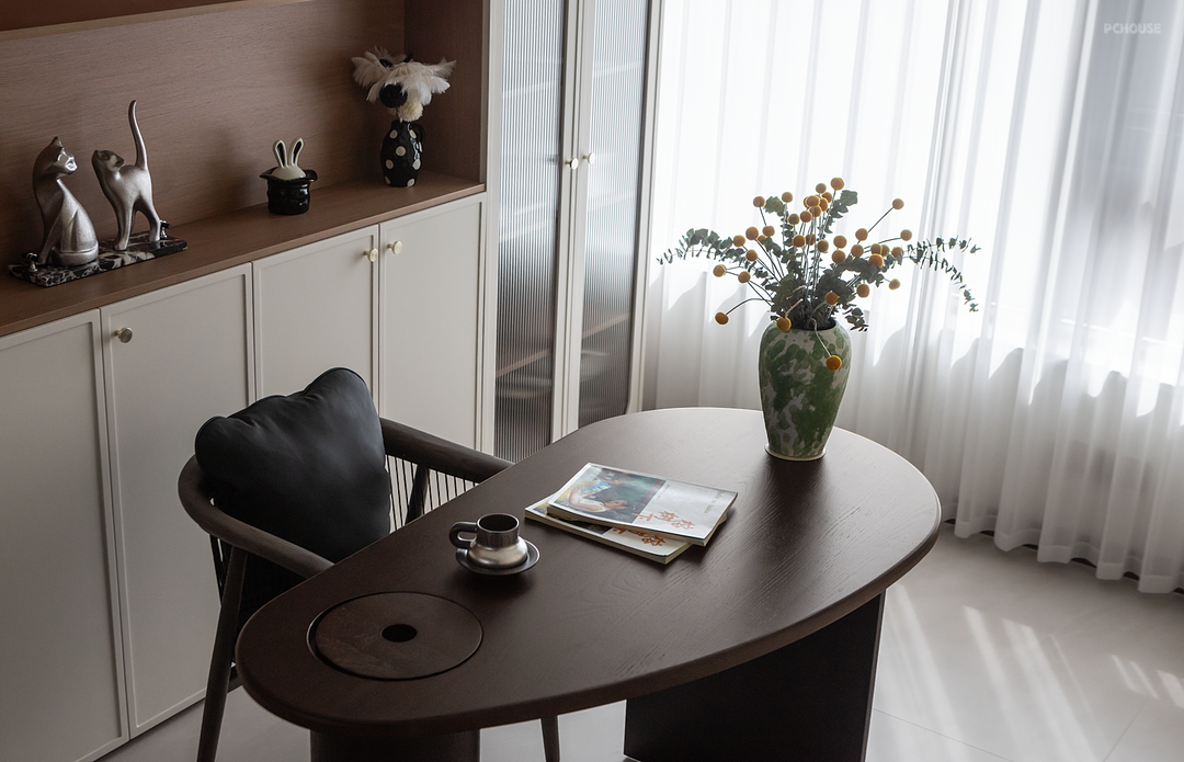 书房为男屋主的空间,书房两侧做了书柜和收纳柜,中间的书桌是男屋主平时看书喝茶的地方。