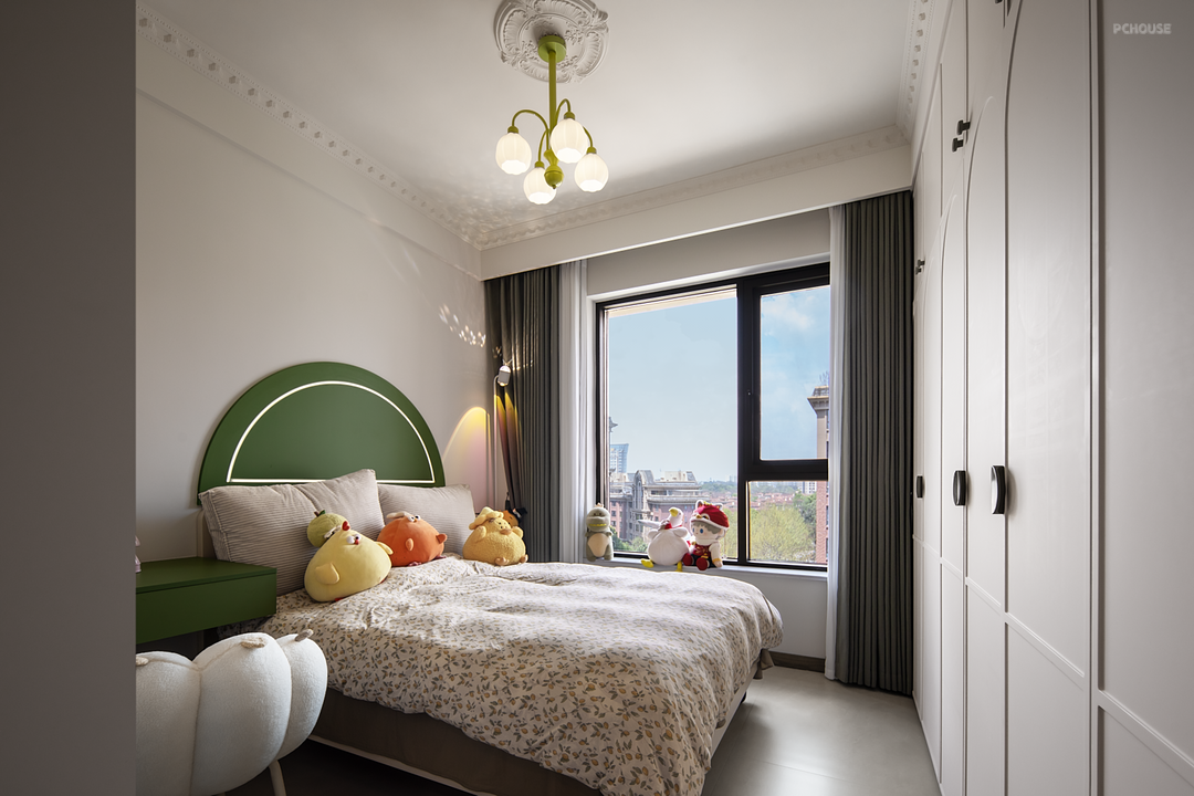 床尾一排收纳衣柜,床头做了一个拱形的造型嵌入发光灯带,墨绿色的配色让空间活泼有趣。