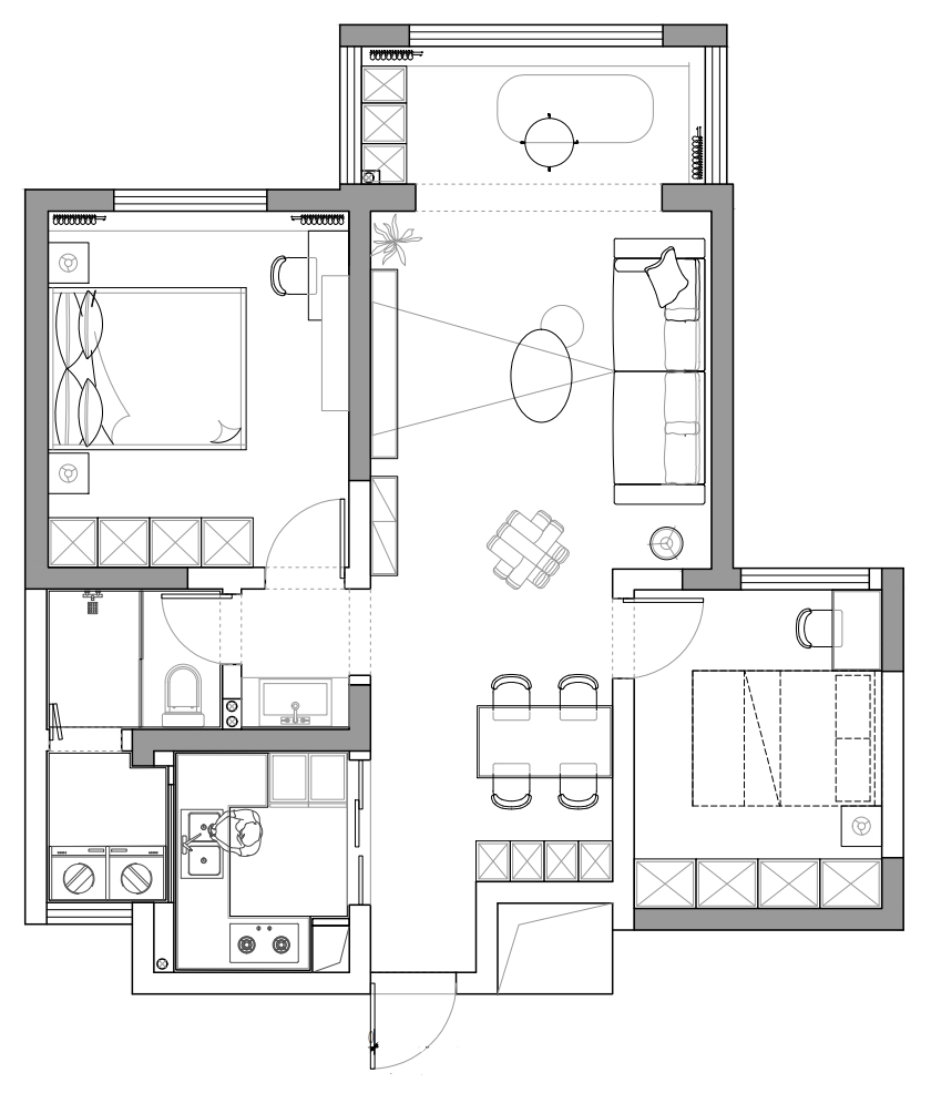 前言: 业主是位单身小姐姐,原始户型是两居室,动线也较合理,所以在平面布局这块没做太多改动,主要是把功能和储物做全,侧重点放在软装和配饰上。