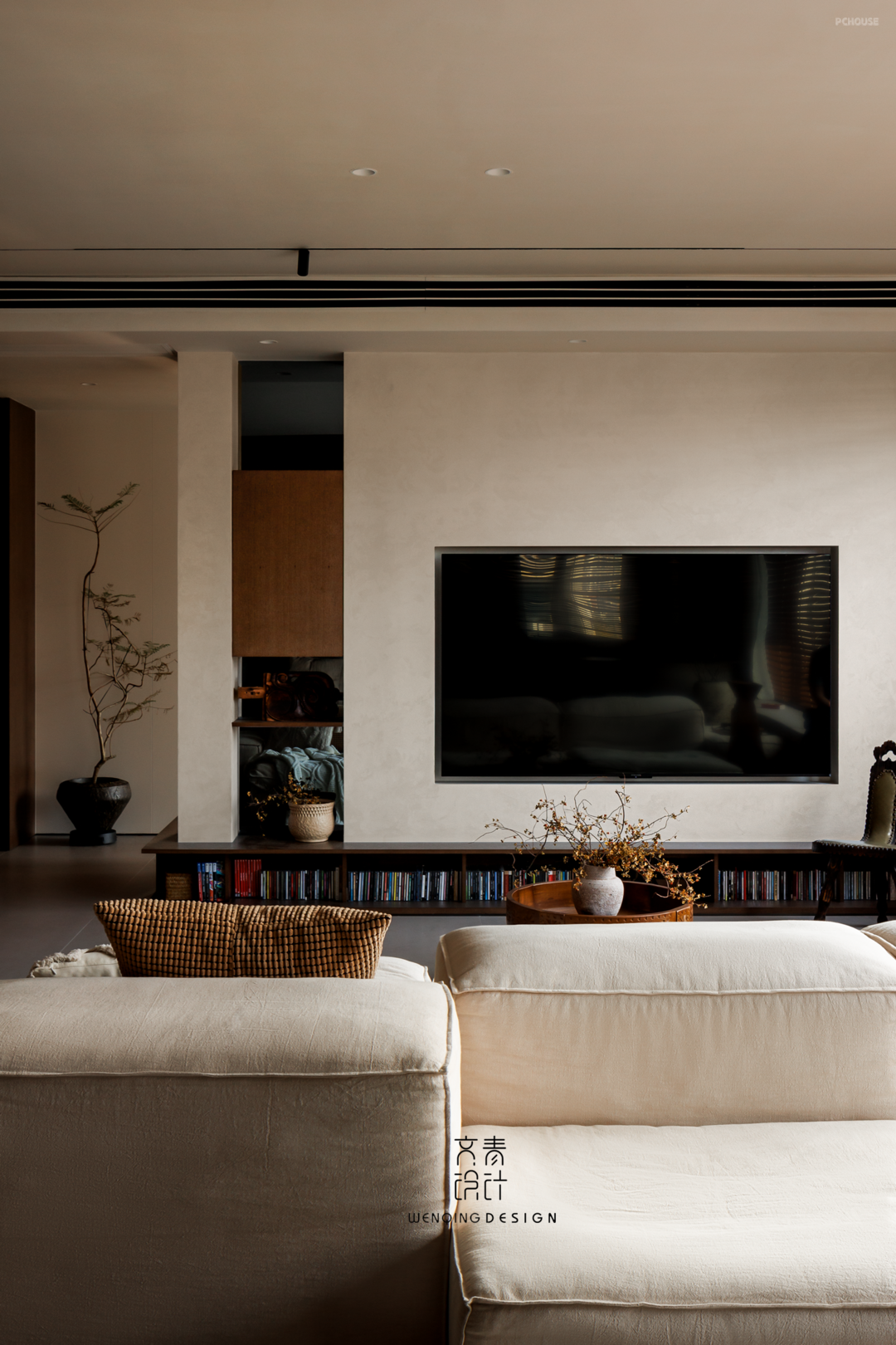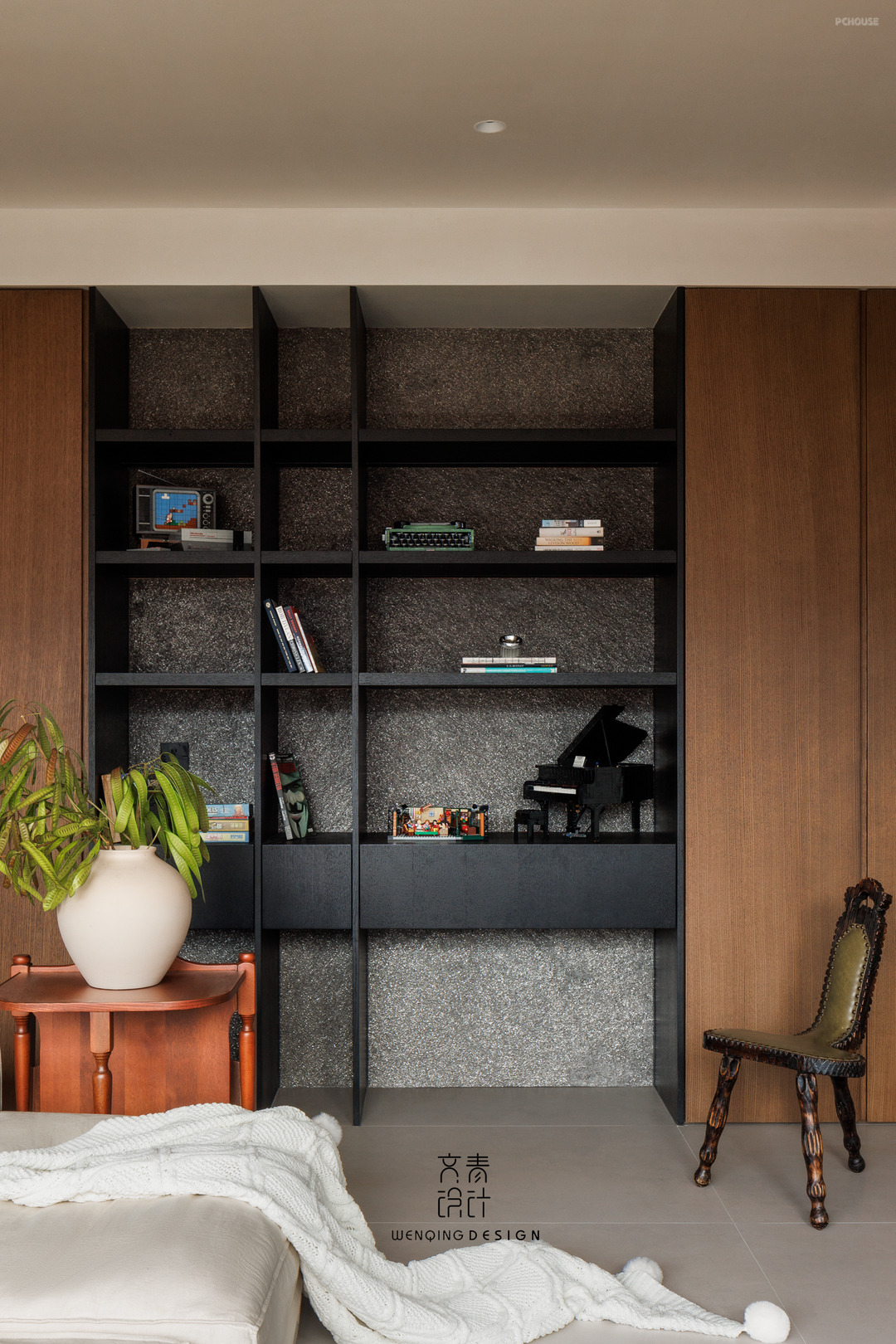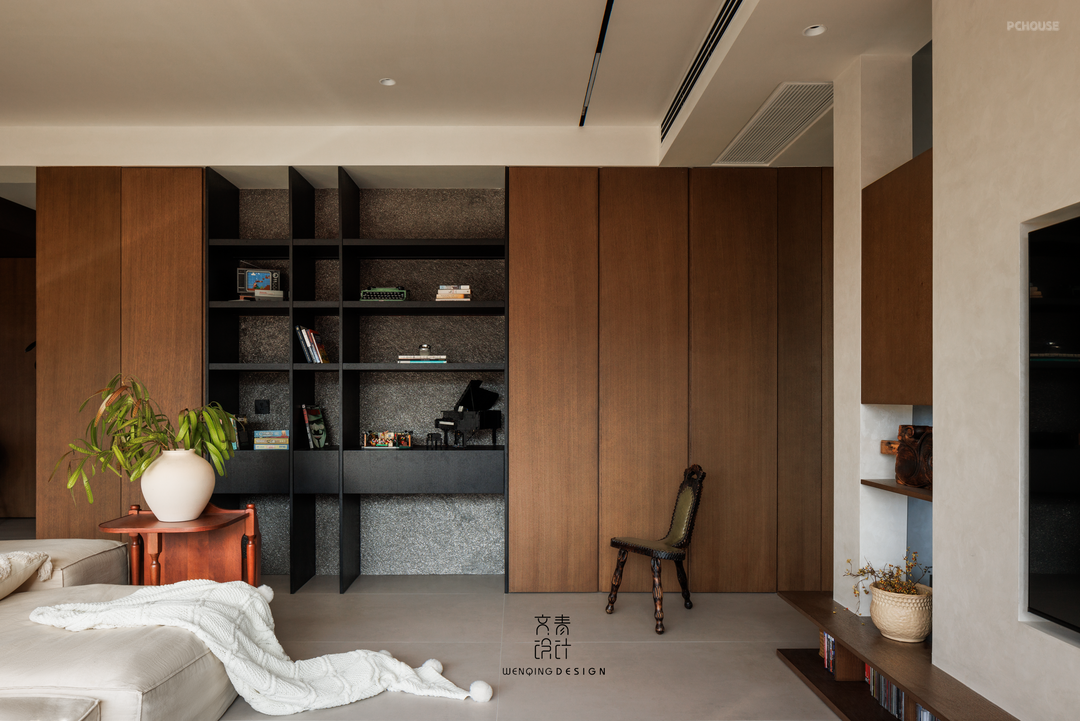 客厅储物系统采用开放式层板与隐藏柜门结合设计,兼顾模型藏品展示与生活杂物收纳需求。空间布局既保证双人同时使用的独立性,又通过可移动家具维持视觉通透感