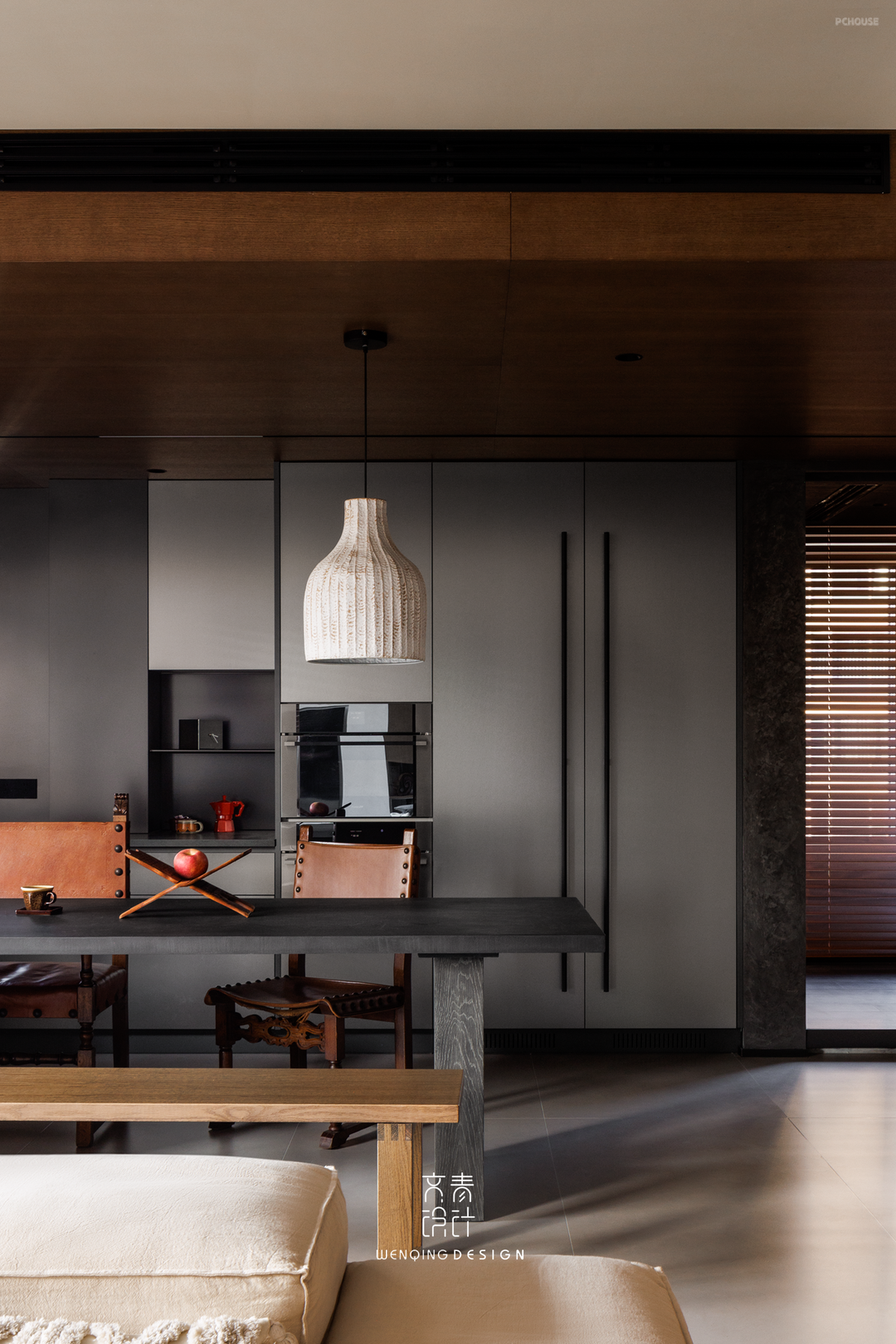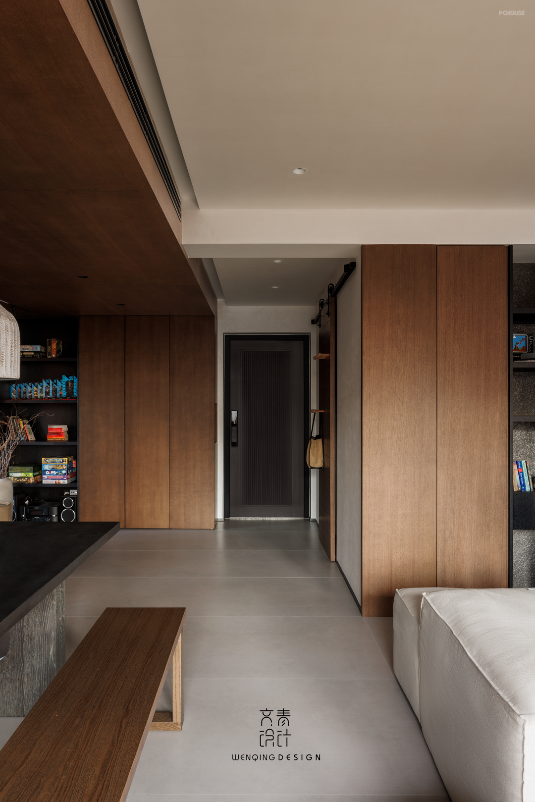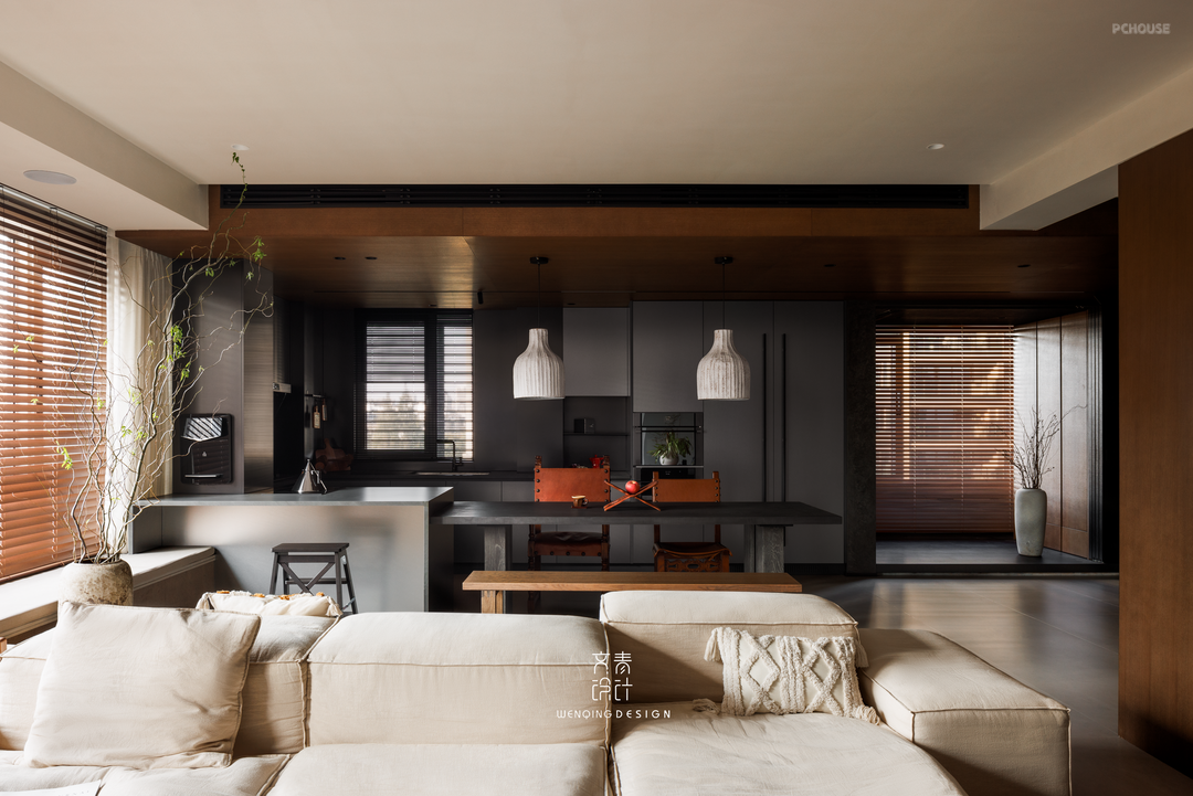 前言: 这是位于杭州的一套住宅,原始户型四室二厅格局,缺点是精装修交付,原房间数量过剩且容易空置,基于业主需求和实际情况,我们对原始结构做了局部调整,利用大横厅的通透感,客餐厅相结合的空间,拆除非承重墙体,打造客餐厨书一体化LDKB空间,通过木纹和不锈钢色营造品质感住宅。