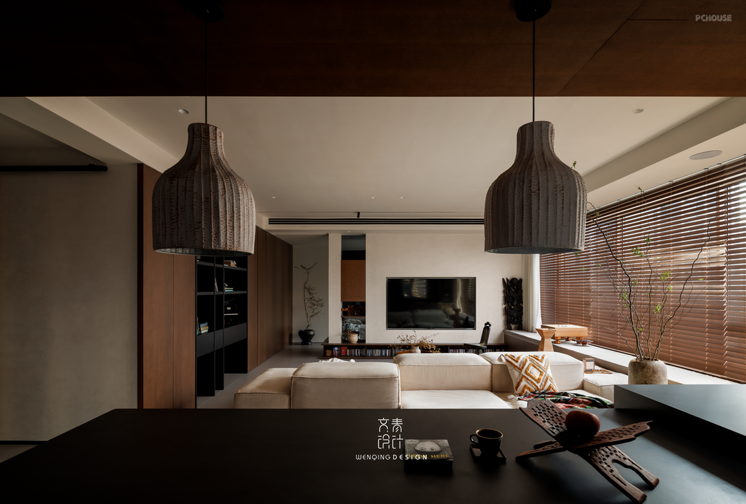 客厅与餐厅采用一体化洄游动线布局,通过双向模块沙发实现空间互动与功能分区。飘窗区域延伸为定制坐榻,搭配软垫形成休闲观景角。