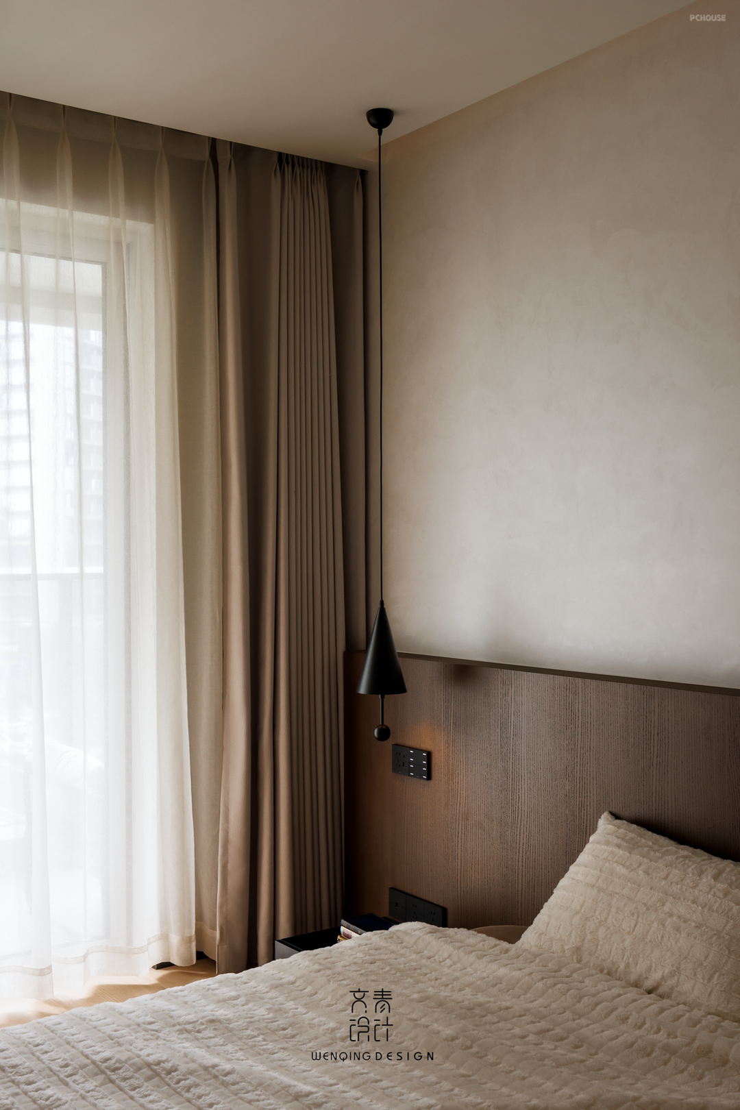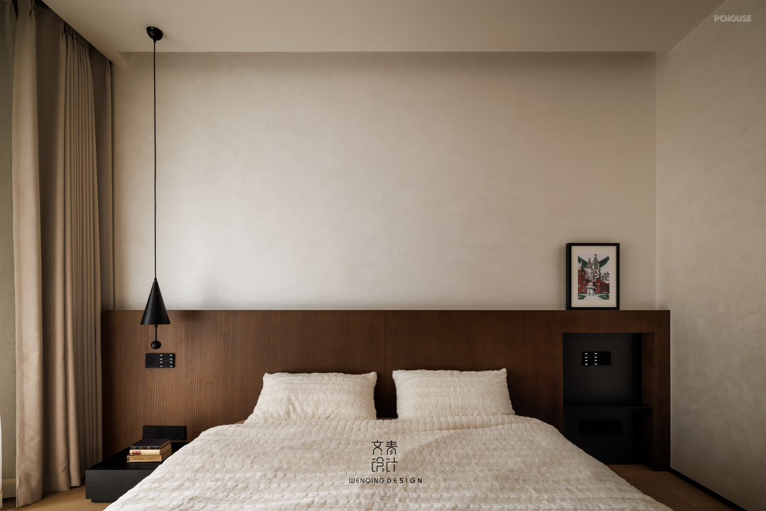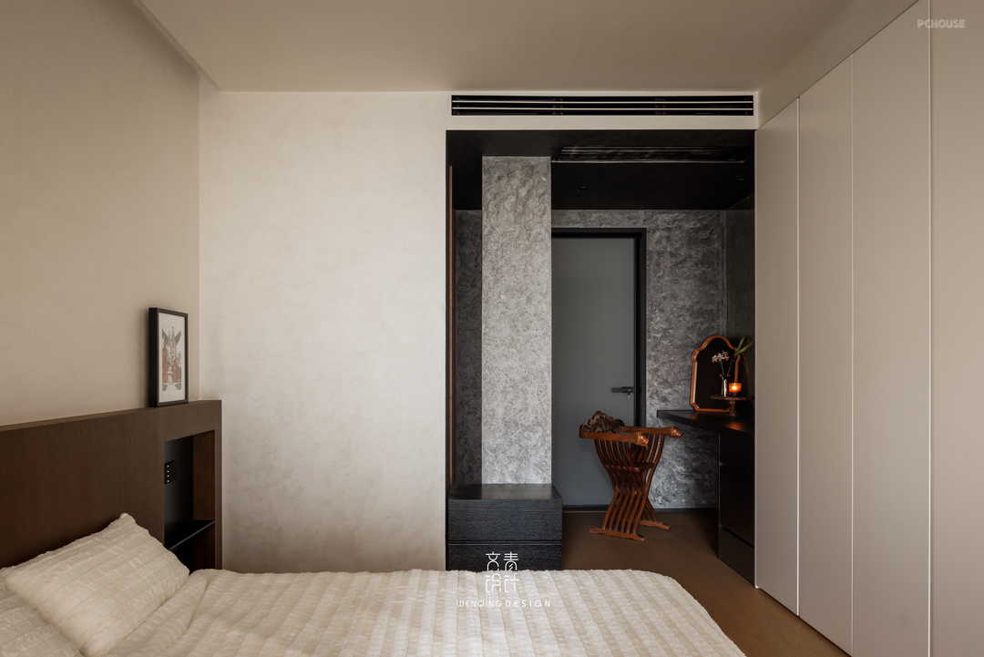 重构主卧入口动线,通过调整门洞方位形成双开门大空间,打造悬浮式梳妆台衔接步入式衣帽系统。顶面采用悬浮吊顶集成磁吸轨道灯+反光灯槽复合照明,床尾预埋电动升降投影幕布,搭配壁挂式全景声音响组,构建沉浸式卧室影音场域。功能布局实现梳妆-更衣-休憩三级分区,梳妆台墙面增加唯美手工砖铺贴,提升了场景化居住体验。